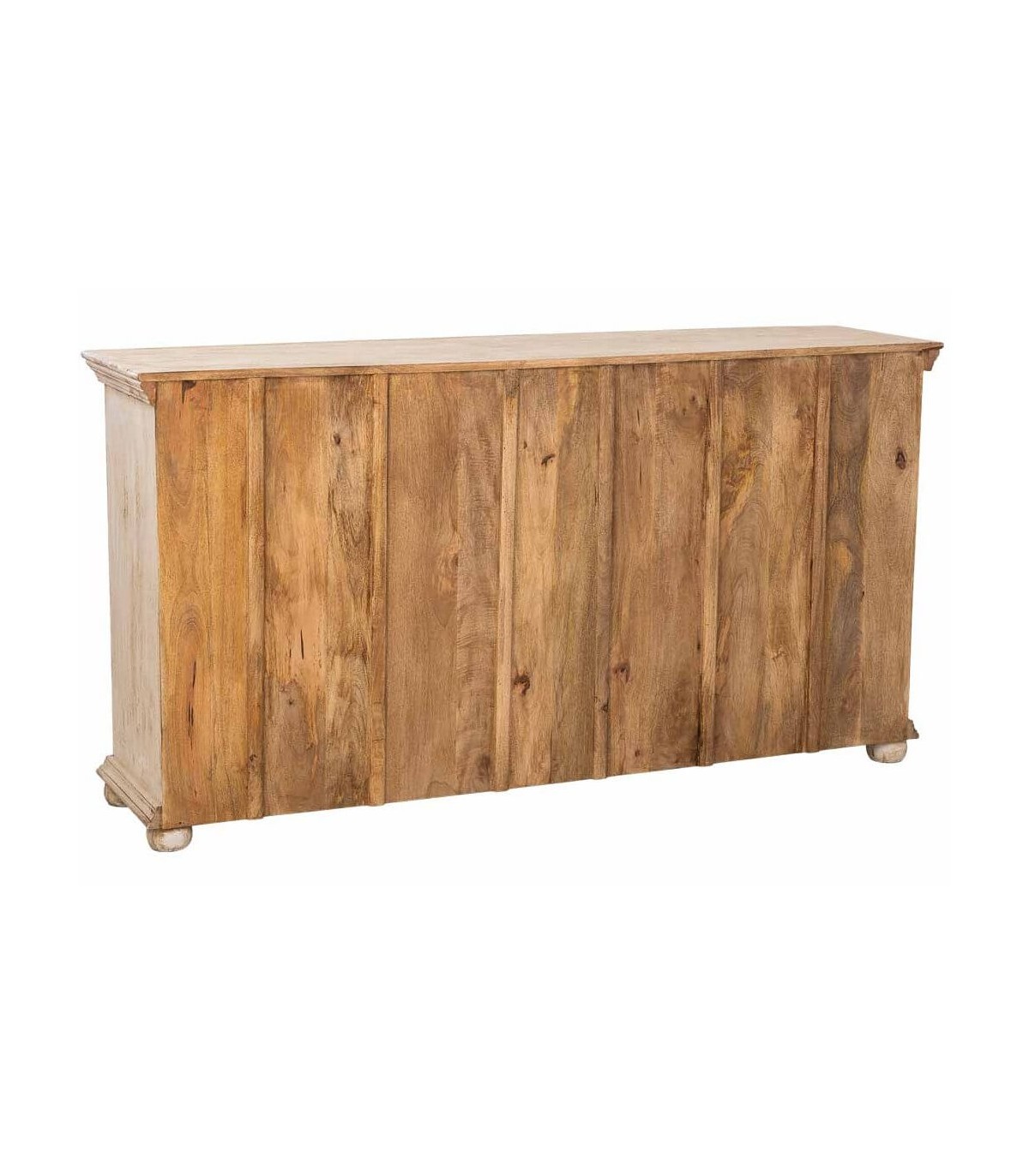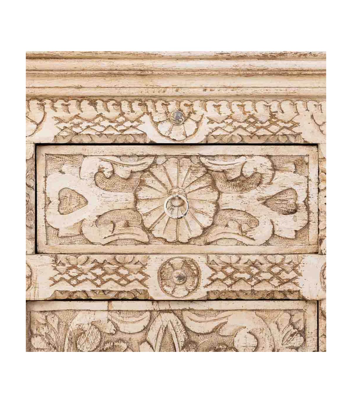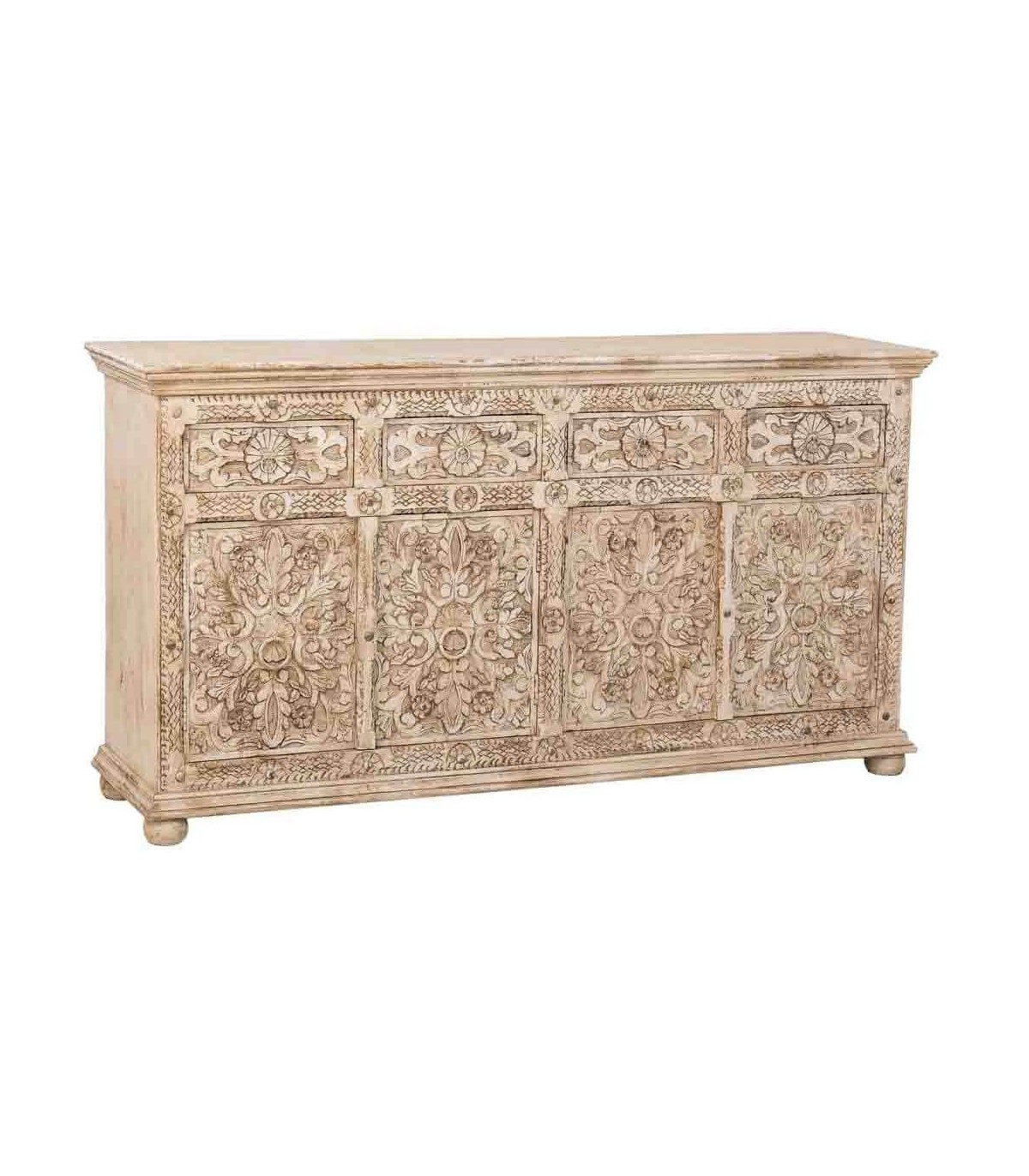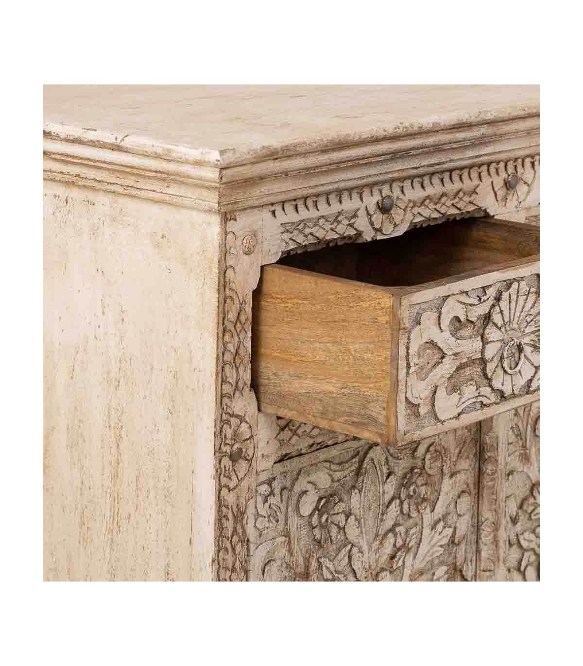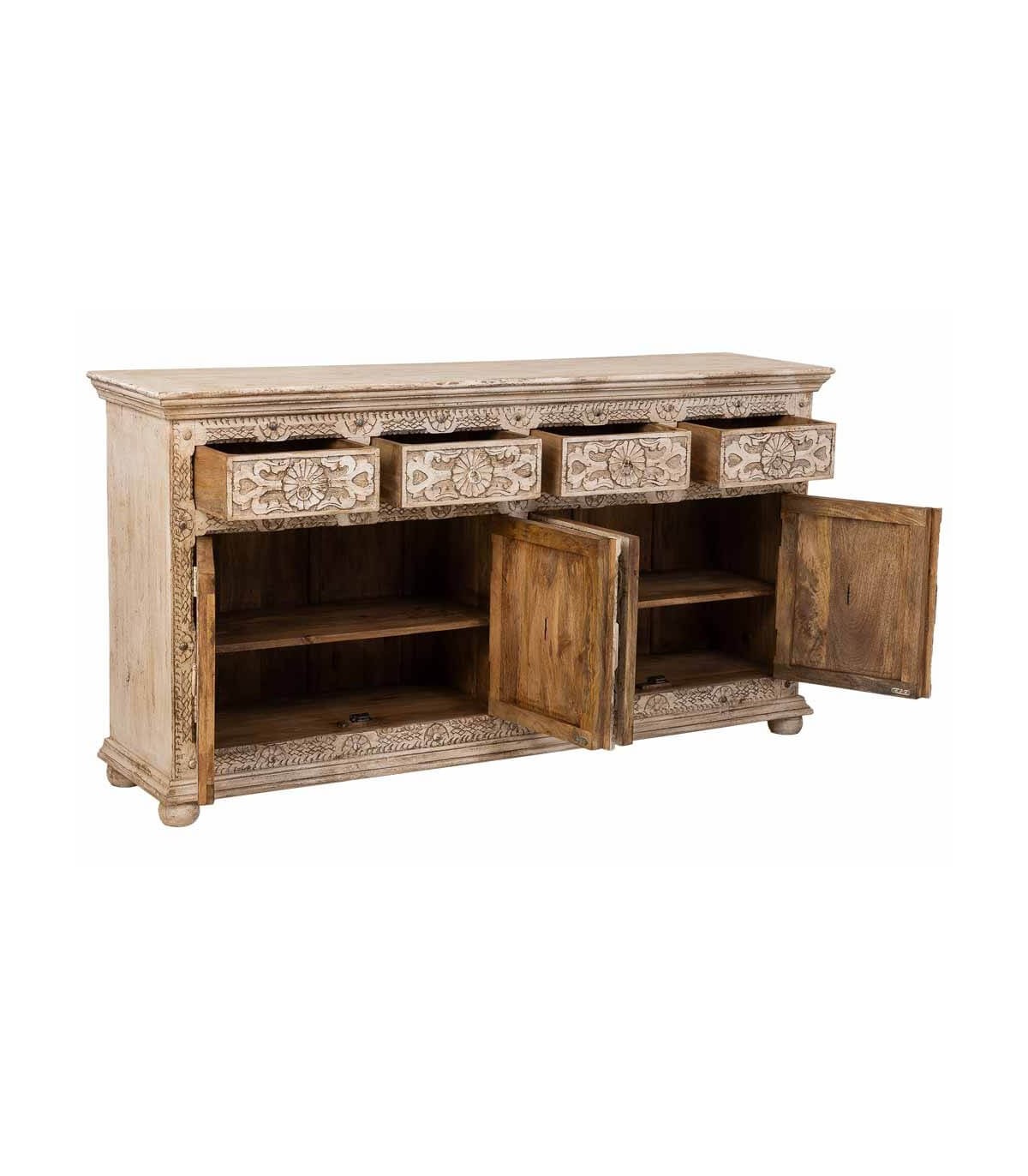 El acabado blanco roto patinado aporta textura, luminosidad y un atractivo toque envejecido que potencia su esencia étnica. Dispone de cuatro cajones y cuatro puertas con amplio espacio de almacenaje, rematados con discretos tiradores metálicos en tono natural. Una opción funcional y decorativa para quienes buscan muebles con historia y carácter escultural.