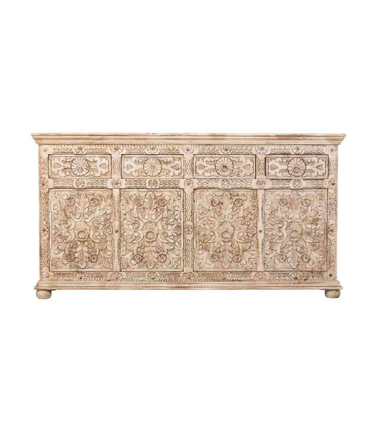 APARADOR 180 X 45 X 96 METROPOLIS MADERA TALLADA ARTESANAL BLANQUEADA