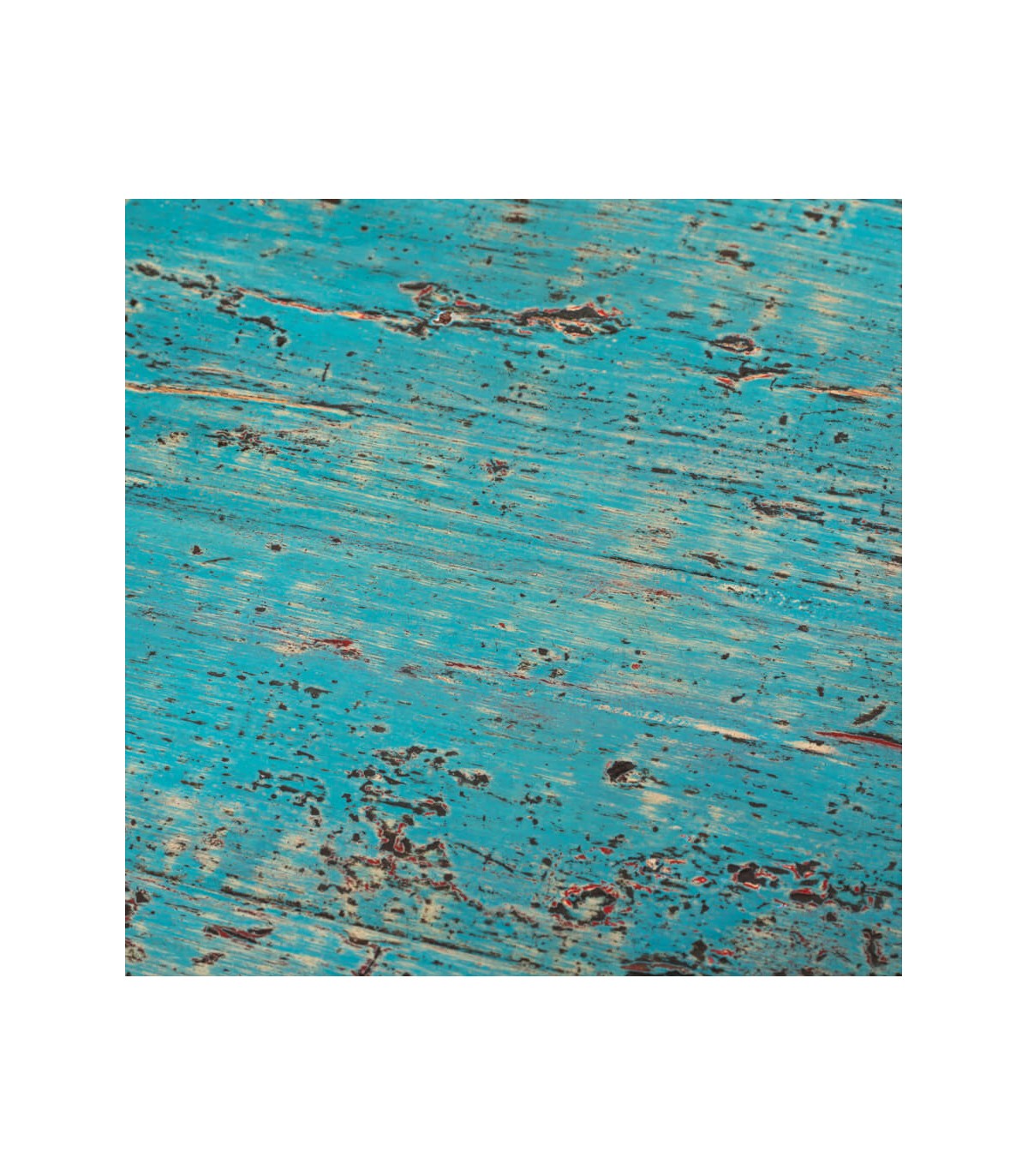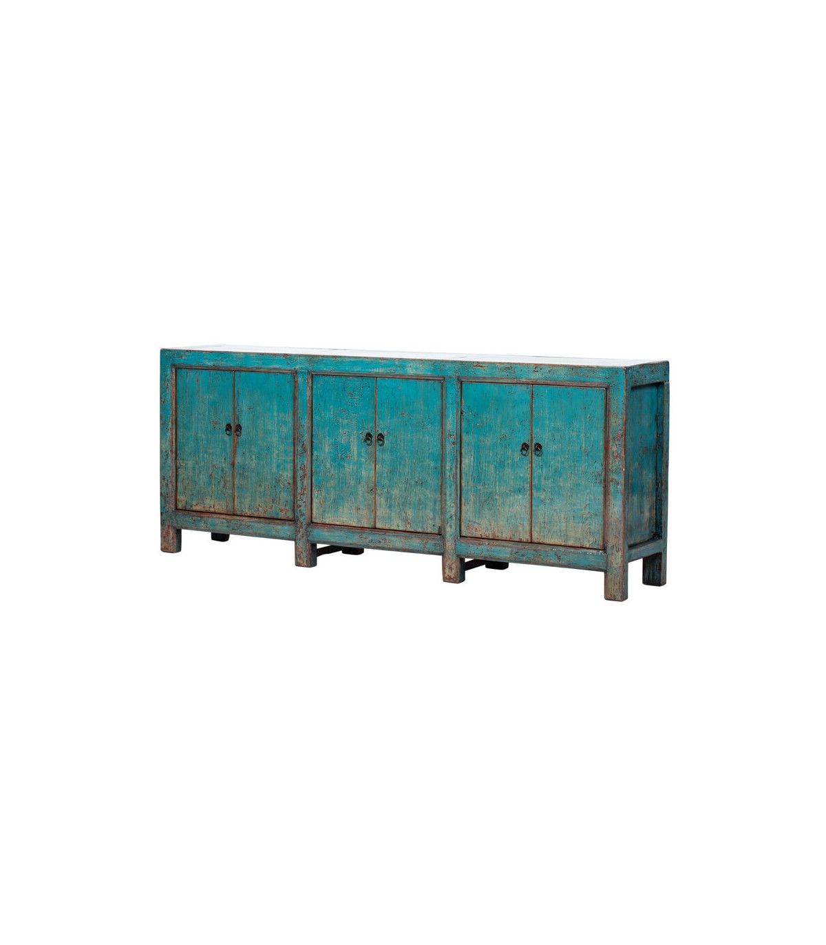 Destaca su impactante acabado en laca turquesa decapada, trabajado artesanalmente con vetas visibles y pátinas en rojo y negro, que dotan a la pieza de un carácter vibrante, antiguo y único. Los tiradores metálicos de bronce completan el conjunto con un guiño tradicional de aire asiático refinado y elegante