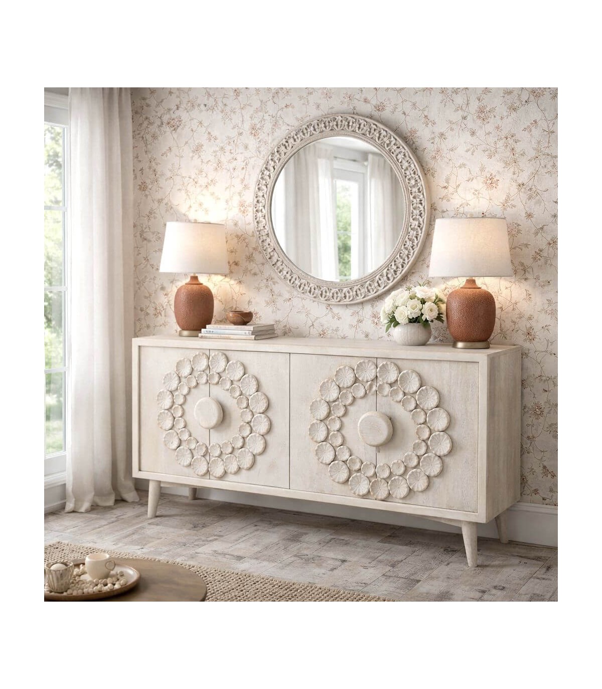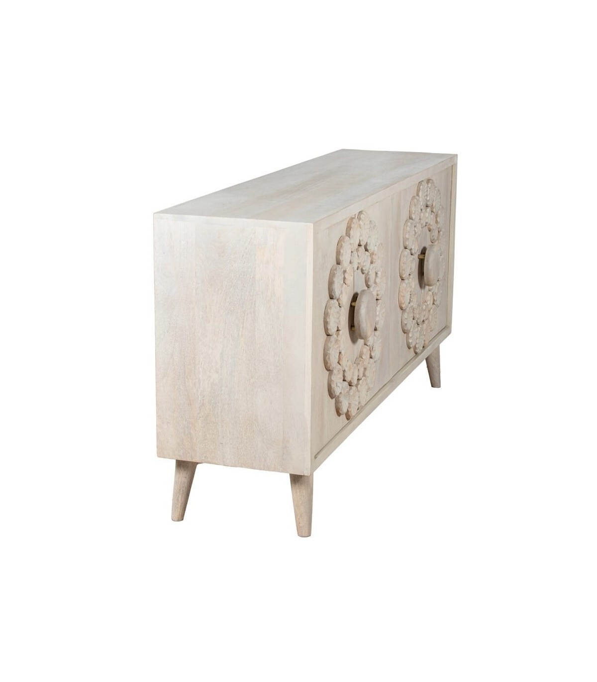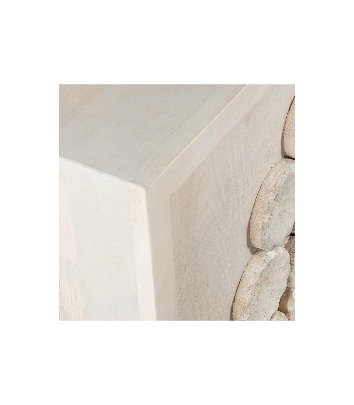 Los detalles tallados a mano aportan profundidad y un carácter único a cada pieza. El acabado blanqueado suaviza el conjunto y realza el relieve decorativo. Una pieza pensada para integrarse con equilibrio en salones cálidos y con identidad propia.