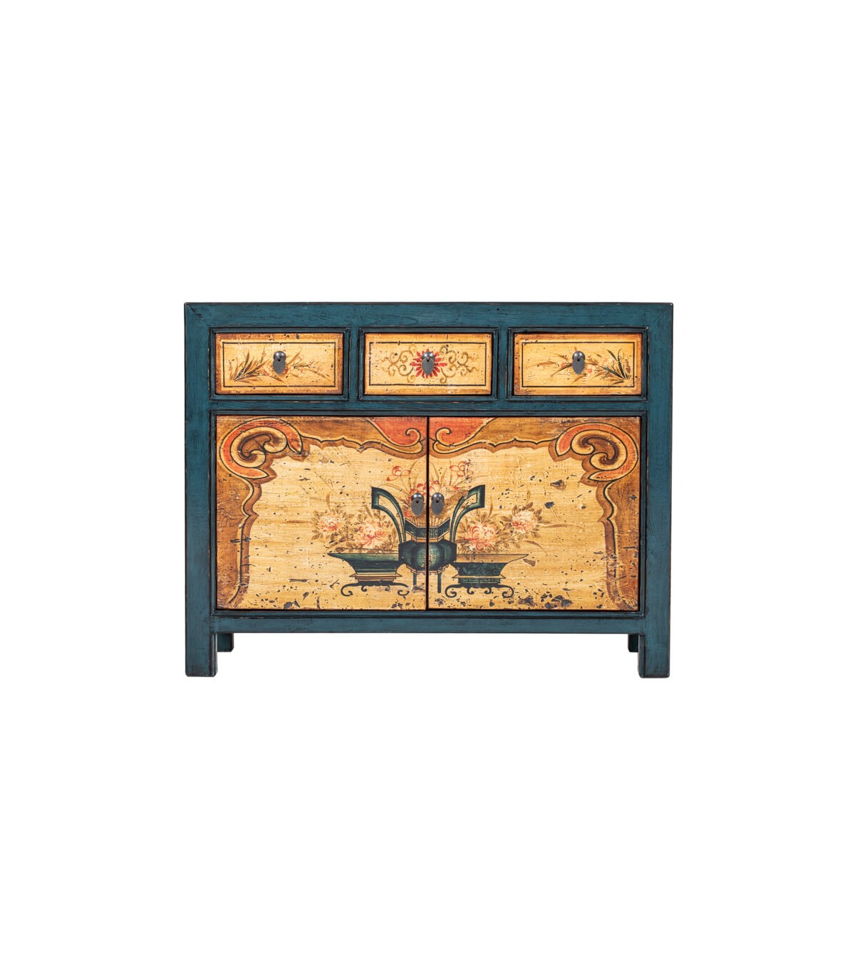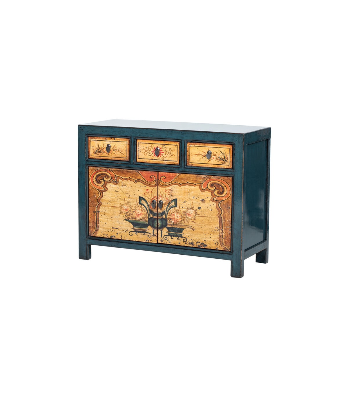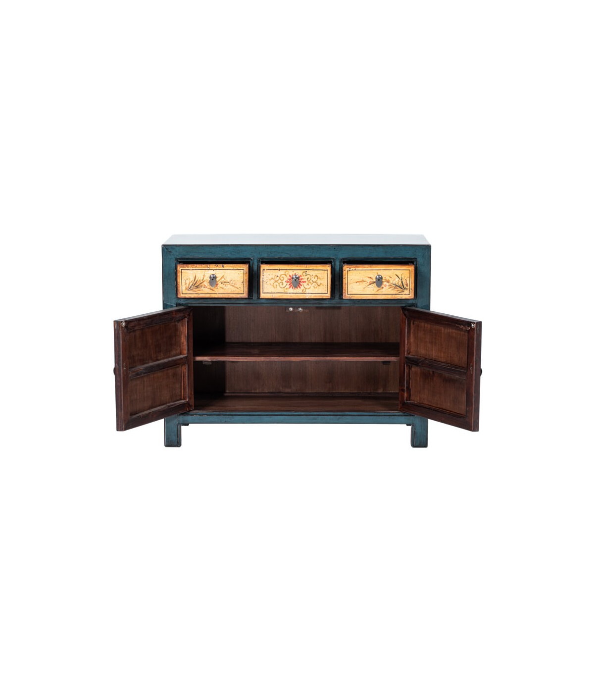 Dale un toque exótico y colorido a tu hogar con este espectacular aparador de estilo oriental. Fabricado en madera maciza de pino, destaca por sus tres cajones y dos puertas decoradas a mano, enmarcados en un vibrante azul lacado que realza su elegancia.