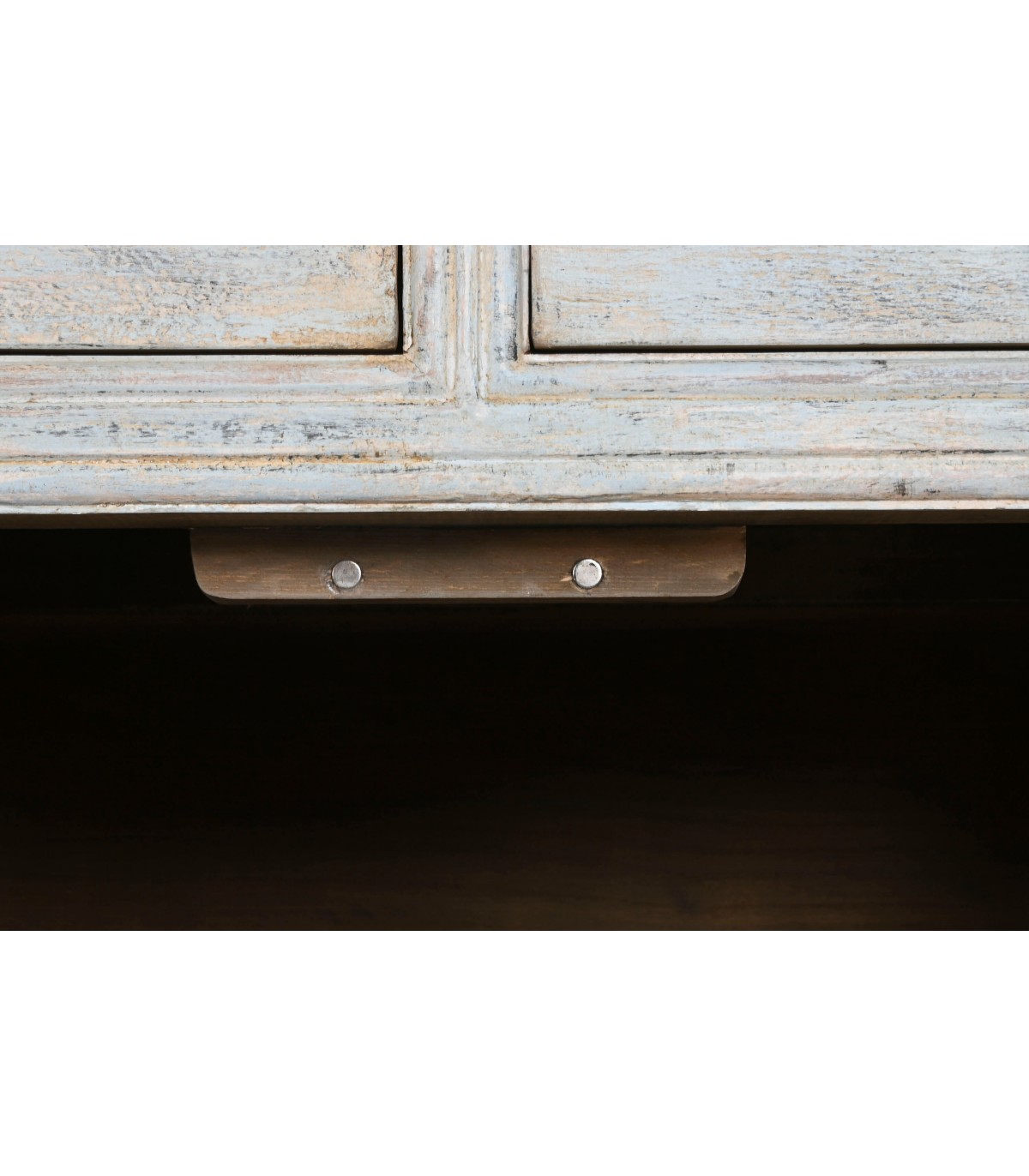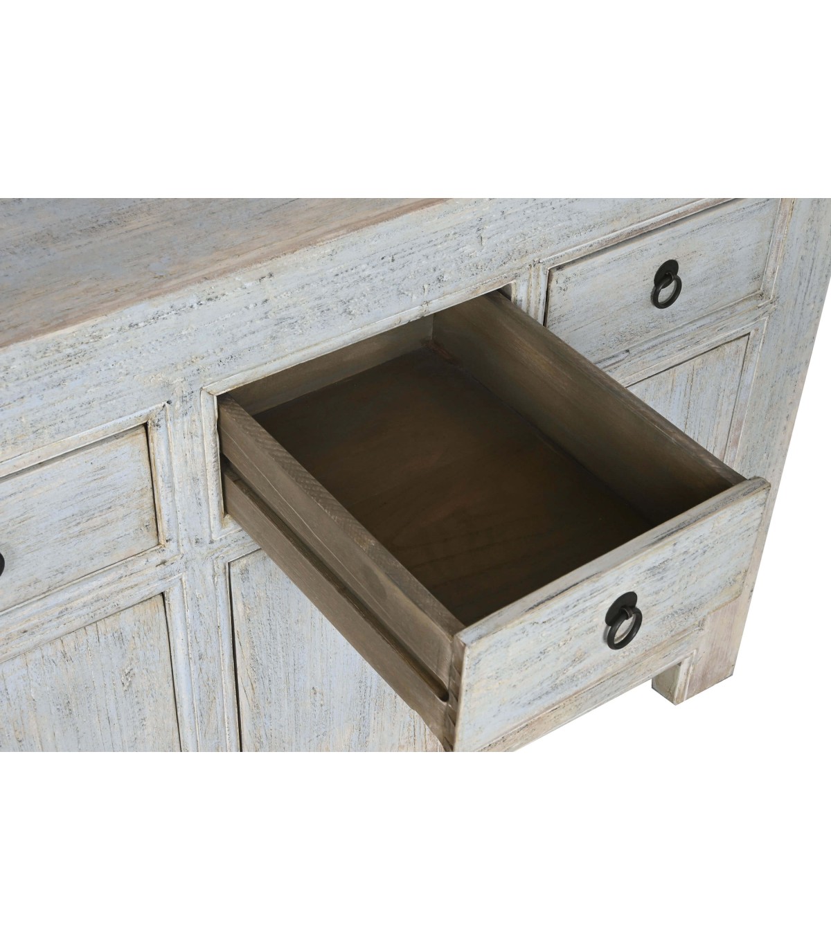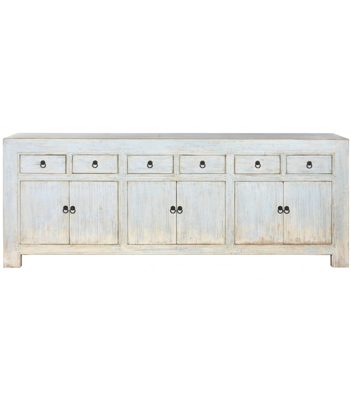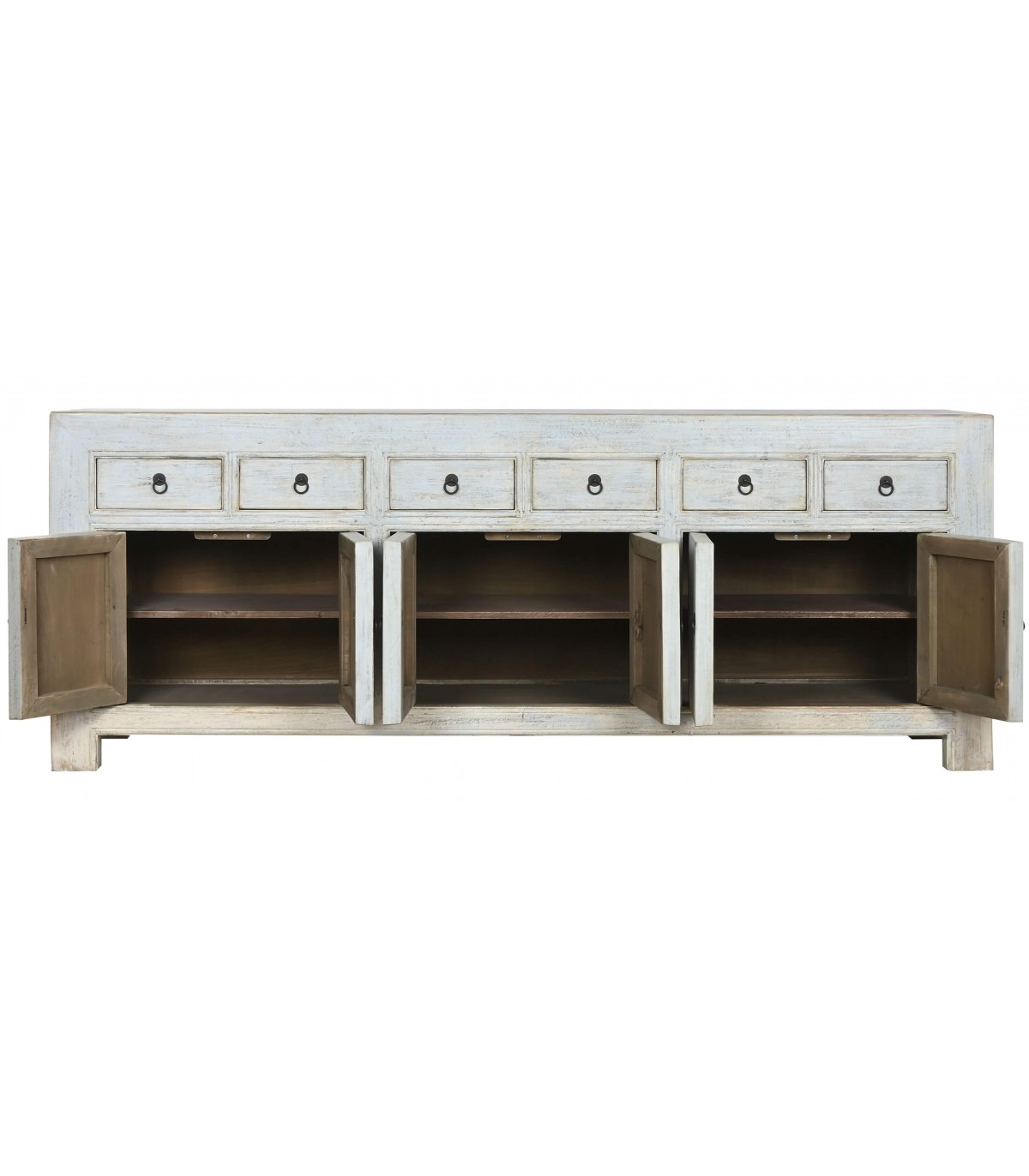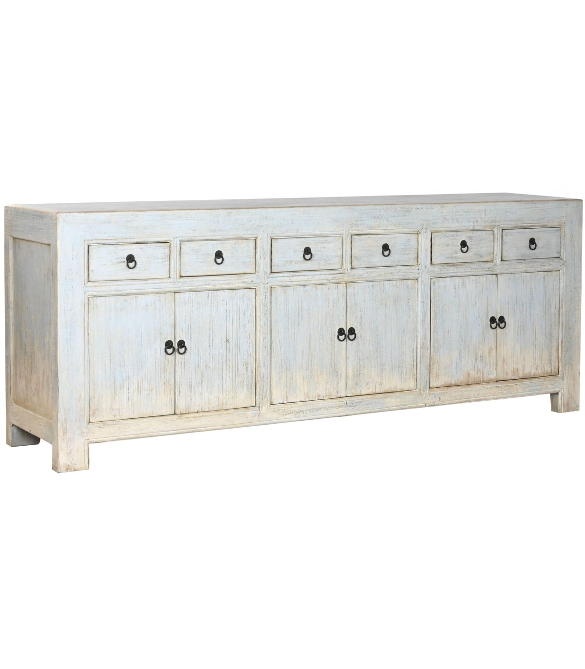Este aparador grande de inspiración oriental es una pieza de almacenamiento tan imponente como refinada. Fabricado en madera maciza de olmo y con acabado en tonos azul grisáceo decapados, su diseño aporta carácter, serenidad y autenticidad a cualquier ambiente. Sus seis cajones superiores y seis puertas con balda interior ofrecen una amplia capacidad de almacenaje sin renunciar al estilo.