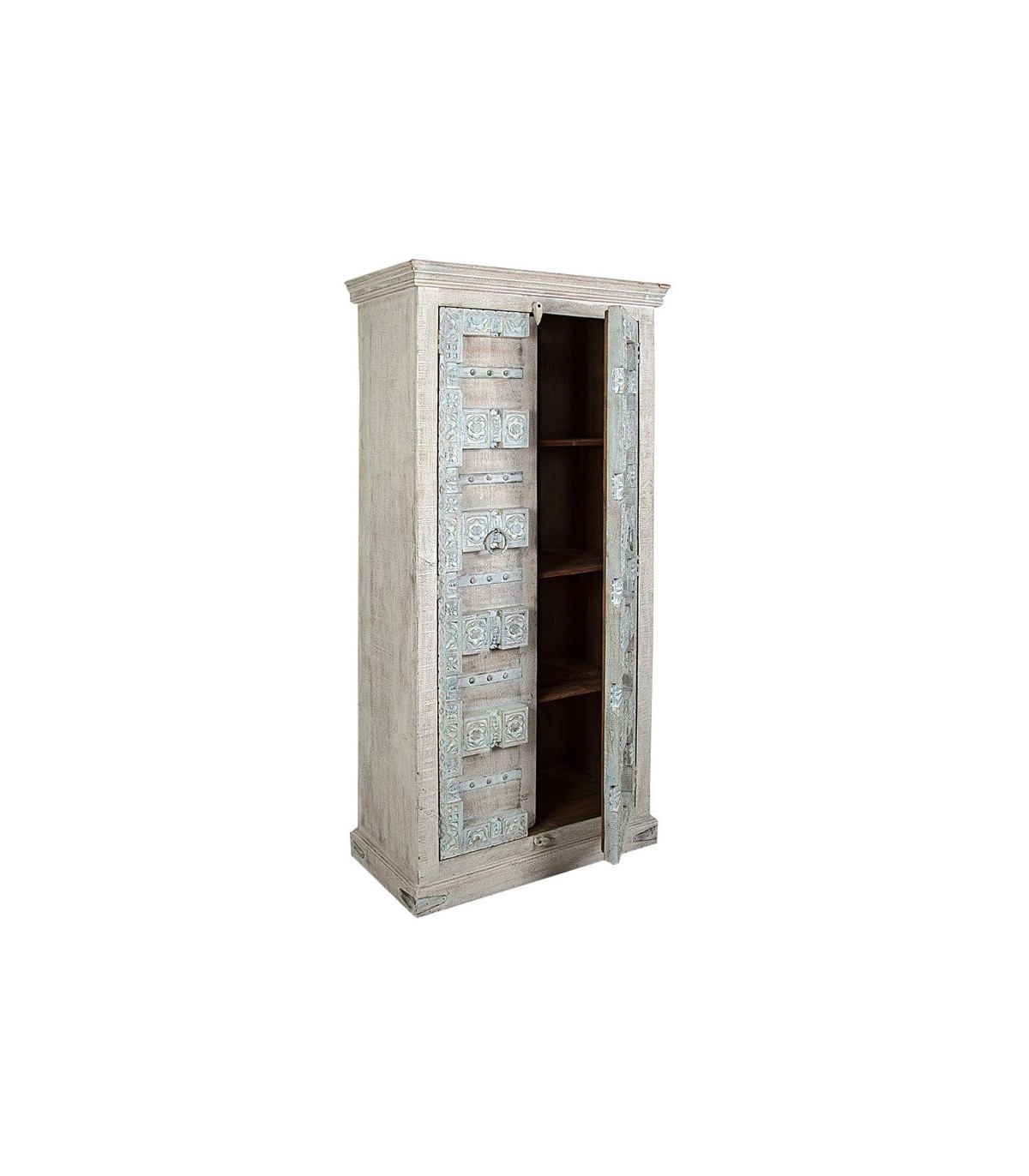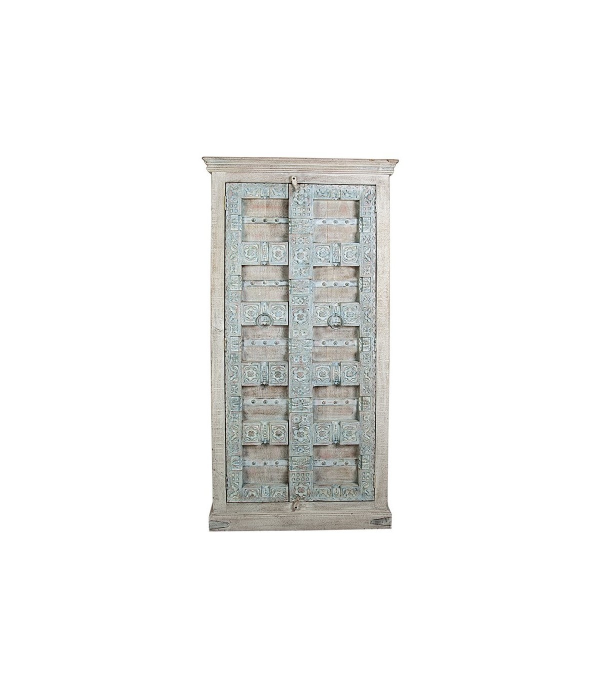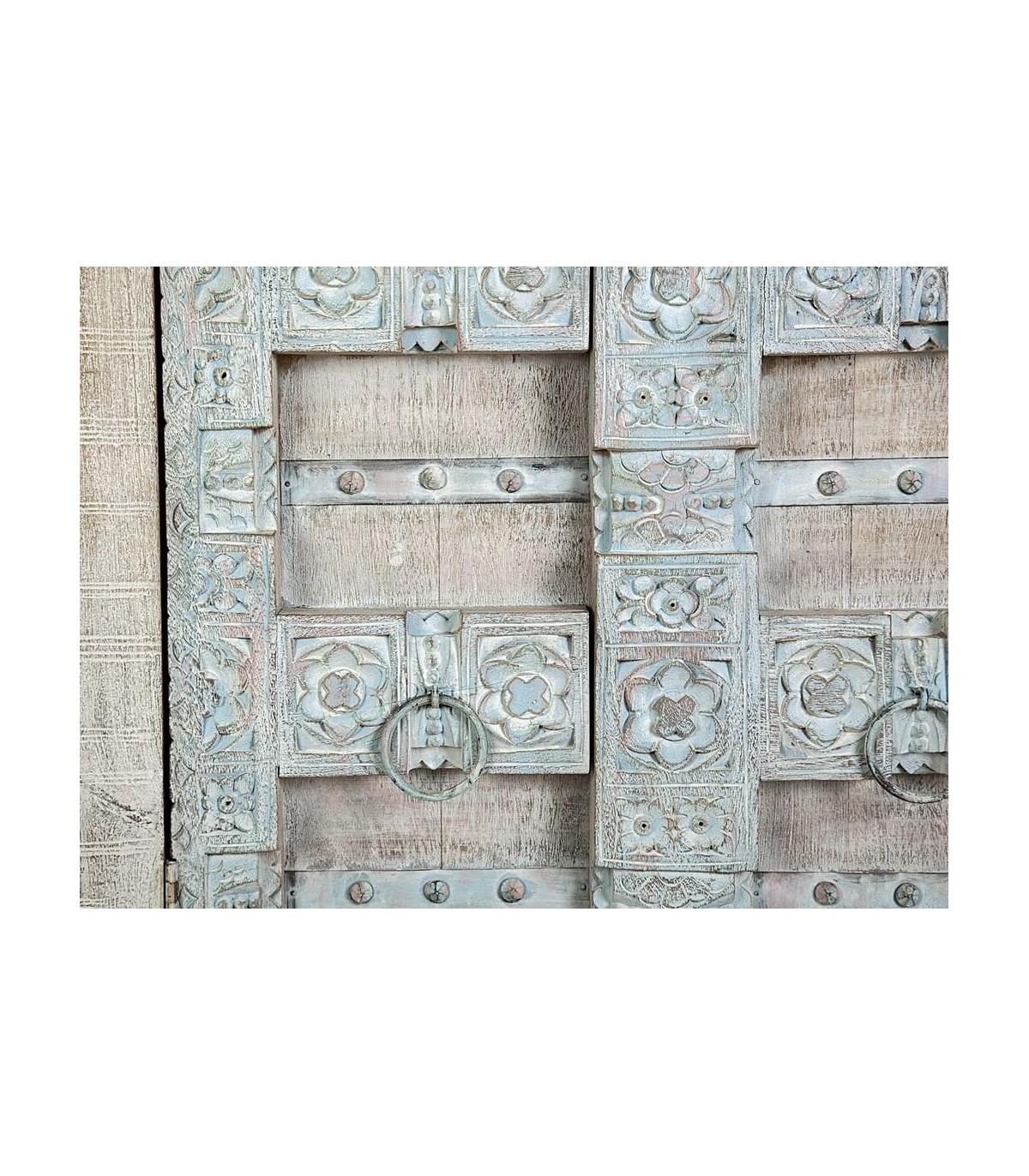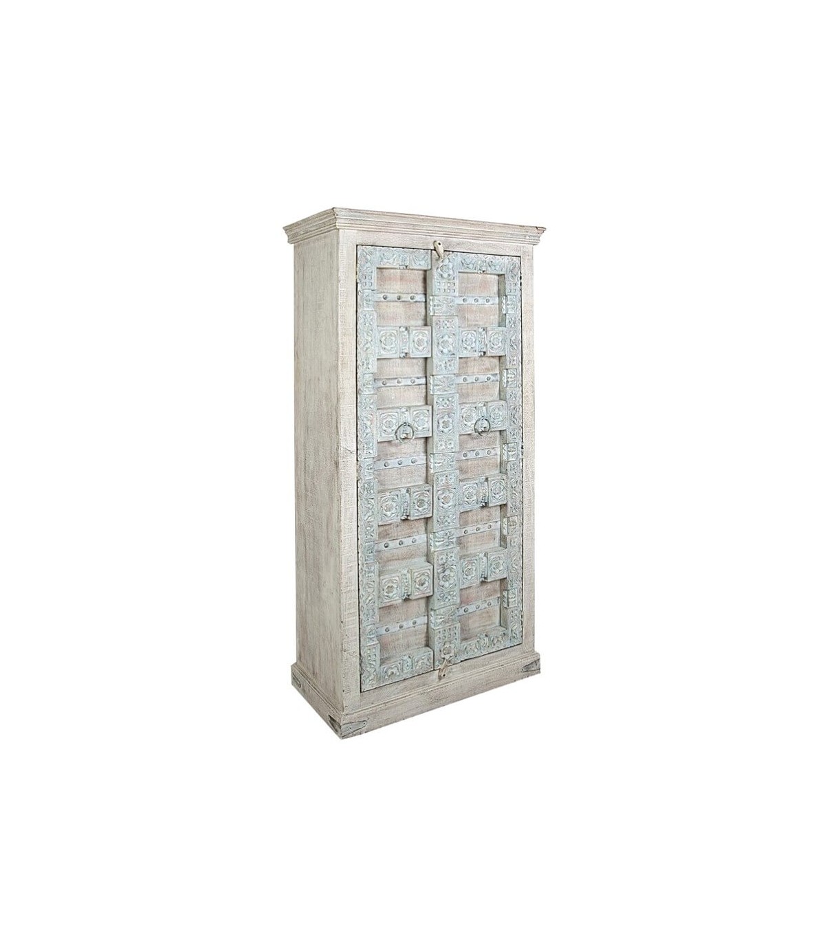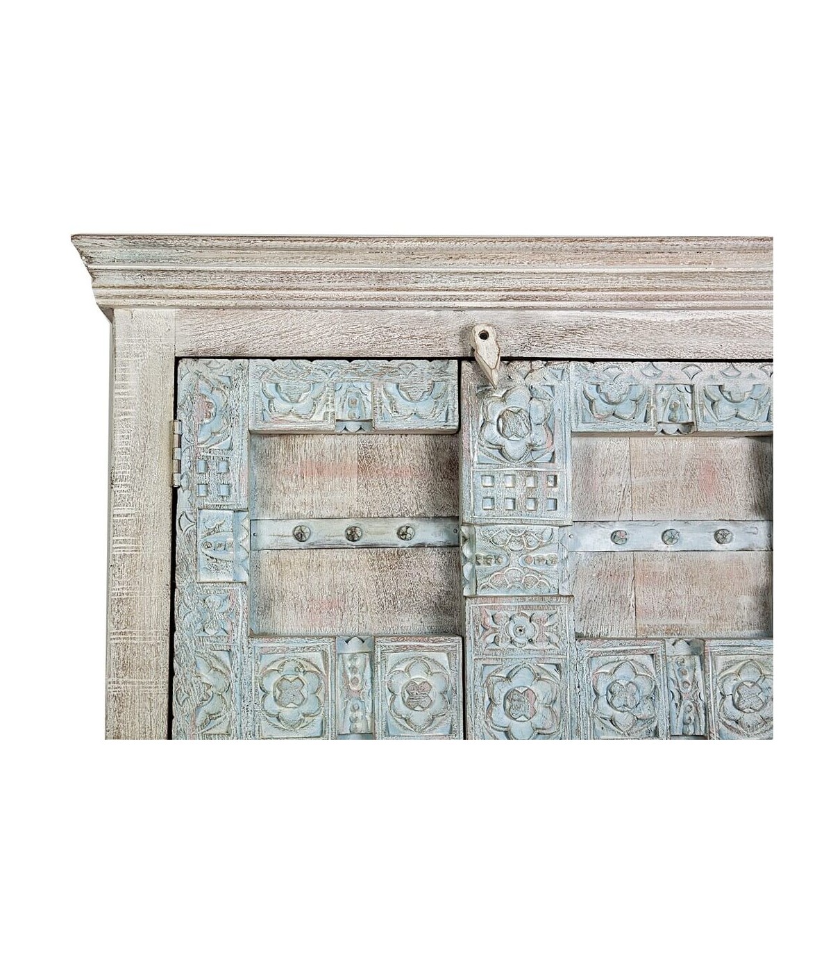 Armario alacena con 2 puertas de estilo étnico fabricado artesanalmente en madera de mango tallada a mano acabado natural patinada en blanco y azul, aplicaciones de metal y tiradores acabados a juego.