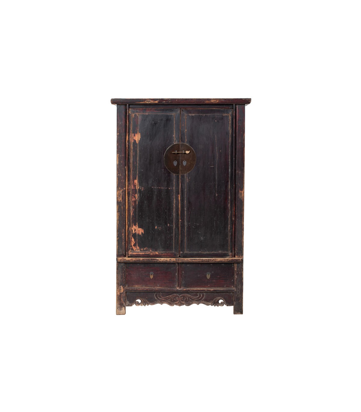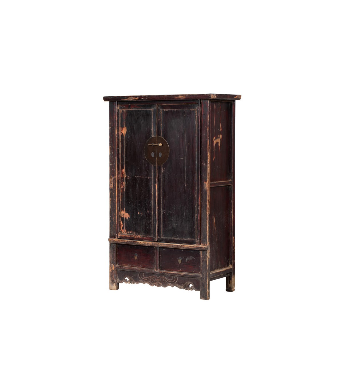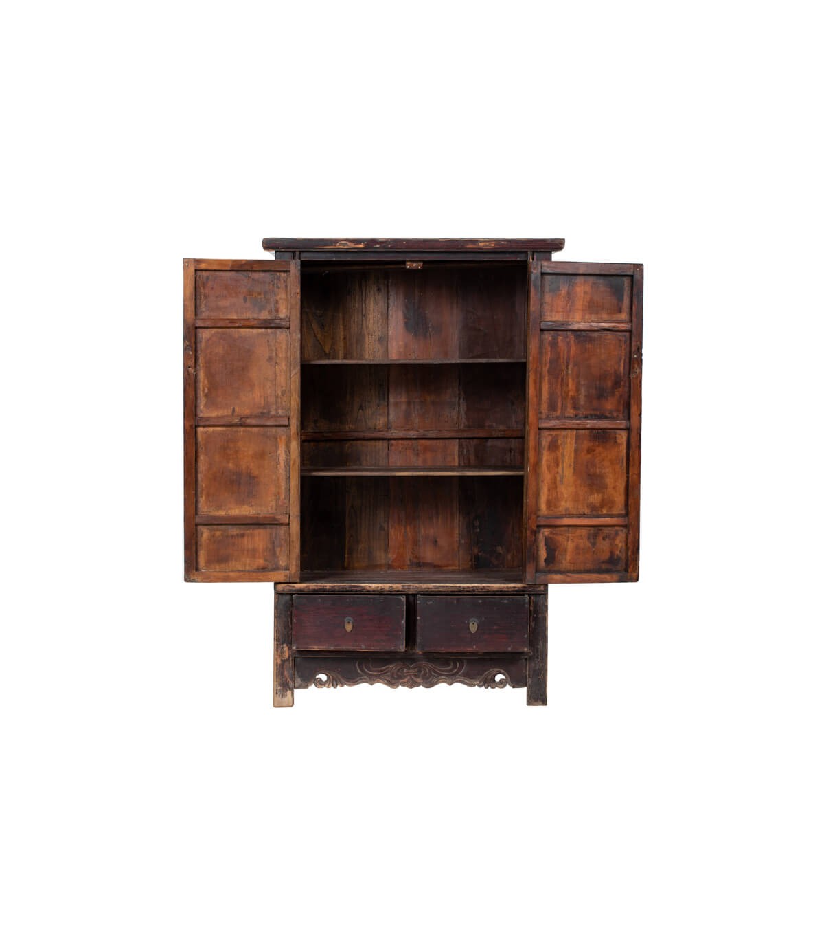 Este armario alacena oriental es una auténtica pieza única con más de 100 años de antigüedad, elaborado en madera maciza de olmo y detalles en bronce. Su diseño tradicional destaca por sus dos puertas y dos cajones interiores, ofreciendo un amplio espacio de almacenamiento con un carácter histórico inigualable.