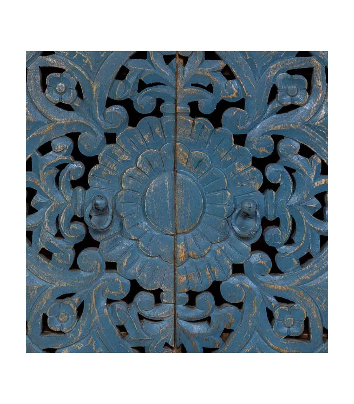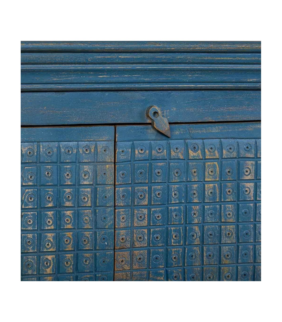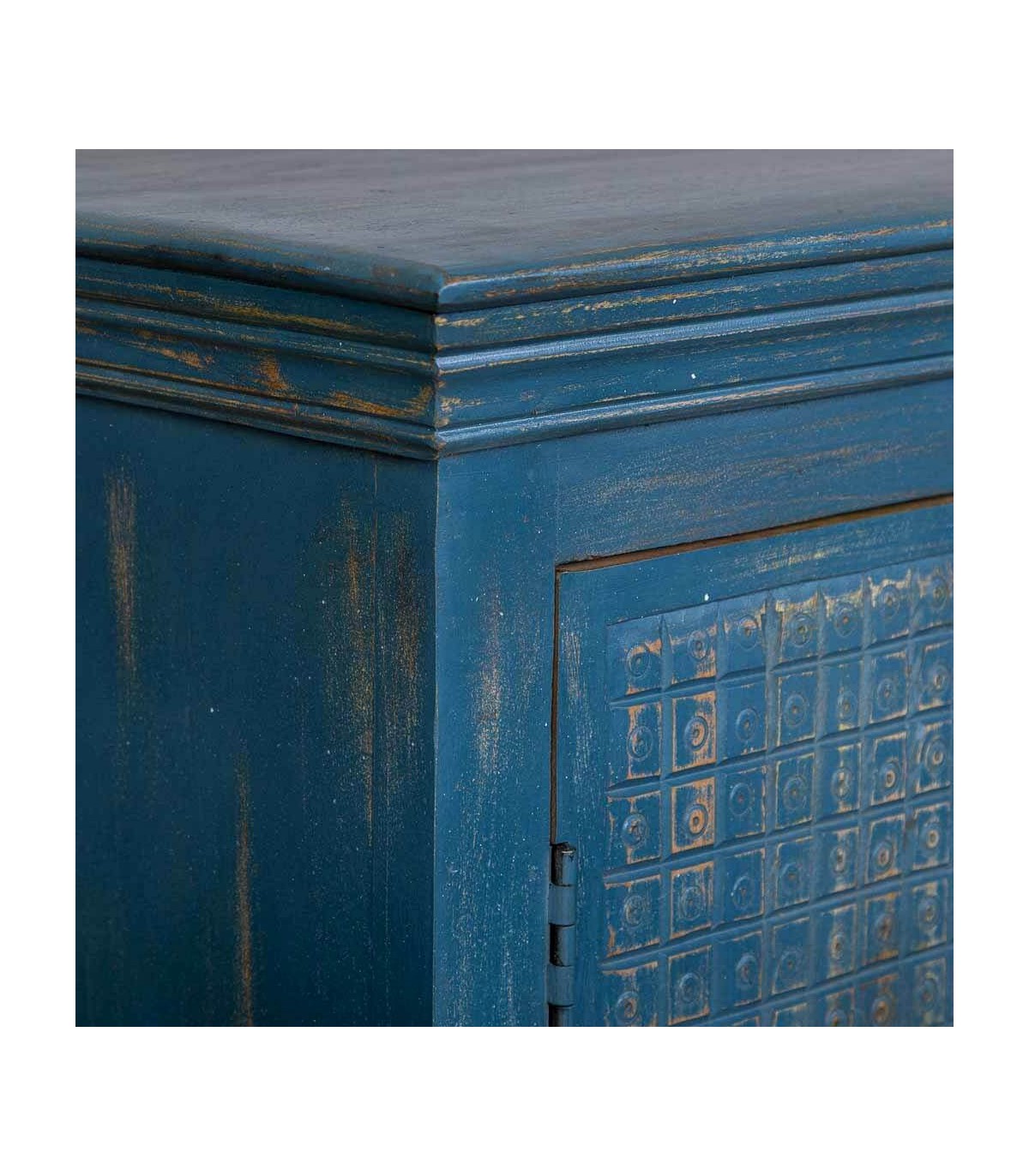 Dale un toque único y exótico a tu hogar con este armario alacena bajo de estilo étnico, una pieza artesanal que destaca por su tallado a mano y su elegante acabado azul rozado, que aporta un aire envejecido y auténtico.