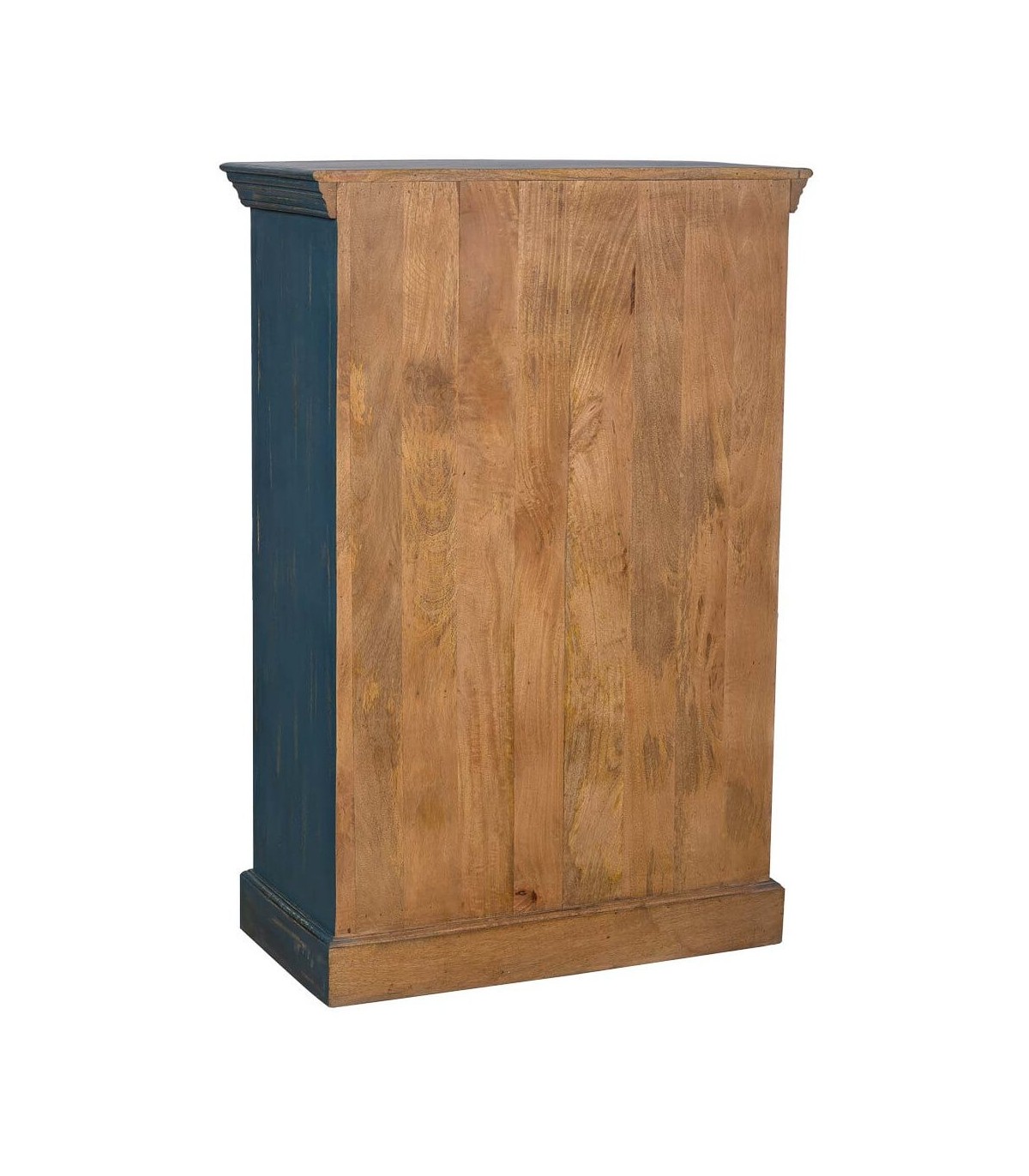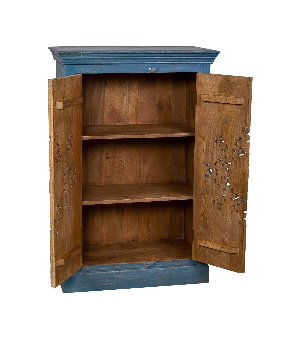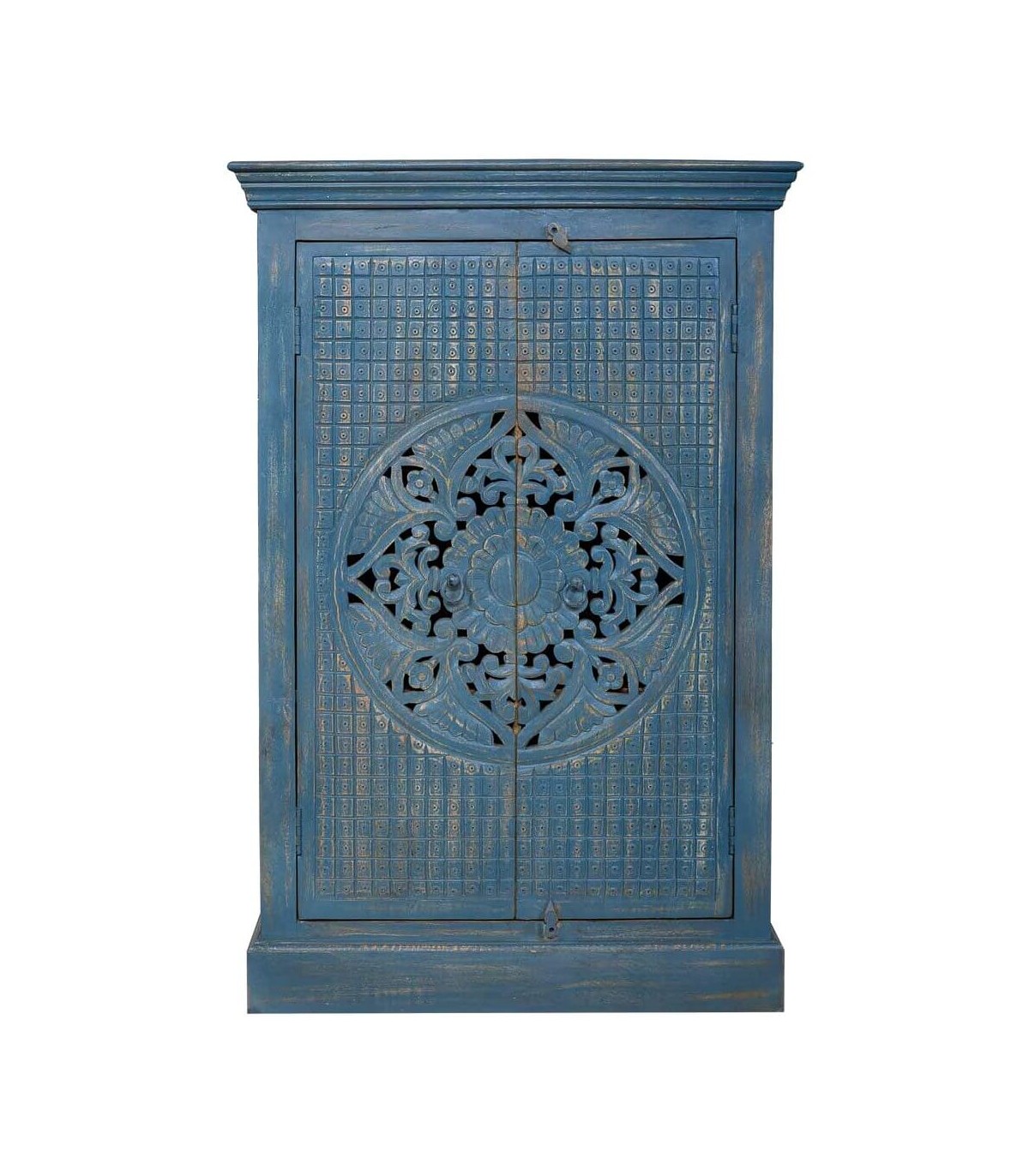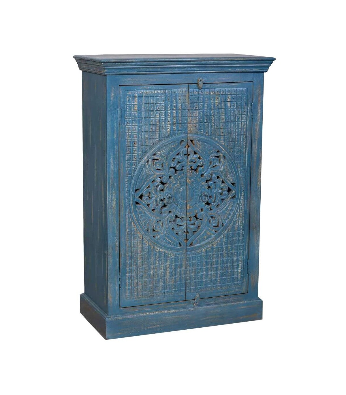 Dale un toque único y exótico a tu hogar con este armario alacena bajo de estilo étnico, una pieza artesanal que destaca por su tallado a mano y su elegante acabado azul rozado, que aporta un aire envejecido y auténtico.