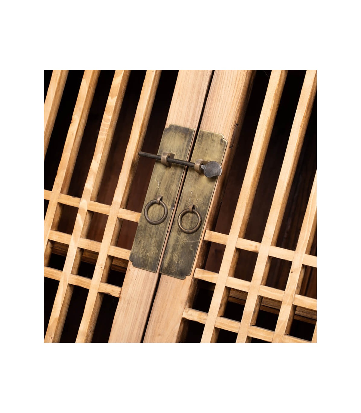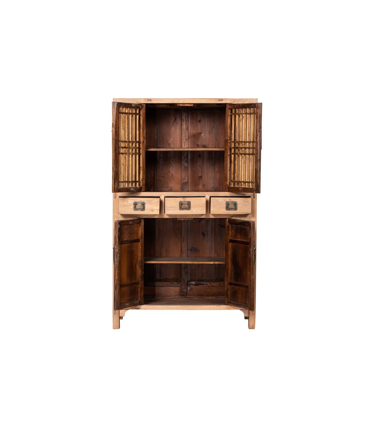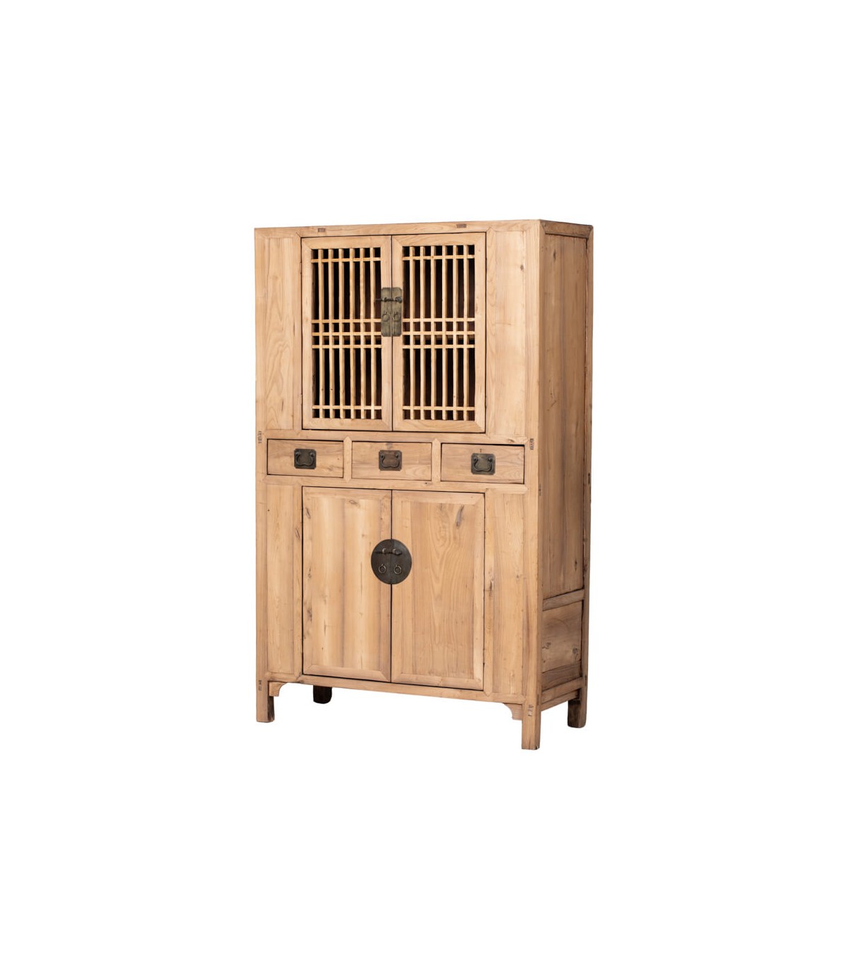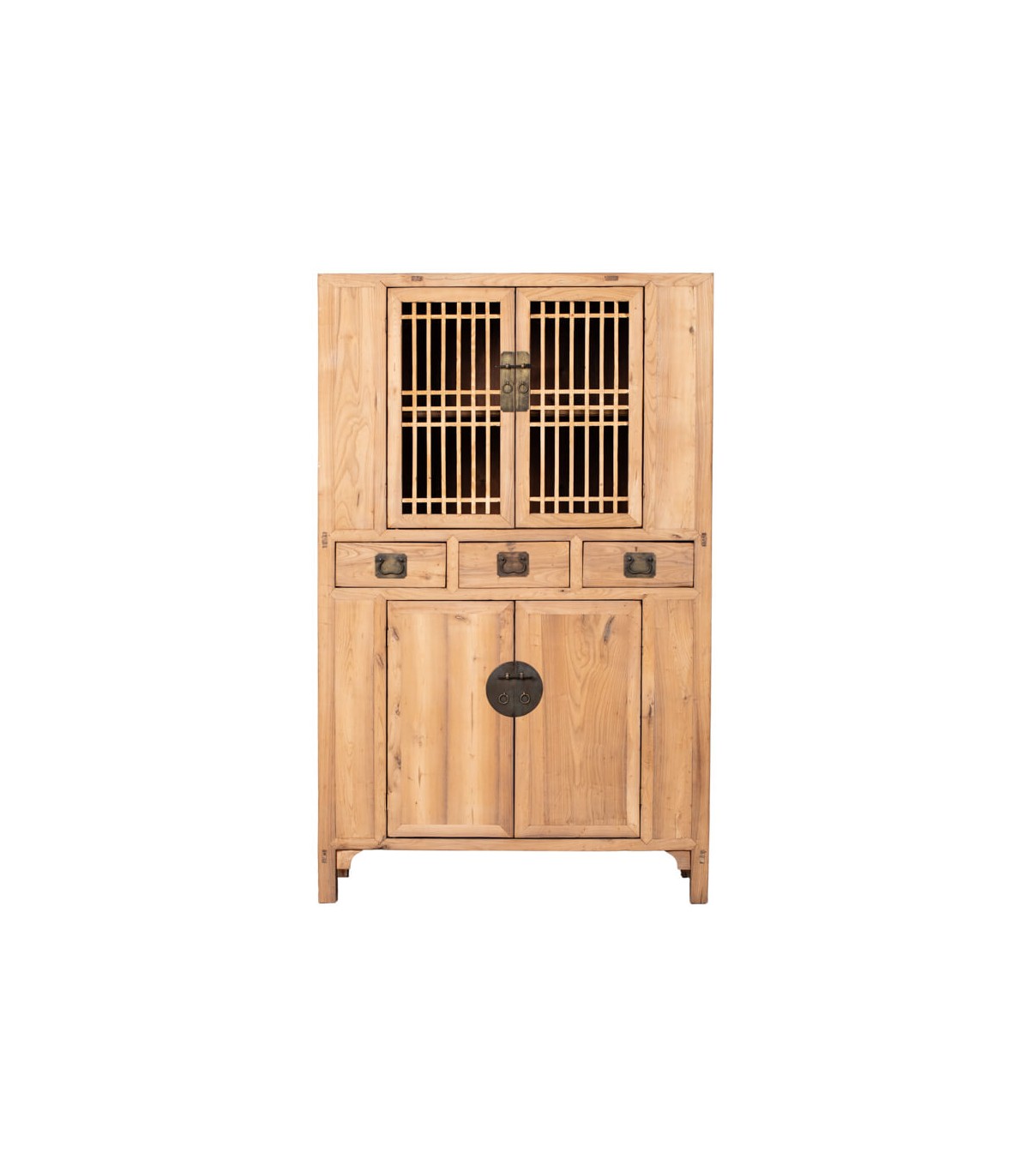 Este armario alacena de estilo oriental es una pieza única que combina madera maciza de olmo con herrajes de bronce, aportando un aire elegante y sofisticado. Su diseño cuenta con dos puertas superiores con enrejado, dos puertas inferiores y tres cajones, ofreciendo un amplio espacio de almacenamiento con un toque exótico.