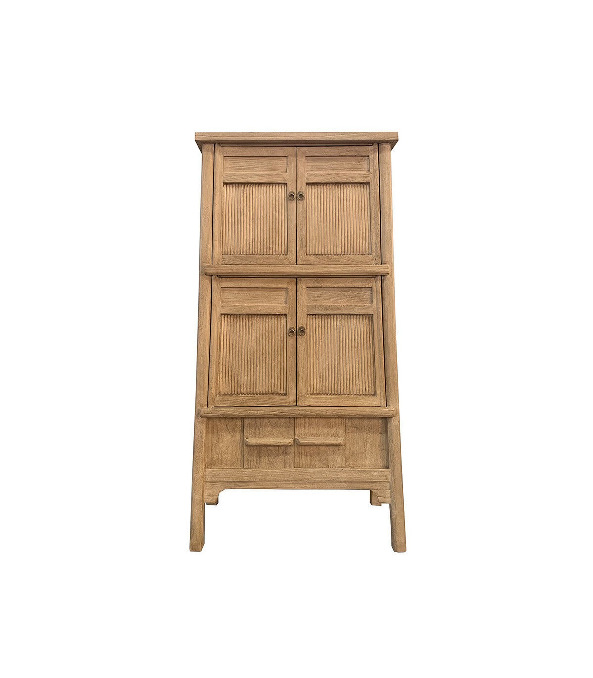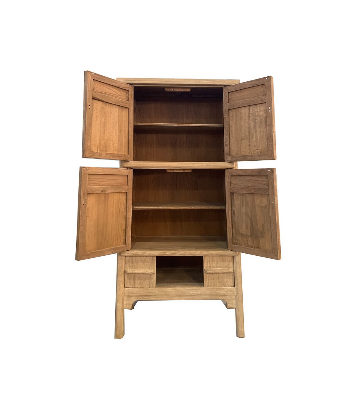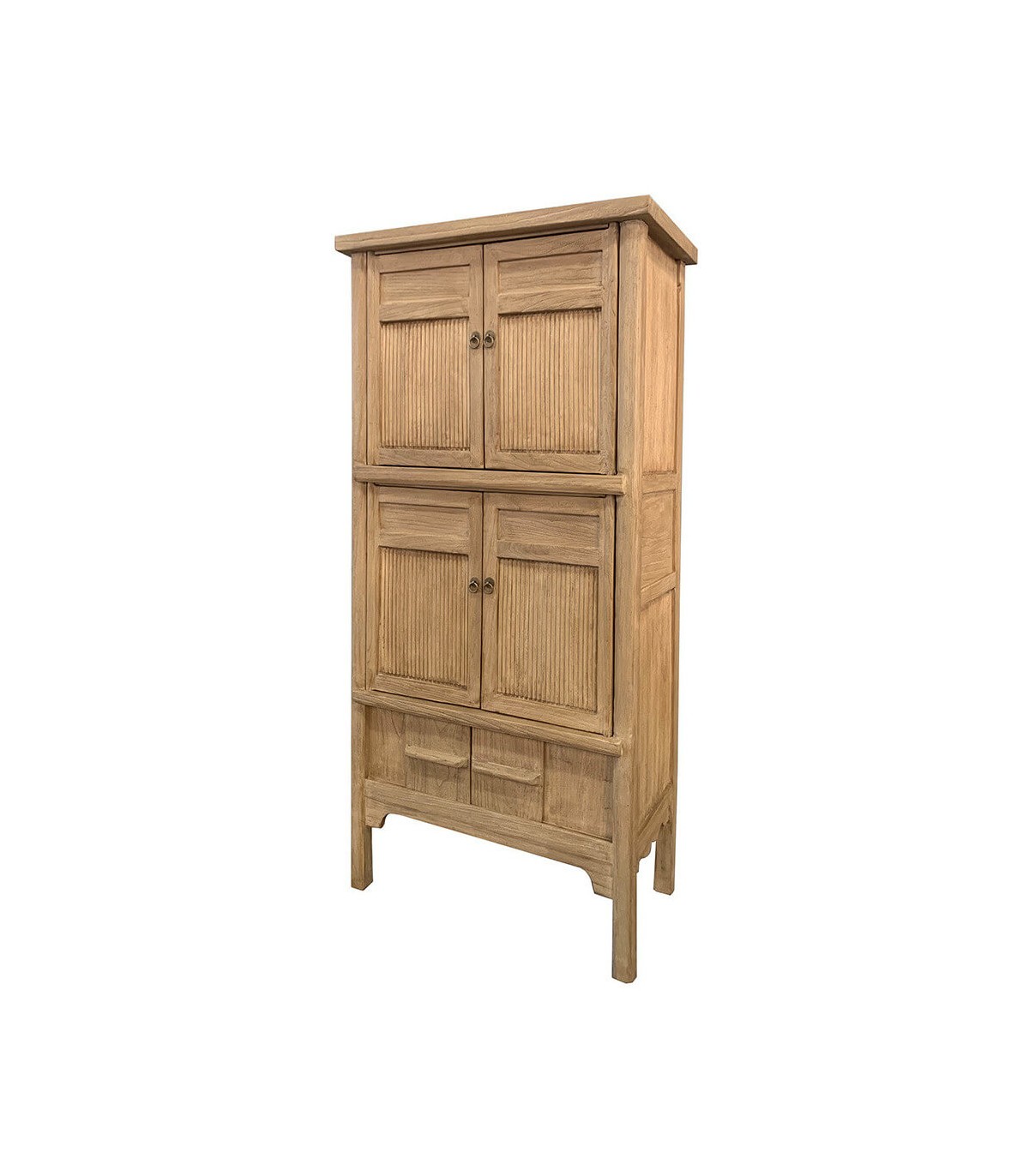 Sumérgete en la belleza y funcionalidad de esta espectacular alacena oriental con cuatro puertas batientes y dos correderas que combinan estética tradicional con utilidad contemporánea. Su estructura en madera maciza de olmo tallada a mano presenta una cálida tonalidad natural y un diseño de líneas depuradas con molduras estriadas verticales que aportan textura y carácter.