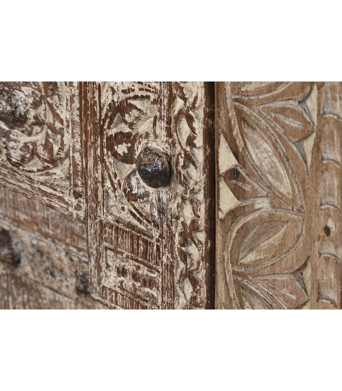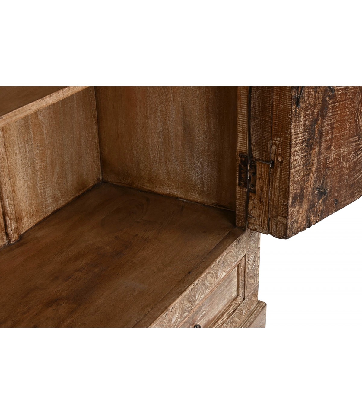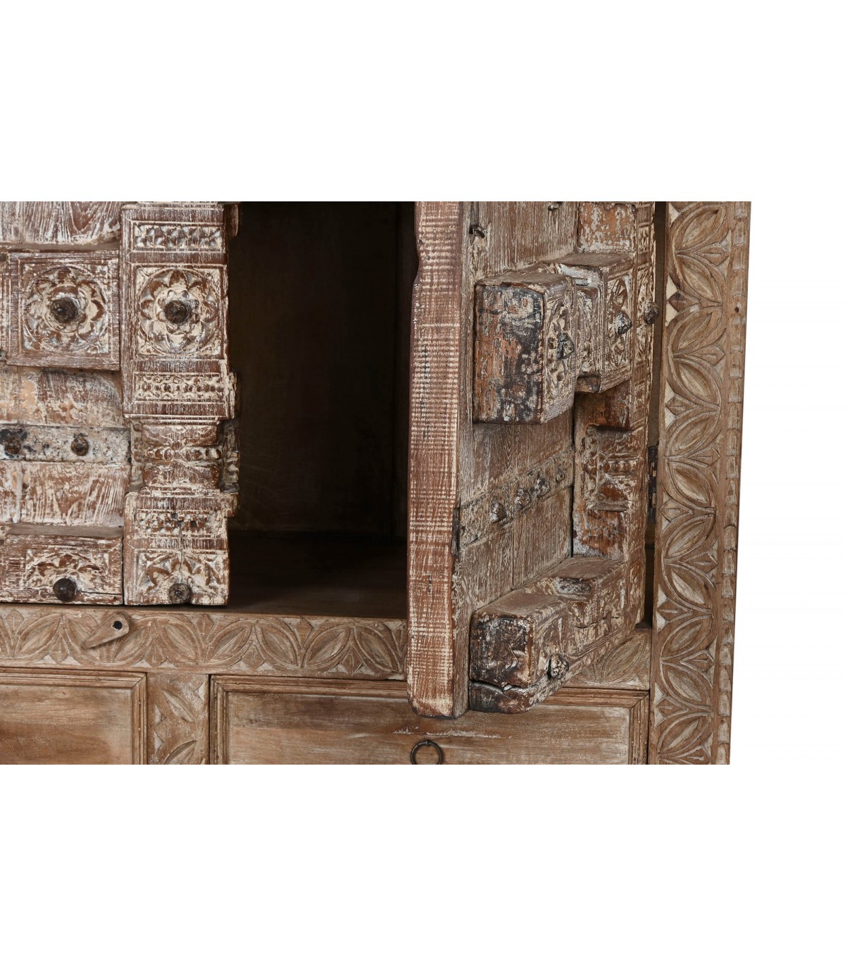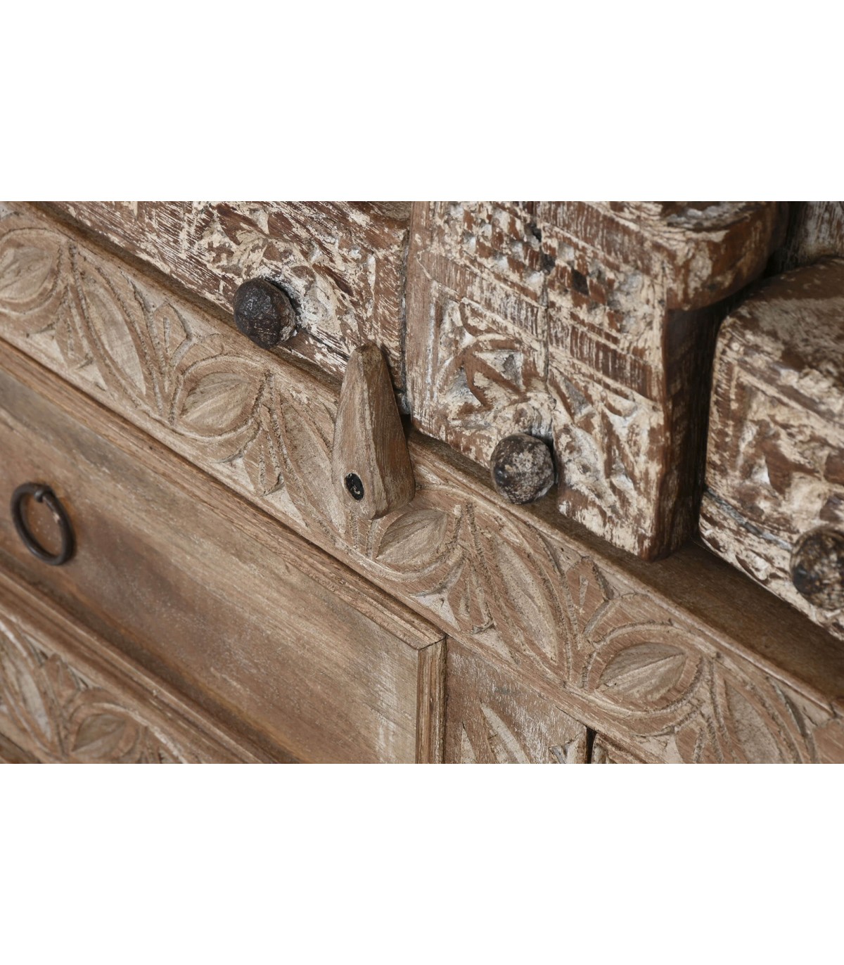 Armario alacena con 2 puertas y 2 cajones de estilo étnico realizado en madera de teca tallada a mano acabado natural envejecido con el herraje acabado óxido, adaptable a cualquier tipo de decoración como pieza singular.