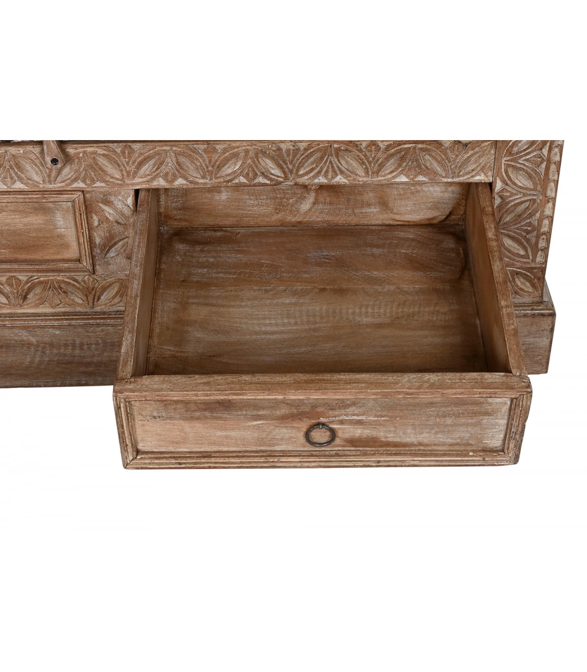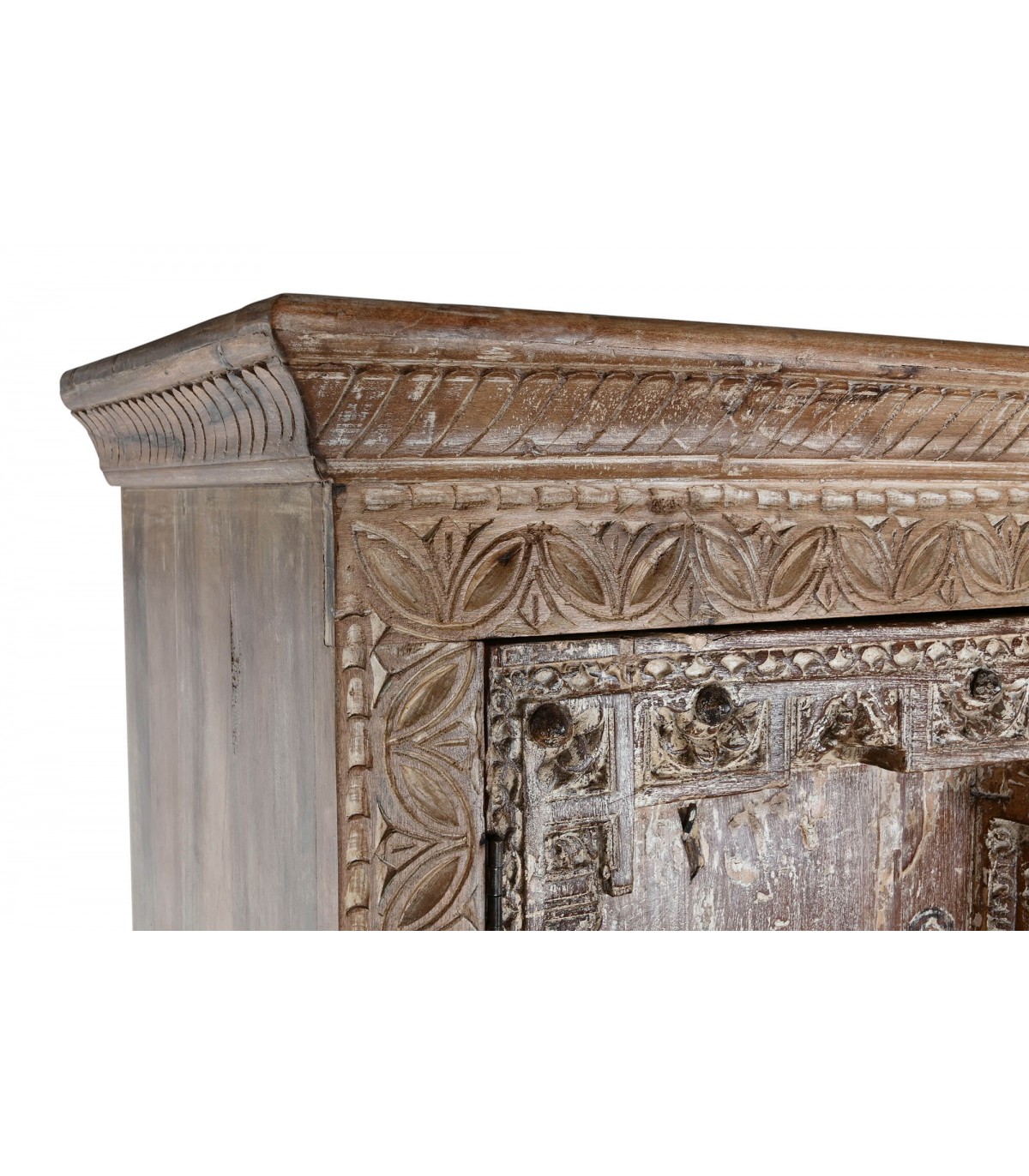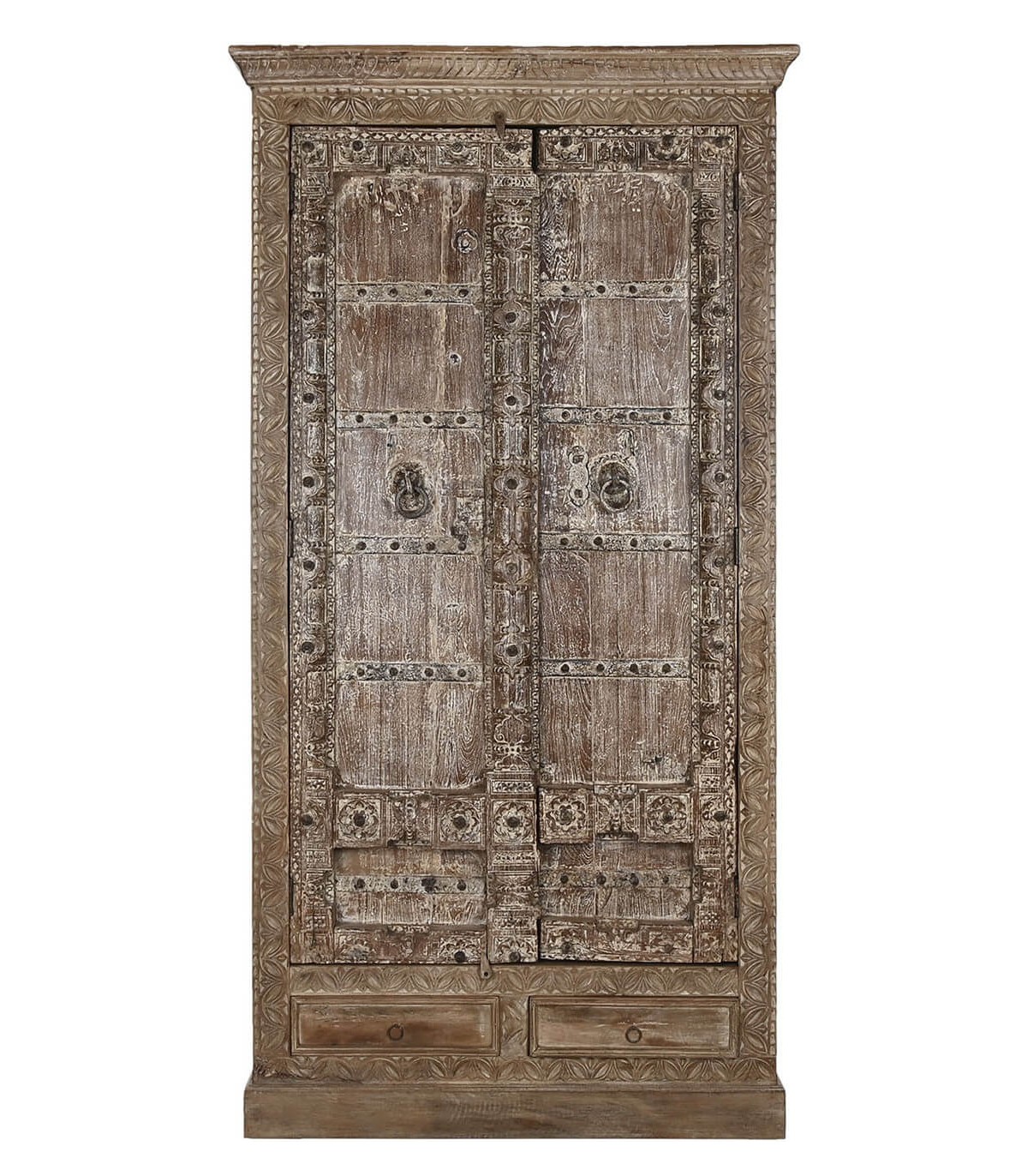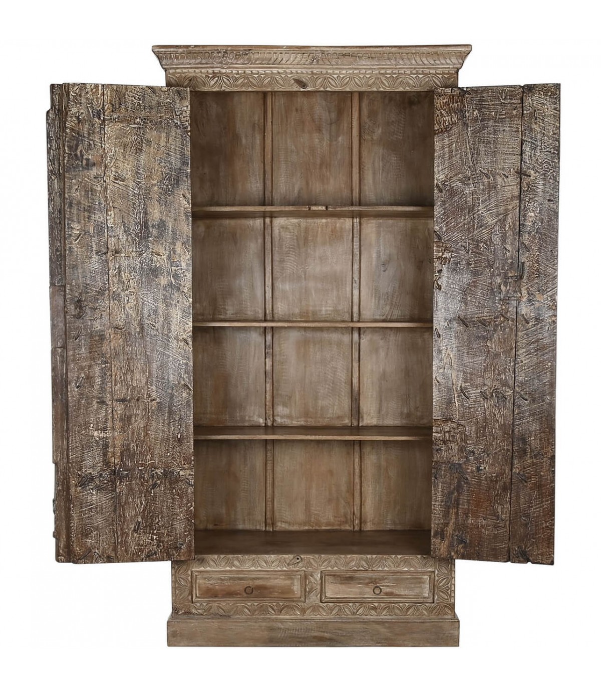 Armario alacena con 2 puertas y 2 cajones de estilo étnico realizado en madera de teca tallada a mano acabado natural envejecido con el herraje acabado óxido, adaptable a cualquier tipo de decoración como pieza singular.