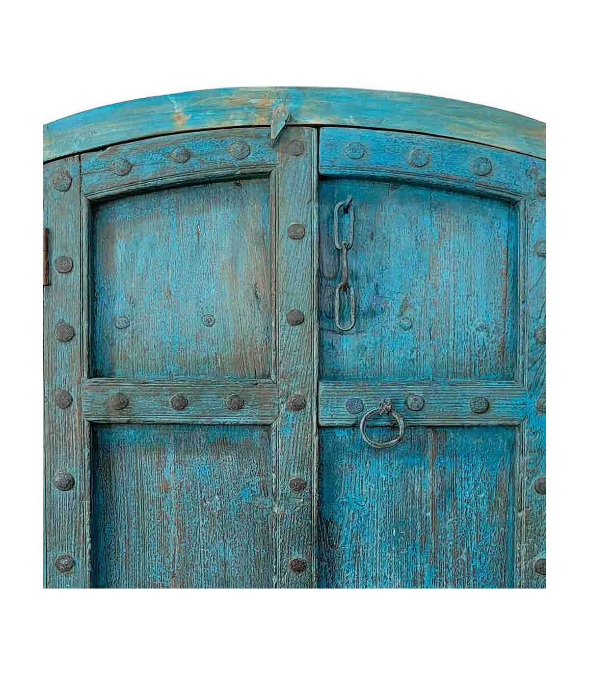 Acabado, madera tallada de madera artesanal acabado azul envejecido, tirador y aplicaciones en hierro forjado acabado a juego. Fabricación artesanal. entendemos las variaciones de tonalidad, tamaño y forma o ciertas imperfecciones (grietas, nudos, marcas) como un valor añadido que la convierten en pieza única.