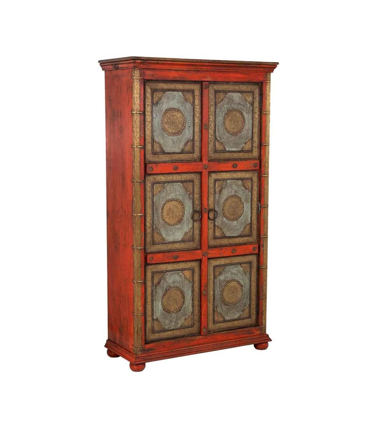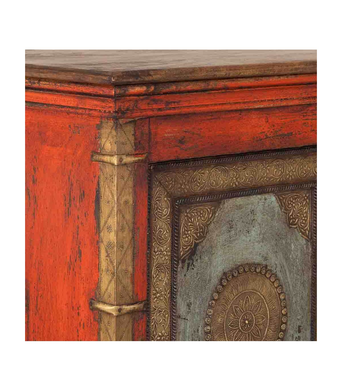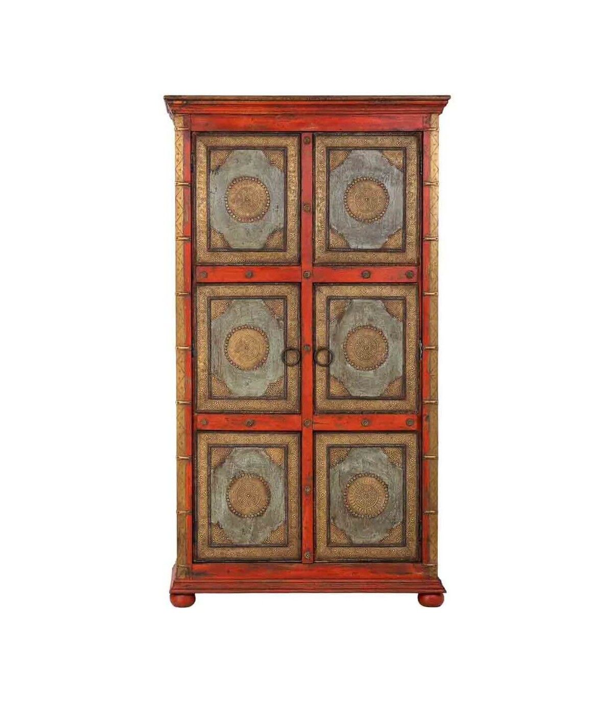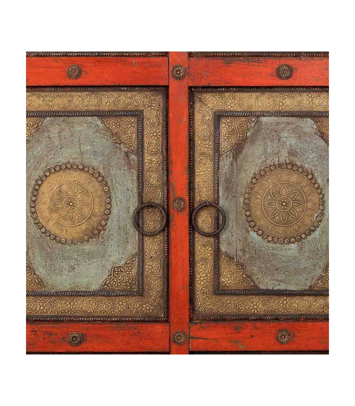 Impresionante armario alacena de estilo étnico con una fuerte carga decorativa y simbólica. Fabricado en madera maciza de mango teñida en rojo intenso, incorpora espectaculares paneles metálicos repujados en dorado y gris envejecido con motivos circulares.