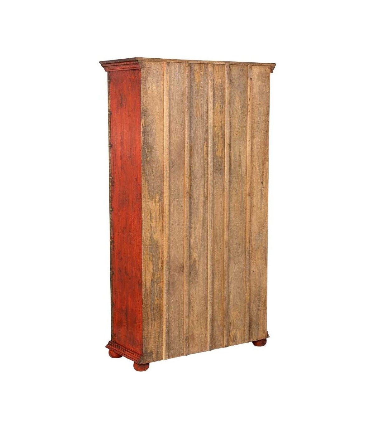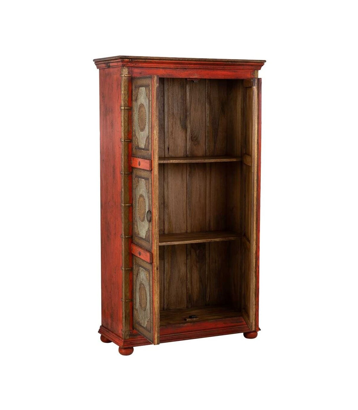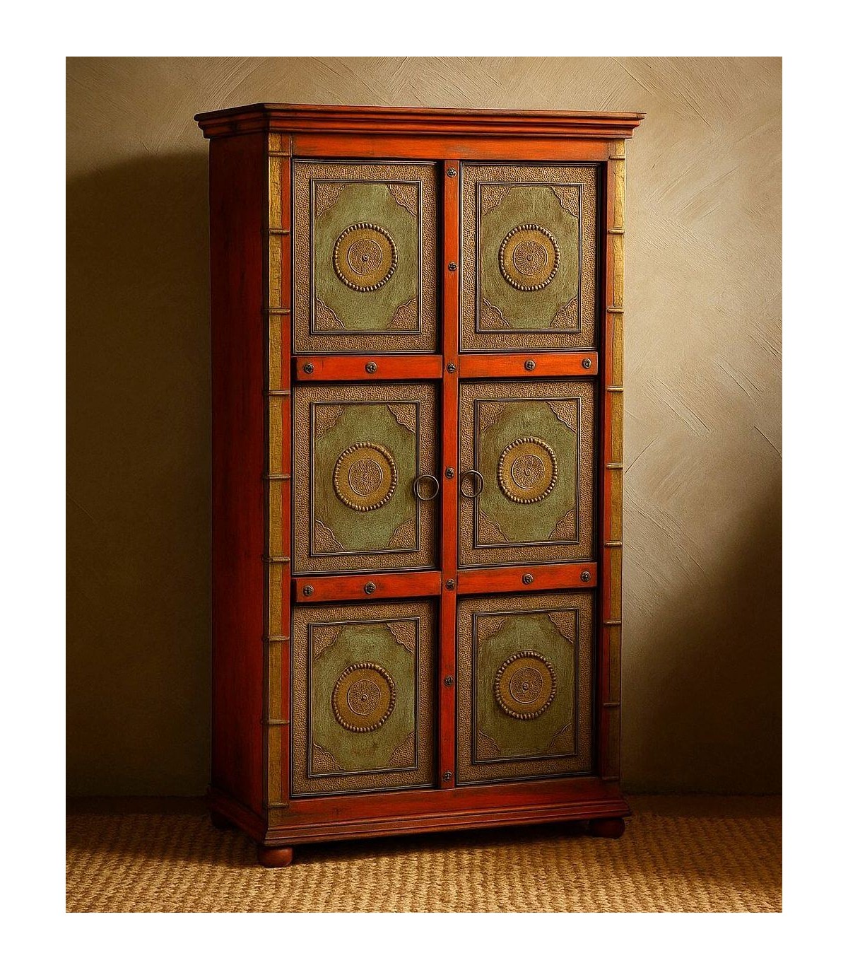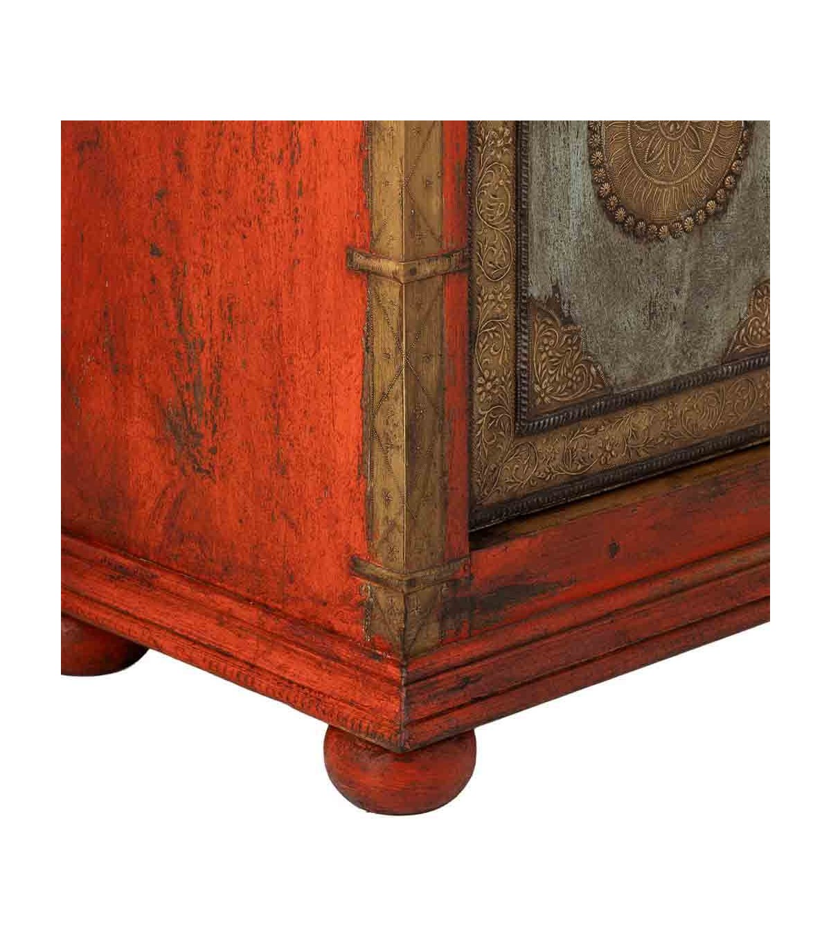 Impresionante armario alacena de estilo étnico con una fuerte carga decorativa y simbólica. Fabricado en madera maciza de mango teñida en rojo intenso, incorpora espectaculares paneles metálicos repujados en dorado y gris envejecido con motivos circulares.