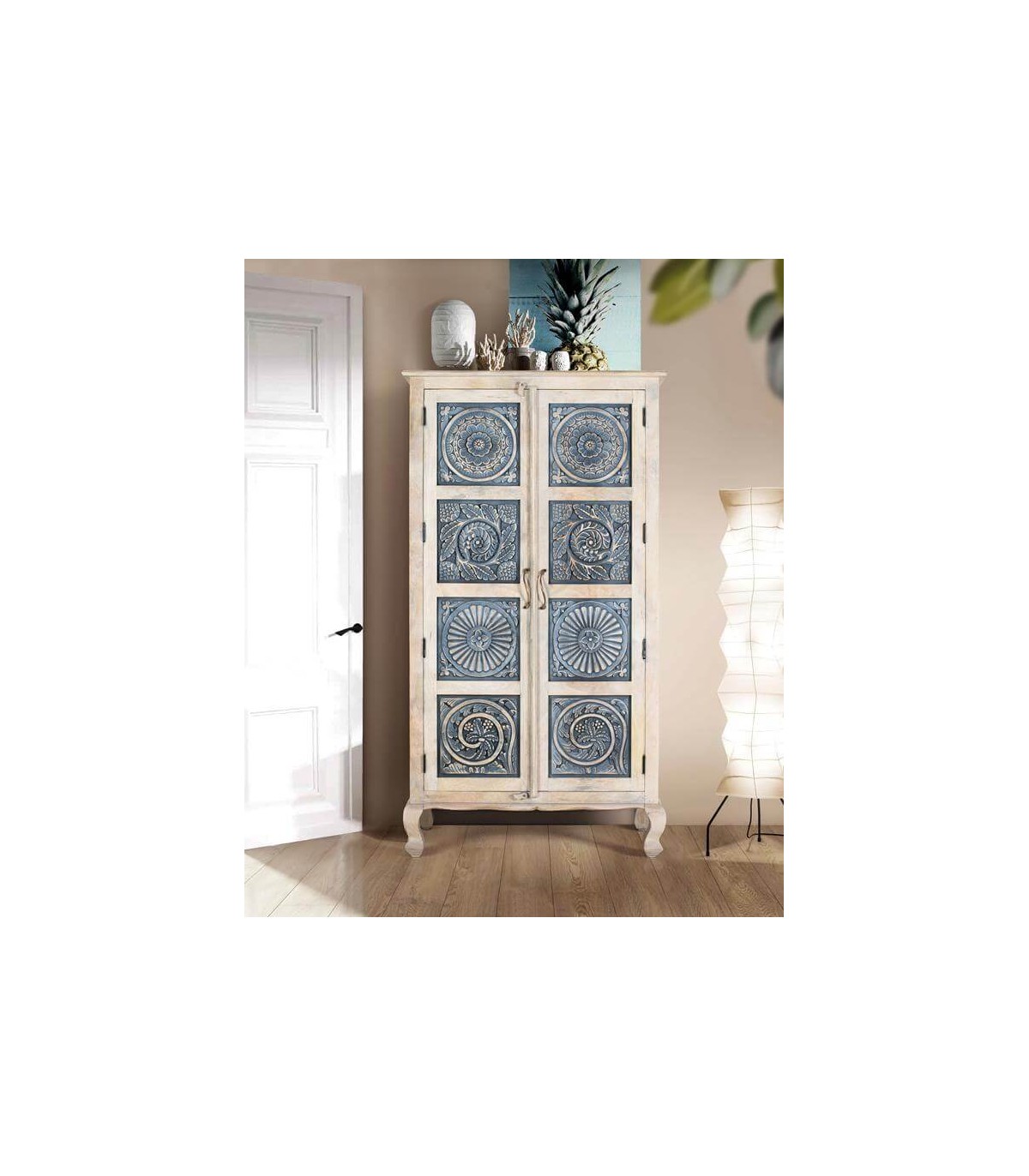 🌿 Armario Alacena de Madera Tallada Natural y Azul – Estilo Étnico Artesanal ✨