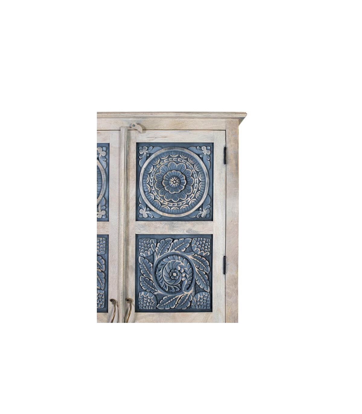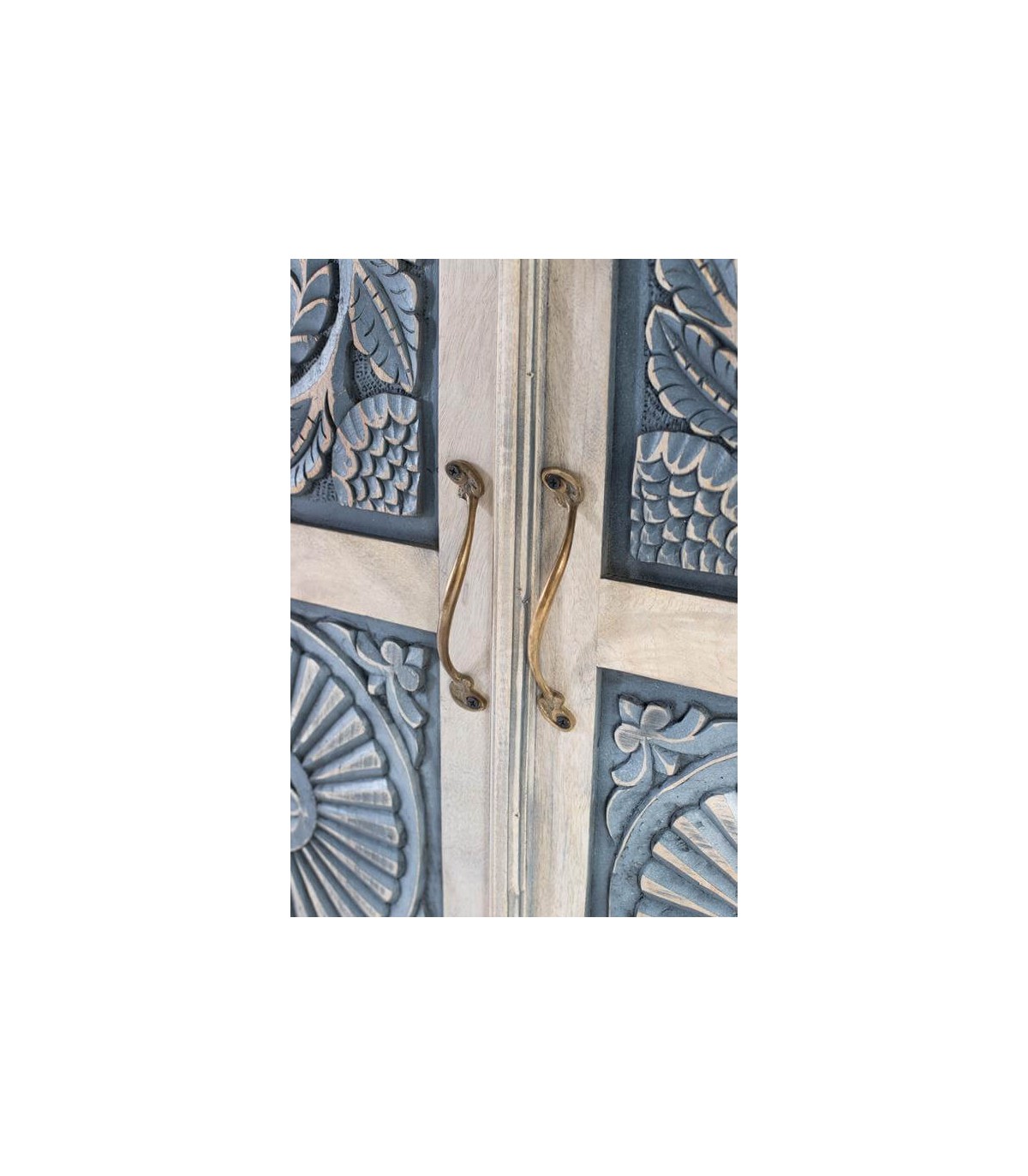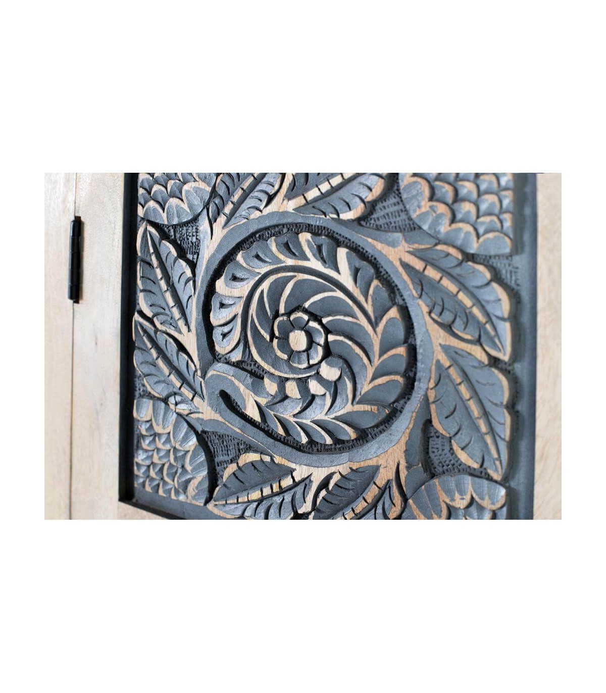 Este armario alacena de dos puertas es una pieza de gran carácter que combina la artesanía tradicional con la funcionalidad contemporánea. Su estructura de madera maciza de mango ofrece resistencia y durabilidad, mientras que los frentes tallados a mano despliegan motivos vegetales y geométricos de aire exótico.