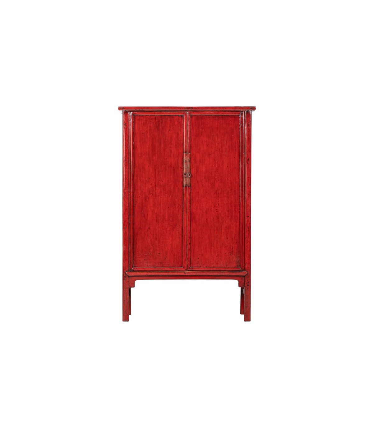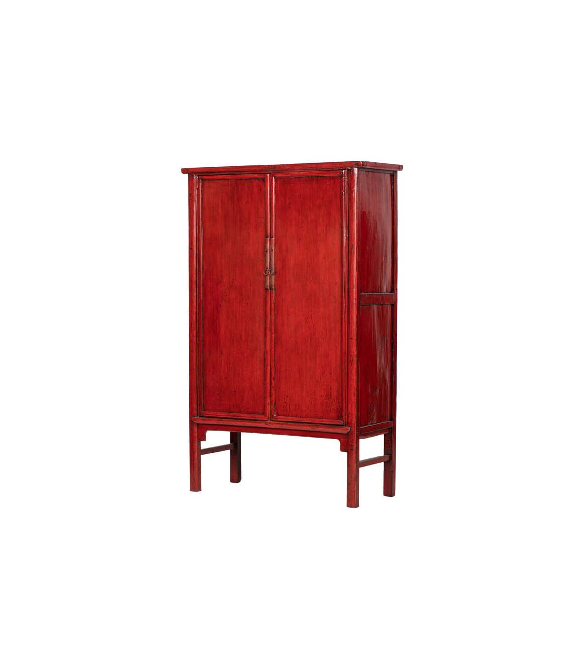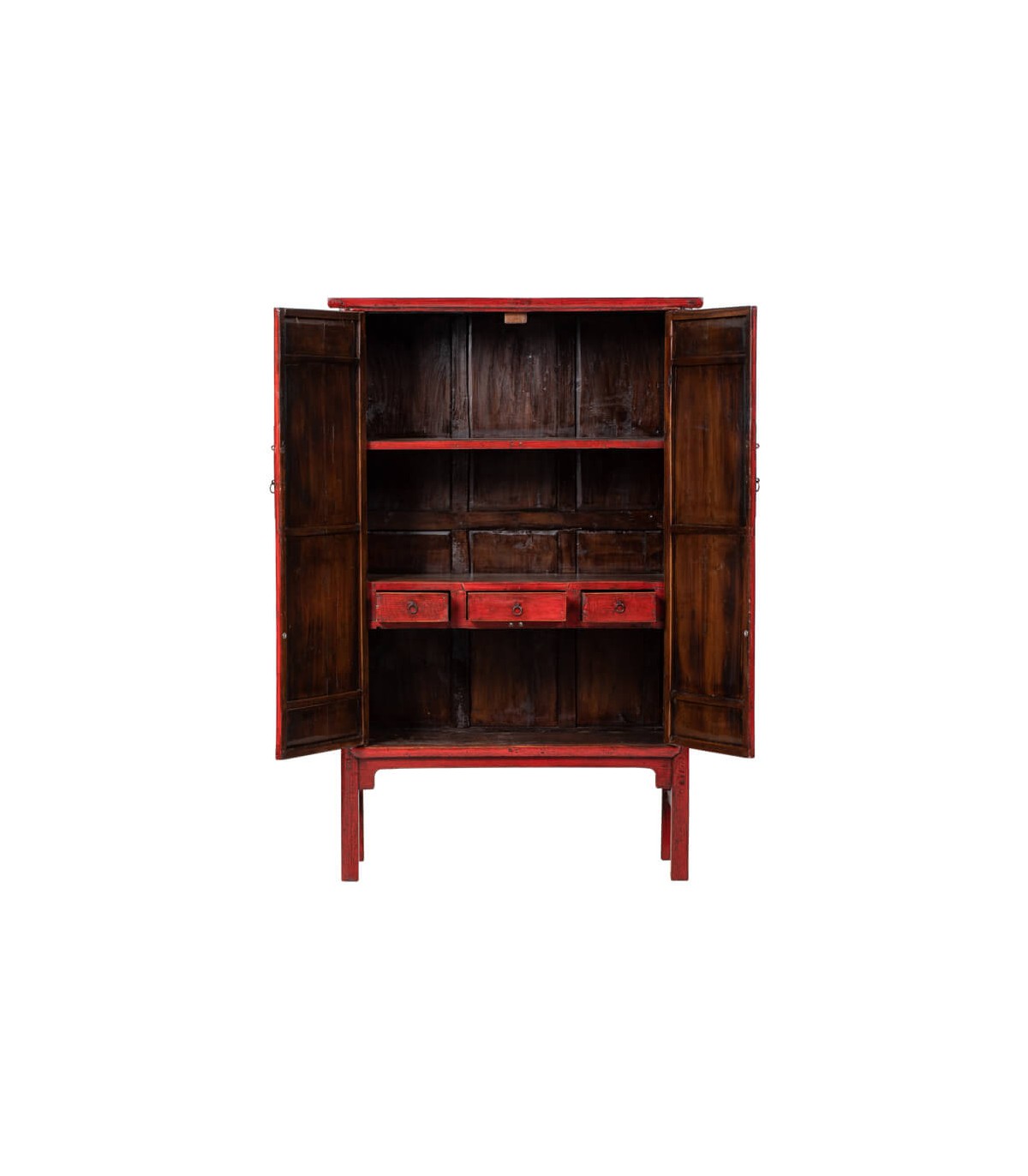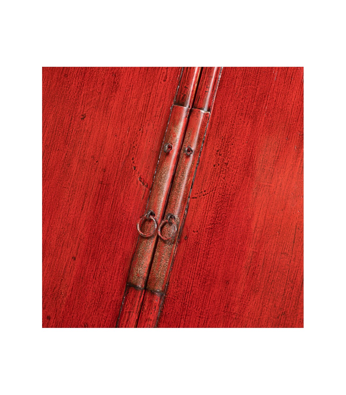 Imponente y refinado, este armario alacena de inspiración oriental es una pieza única que transforma cualquier espacio. Su estructura en madera maciza de pino destaca por el lacado rojo artesanal de acabado brillante, que resalta su carácter exótico y elegante. Con dos puertas altas y tres cajones interiores, combina belleza estética con una gran funcionalidad de almacenaje.