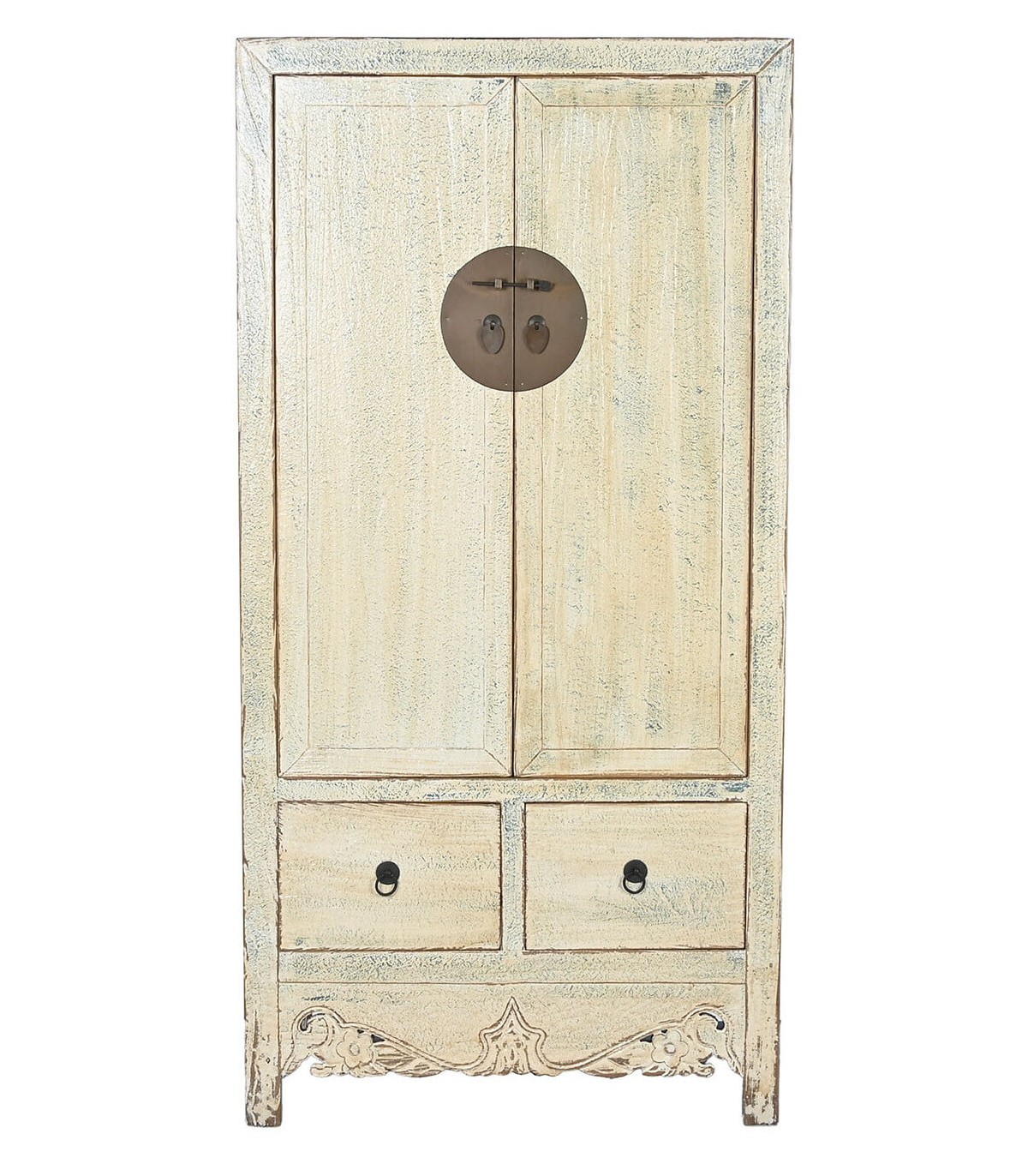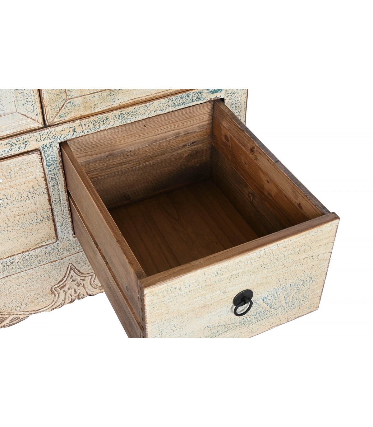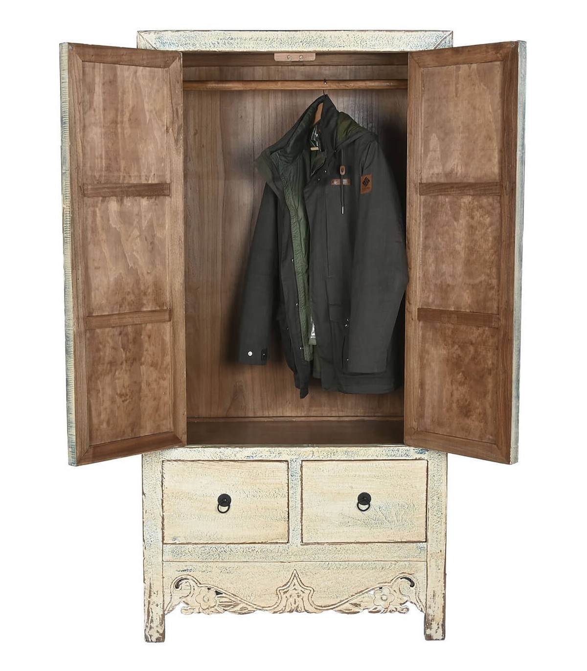 Con un diseño auténtico y carácter artesanal, este armario ropero de inspiración oriental destaca por su estructura compacta con doble puerta, dos cajones inferiores y una barra para colgar en su interior. La madera de abeto maciza tallada a mano revela motivos florales únicos, resaltados por un acabado en blanco roto decapado sobre fondo azul, creando un efecto envejecido lleno de personalidad. Ideal como pieza de acento en dormitorios, vestidores o entradas con alma bohemia.