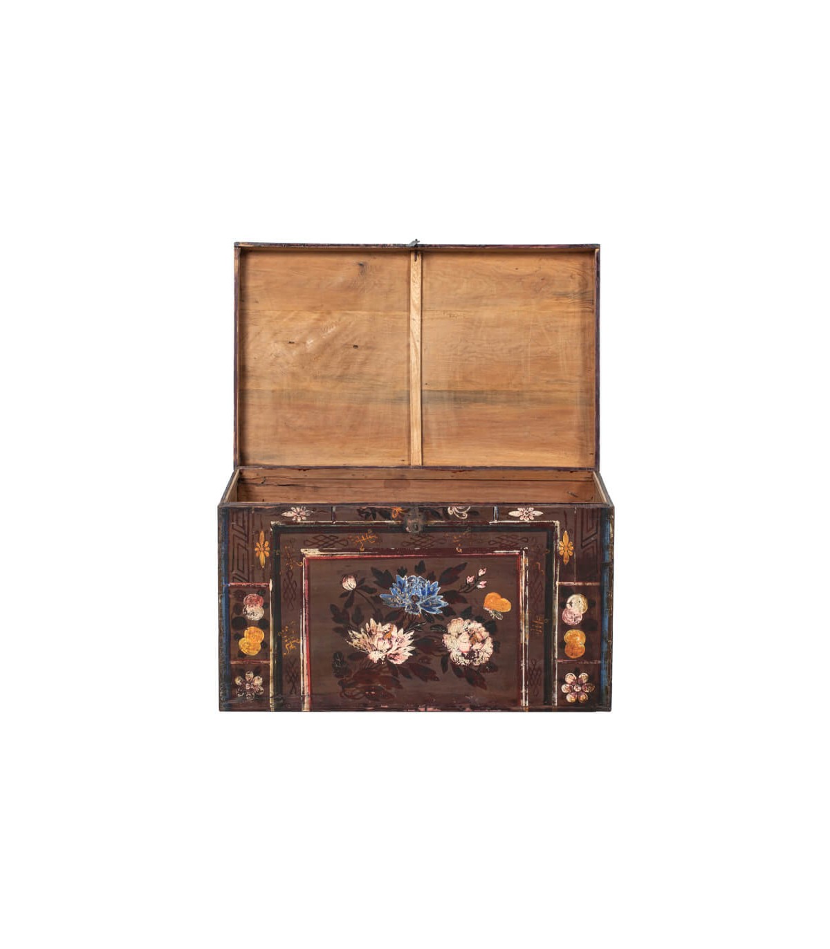 Pieza única de gran valor decorativo, este baúl antiguo destaca por su estructura en madera maciza de álamo y su tapa abatible. La superficie frontal está completamente decorada a mano con motivos florales orientales en tonos intensos, y sus herrajes metálicos de inspiración antigua aportan autenticidad.
