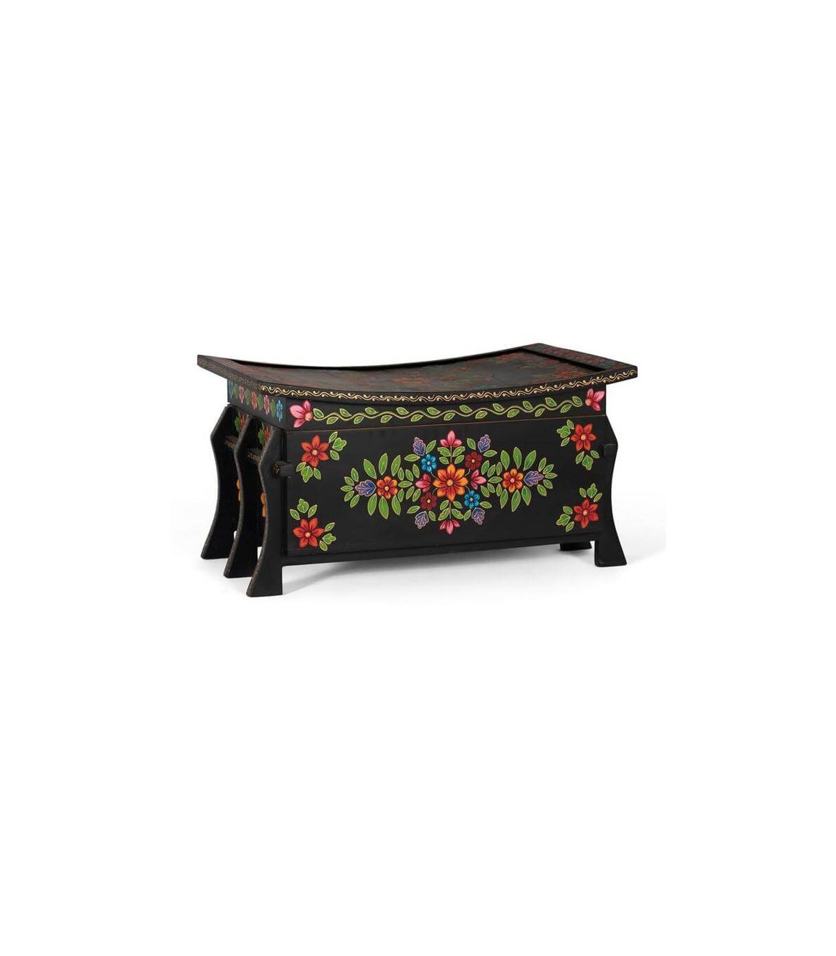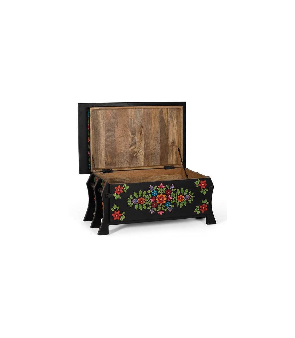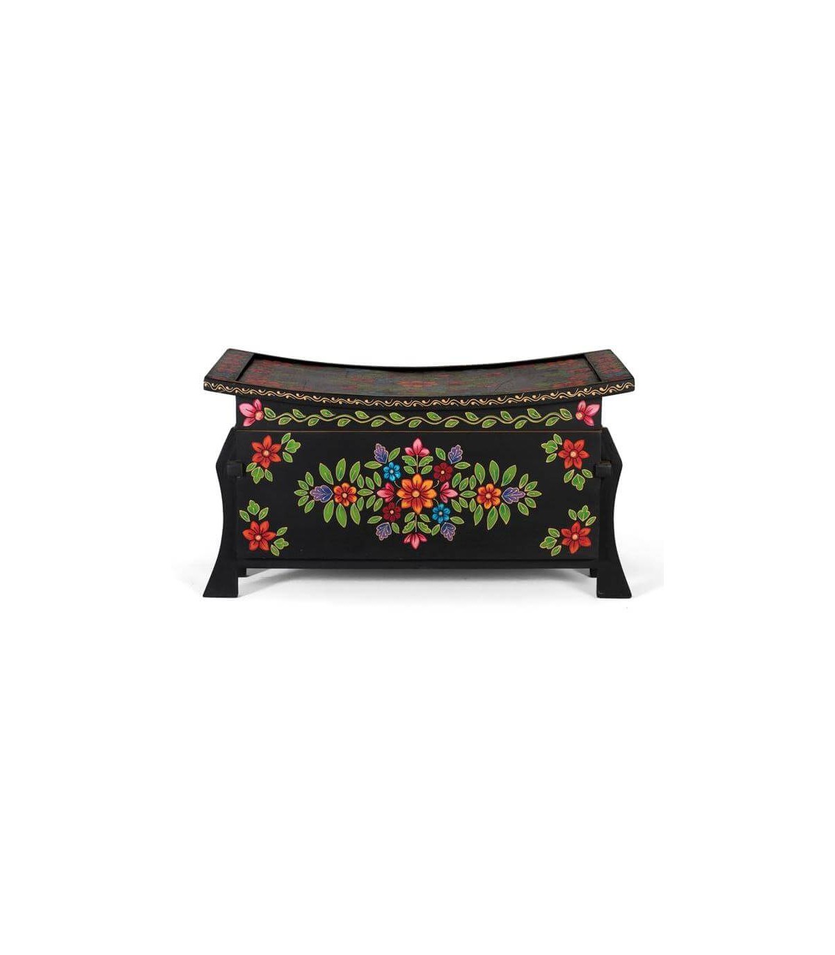 Sumérgete en el color y la tradición con este espectacular baúl artesanal, una pieza que combina funcionalidad y arte popular. Su estructura de madera maciza de mango se ha lacado en negro para resaltar los detalles florales pintados a mano en vivos tonos rojos, verdes, naranjas y azules. El diseño abombado de la tapa aporta un aire exótico, mientras que su interior espacioso lo convierte en una opción ideal para almacenaje.