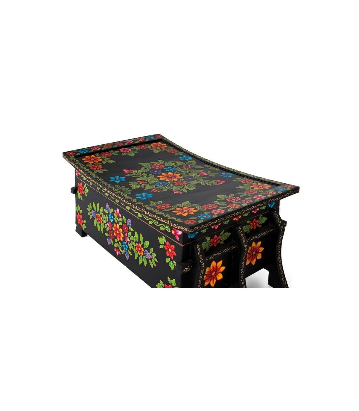 🎨 Acabado: Lacado negro con motivos florales multicolor pintados a mano. Fabricación artesanal. entendemos las variaciones de tonalidad, tamaño y forma o ciertas imperfecciones (grietas, nudos, marcas) como un valor añadido que la convierten en pieza única.