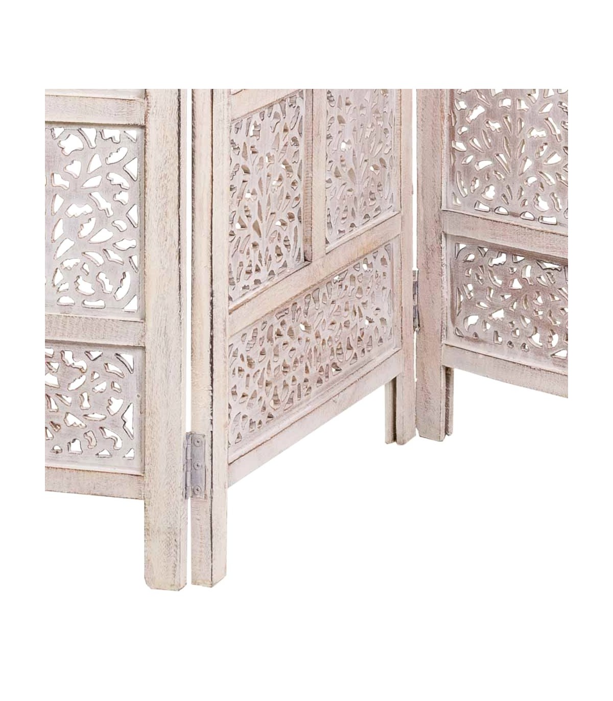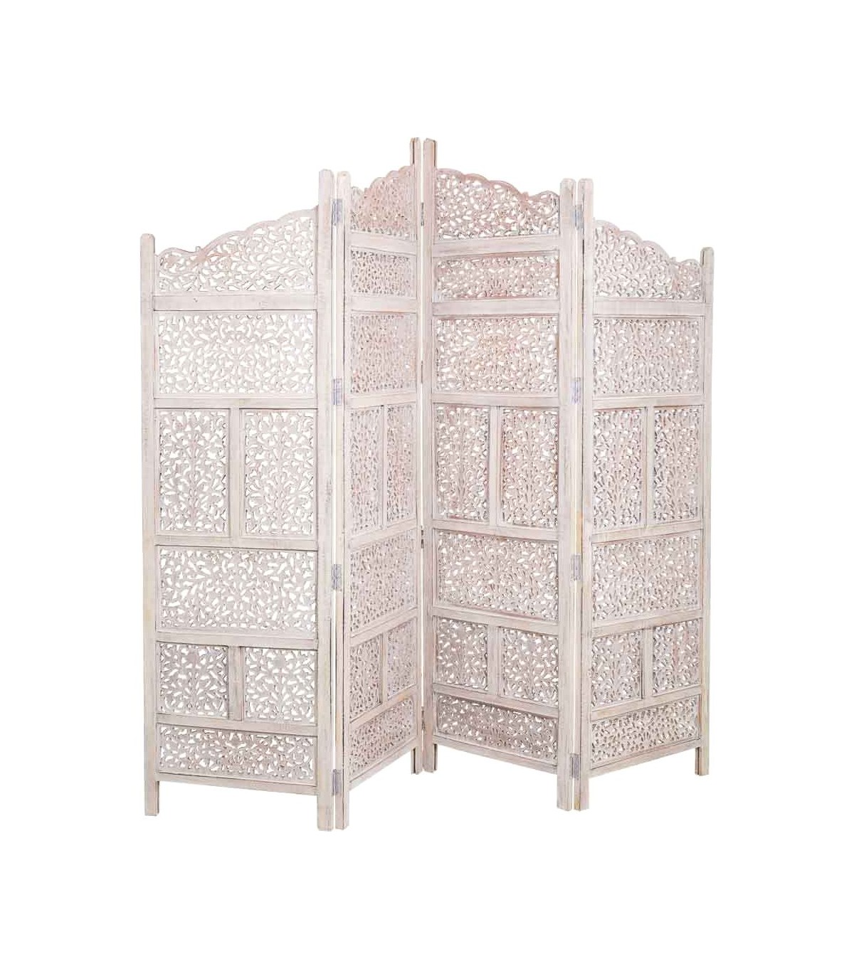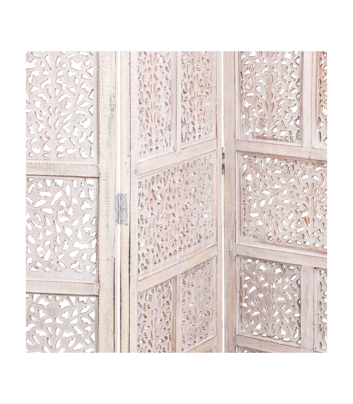 Bonito biombo, de estilo étnico, jugando con el dibujo mediante el calado de la madera, acabado blanco lavado, ideal para separar dos ambientes.