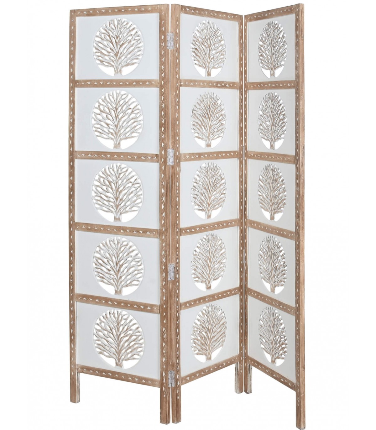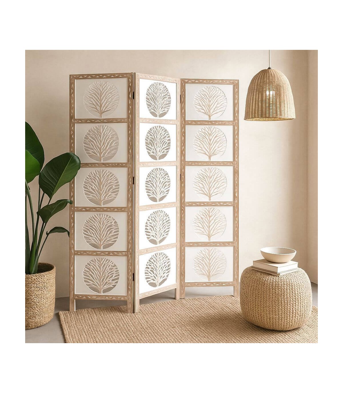 Biombo decorativo de tres hojas fabricado en madera de mango tallada a mano, con motivos de árbol simétrico en acabado natural y blanco rozado. Su diseño calado permite el paso de la luz y crea juegos de sombras elegantes, ideal para dividir espacios con estilo sin recargar el ambiente.