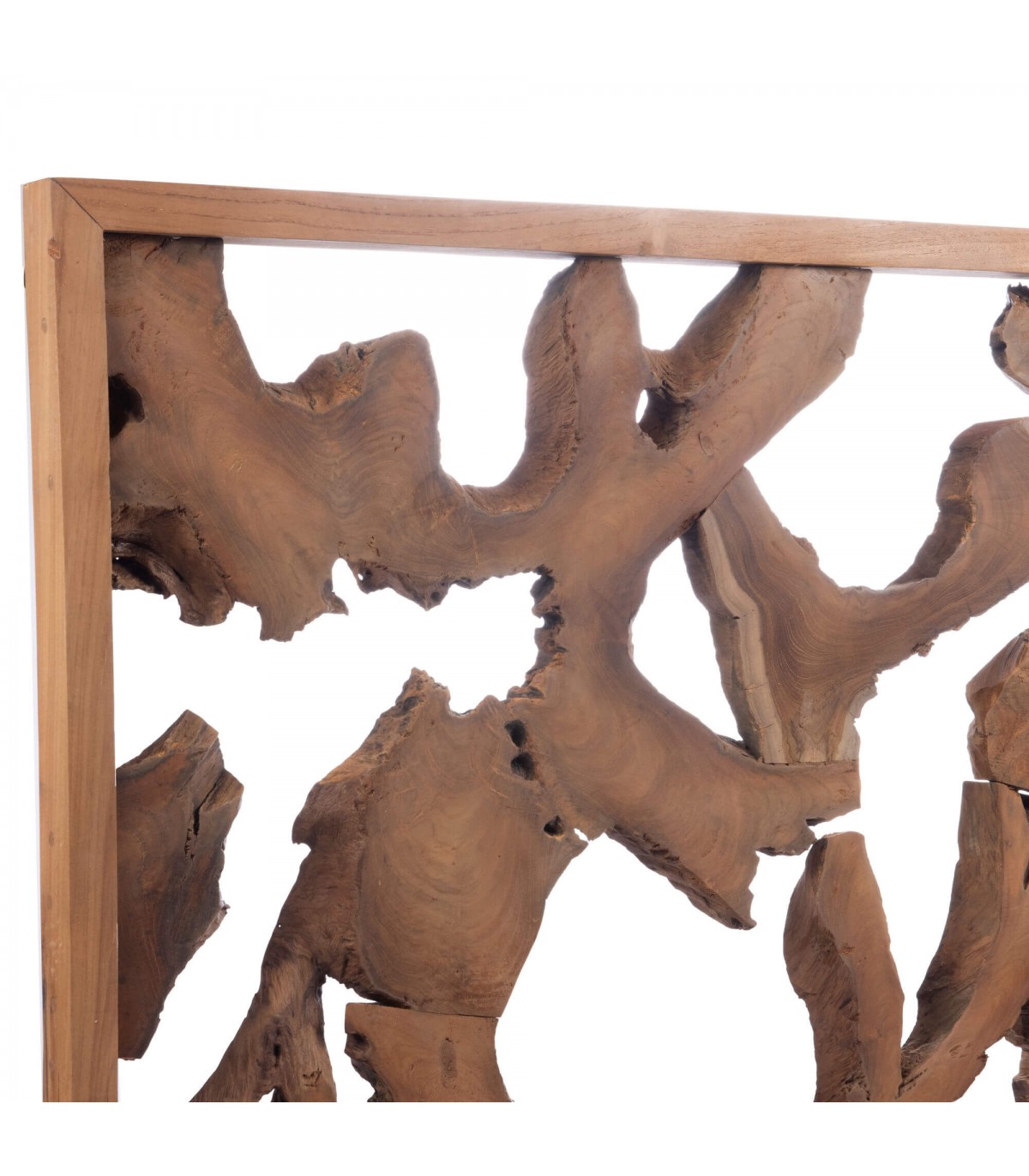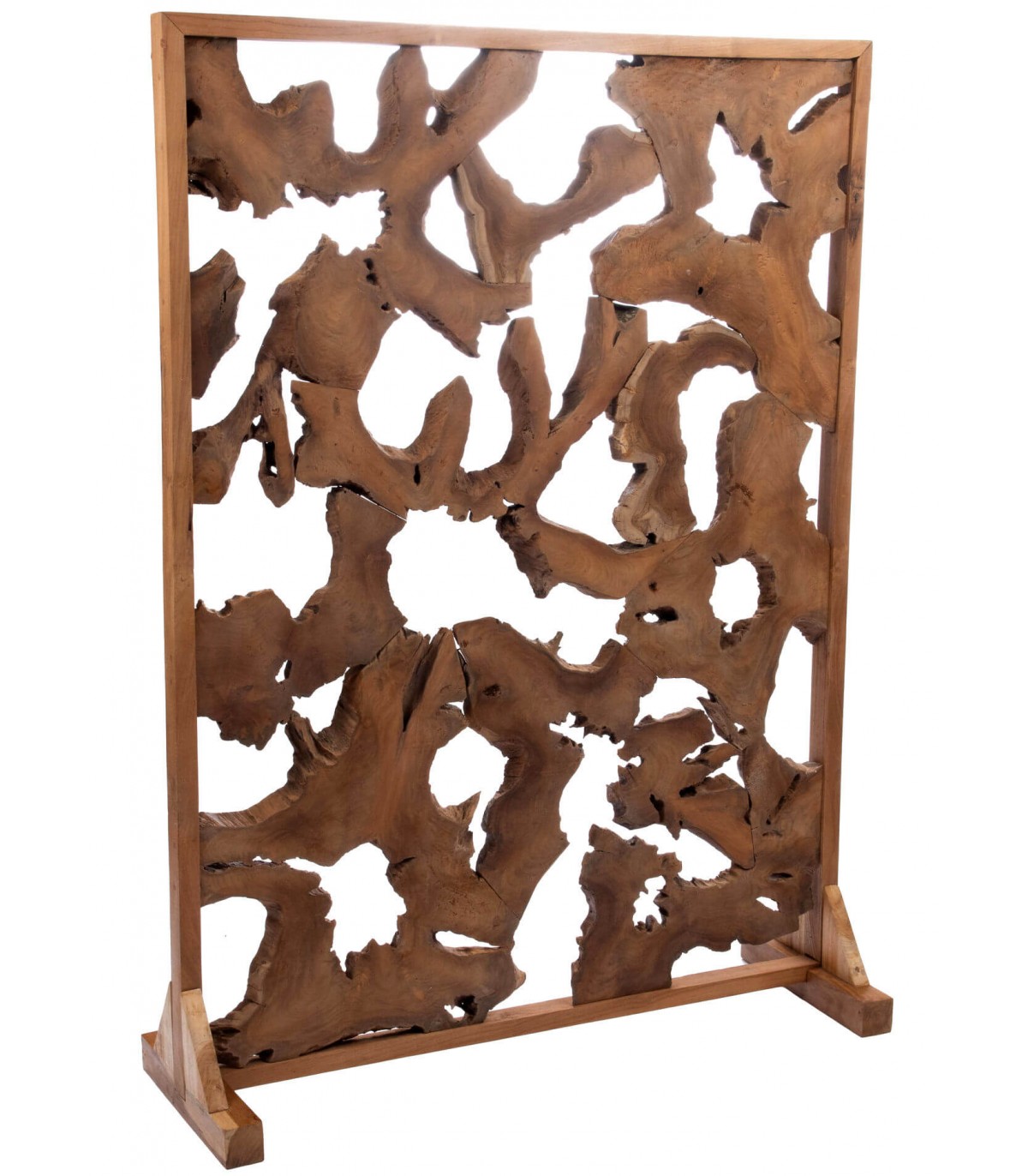 Añade un toque exclusivo y natural a tu hogar con este espectacular biombo paraban, elaborado con un bastidor de madera de pino y auténticos troncos de raíz de teca natural, lo que garantiza que cada pieza sea única e irrepetible. Su diseño artesanal destaca por la belleza de las formas orgánicas de la teca, que aportan un carácter rústico y elegante a cualquier estancia.