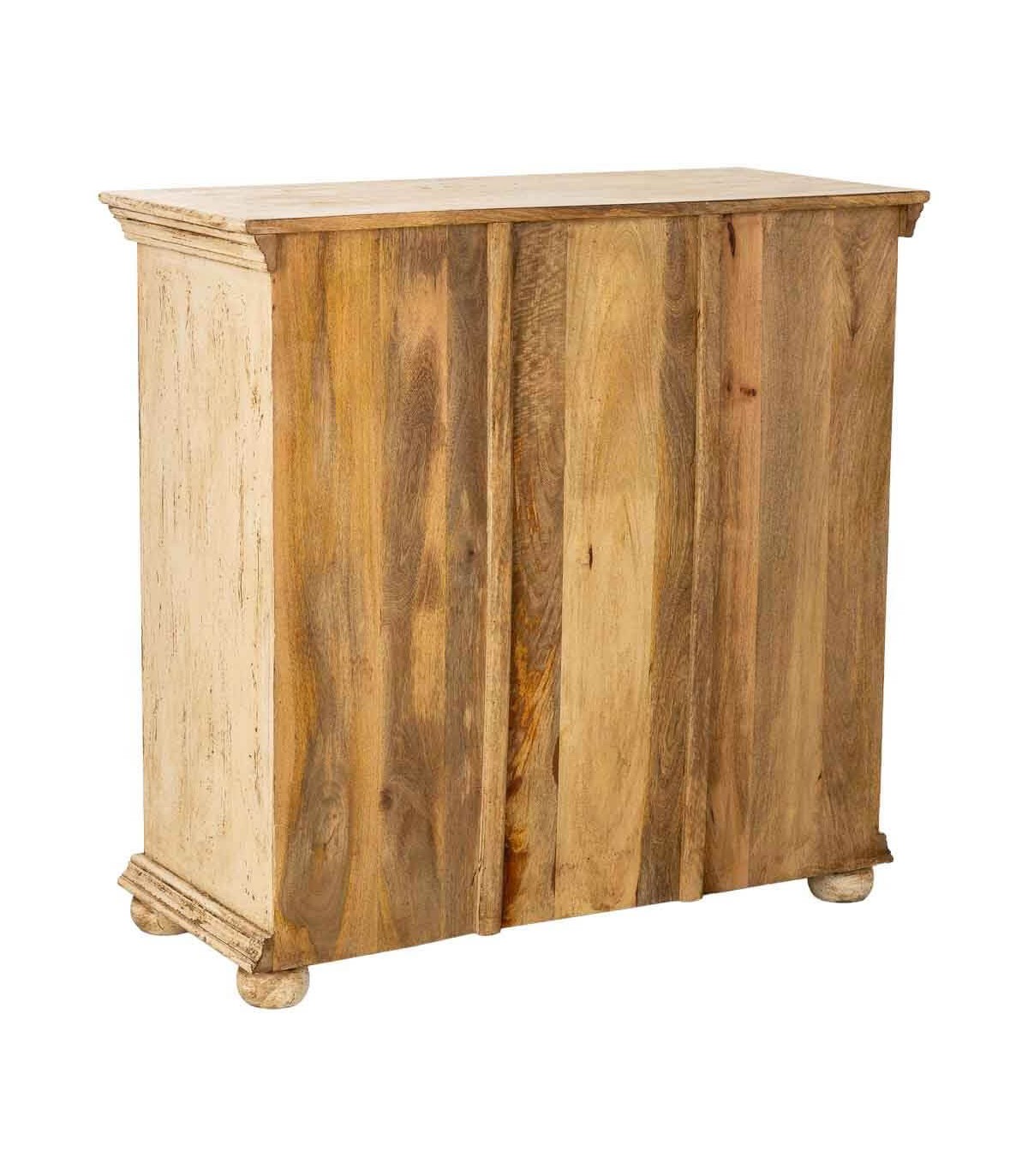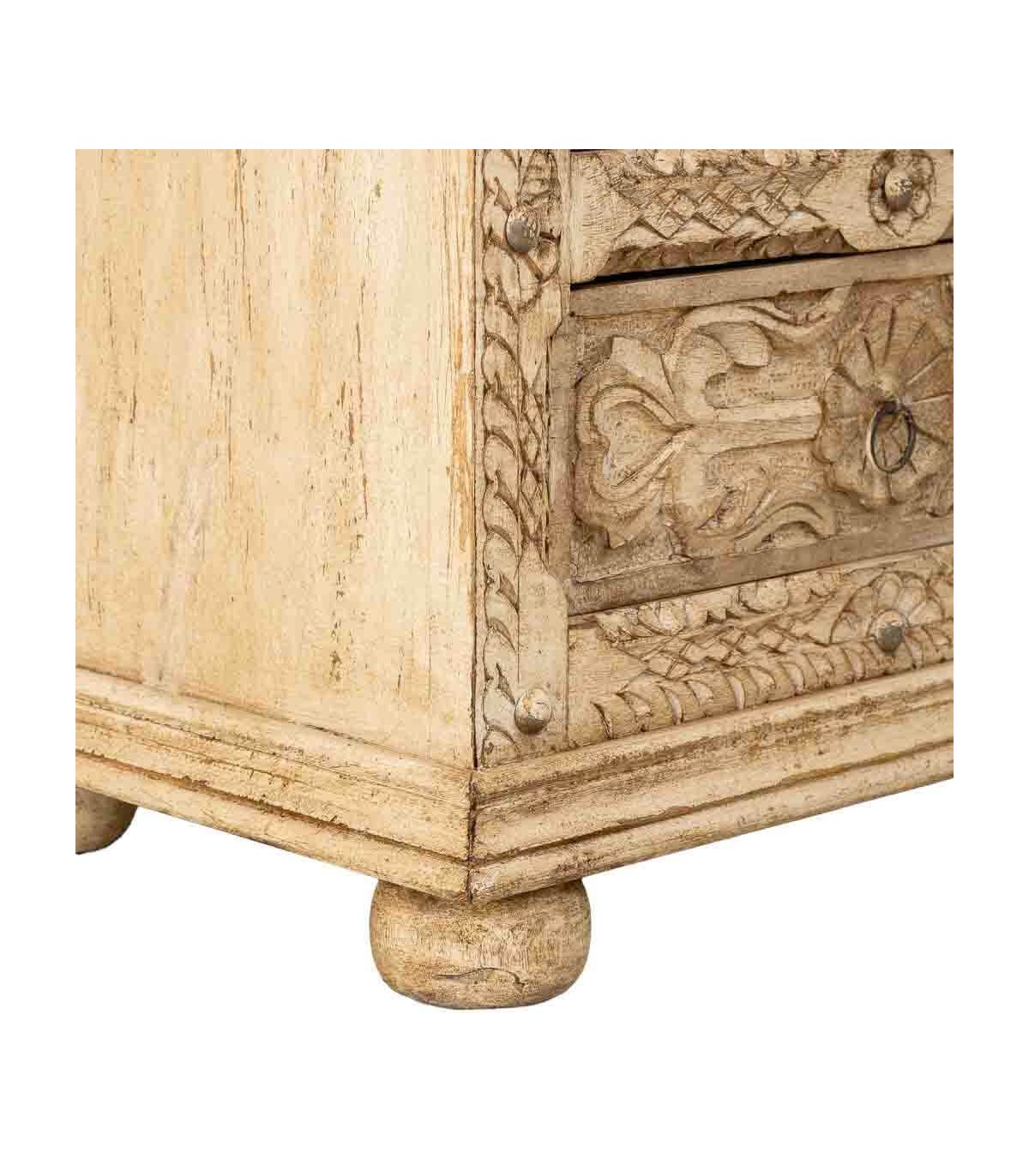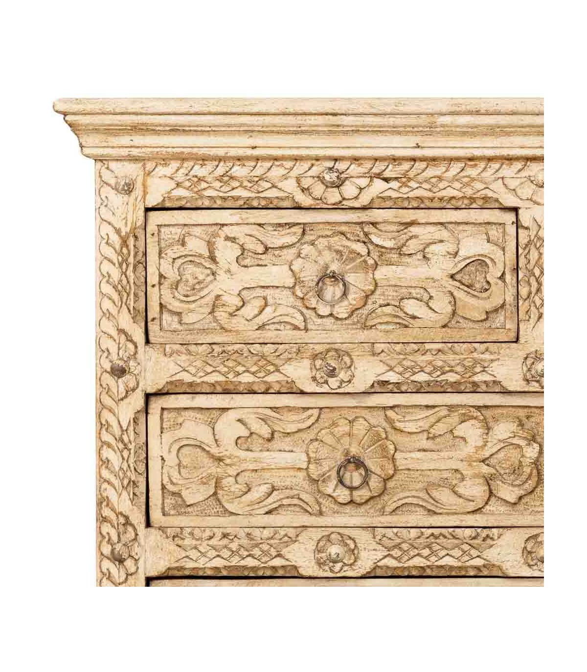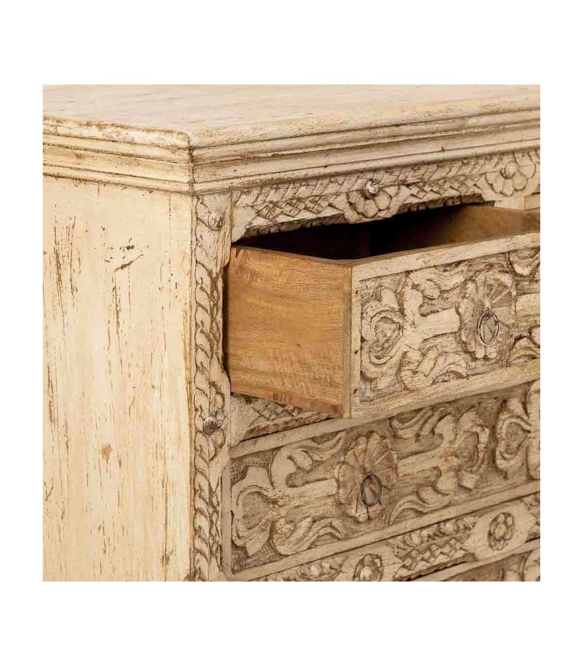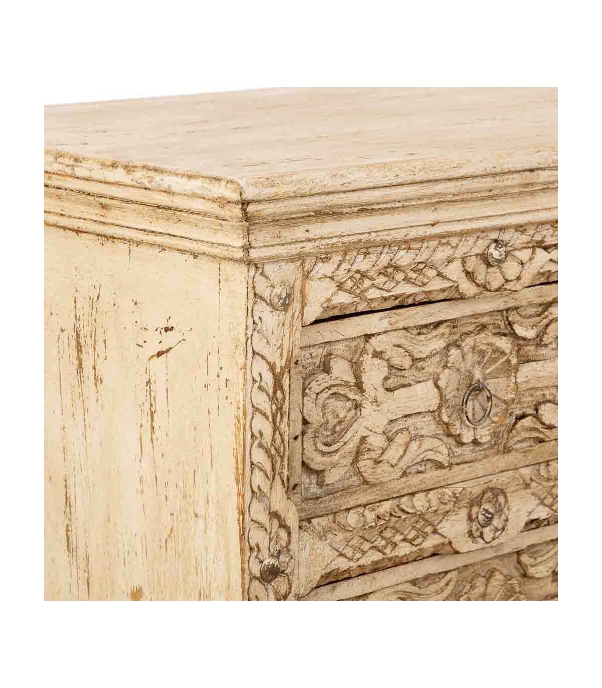 El acabado en blanco roto patinado realza los relieves, generando un contraste de luces y sombras que aporta profundidad y textura al mueble. Sus tiradores metálicos en tono natural se integran de manera sutil, manteniendo la estética artesanal y étnica de la pieza. Una opción ideal para quienes buscan almacenamiento práctico sin renunciar al encanto decorativo.