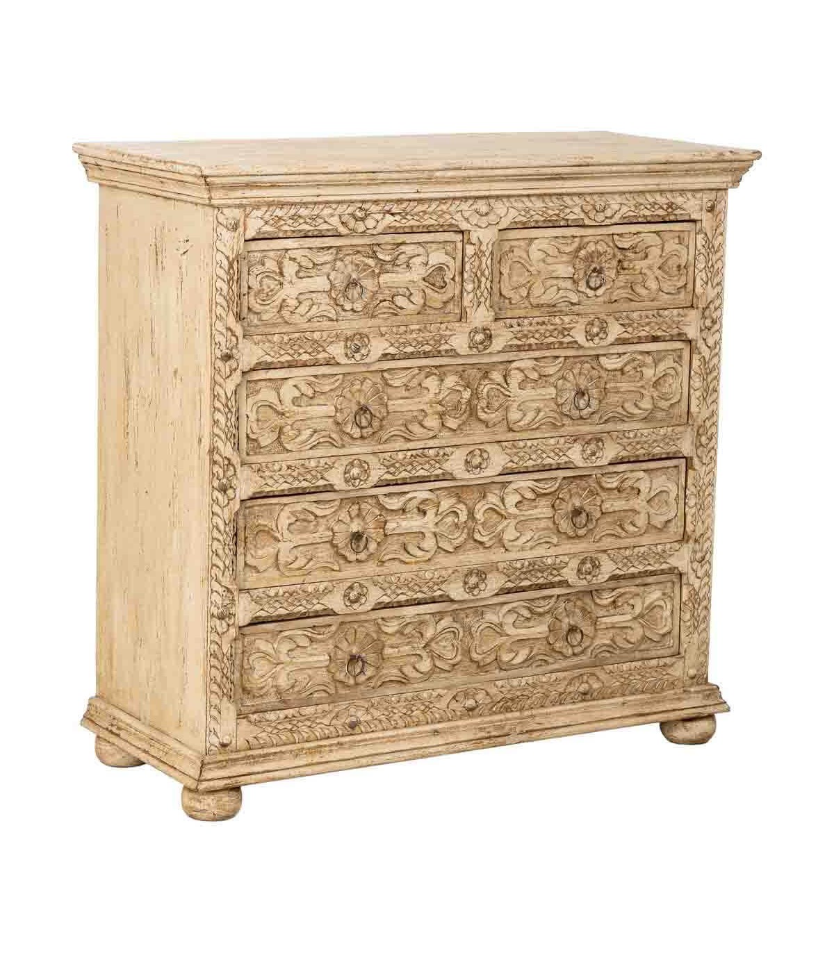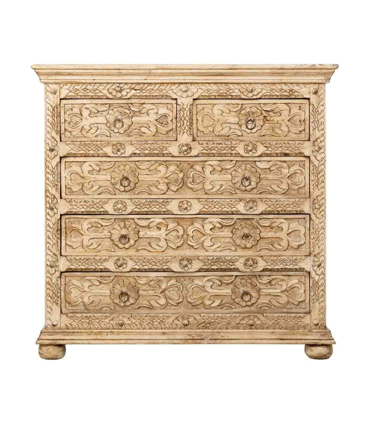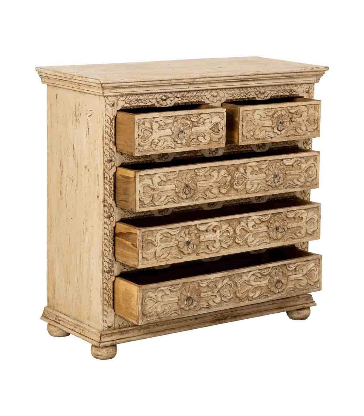 Esta cómoda de cinco cajones destaca por su diseño artesanal y lleno de carácter. La estructura robusta de madera maciza de mango combina resistencia y calidez, mientras que la talla manual de sus frentes aporta un aire exótico y refinado.