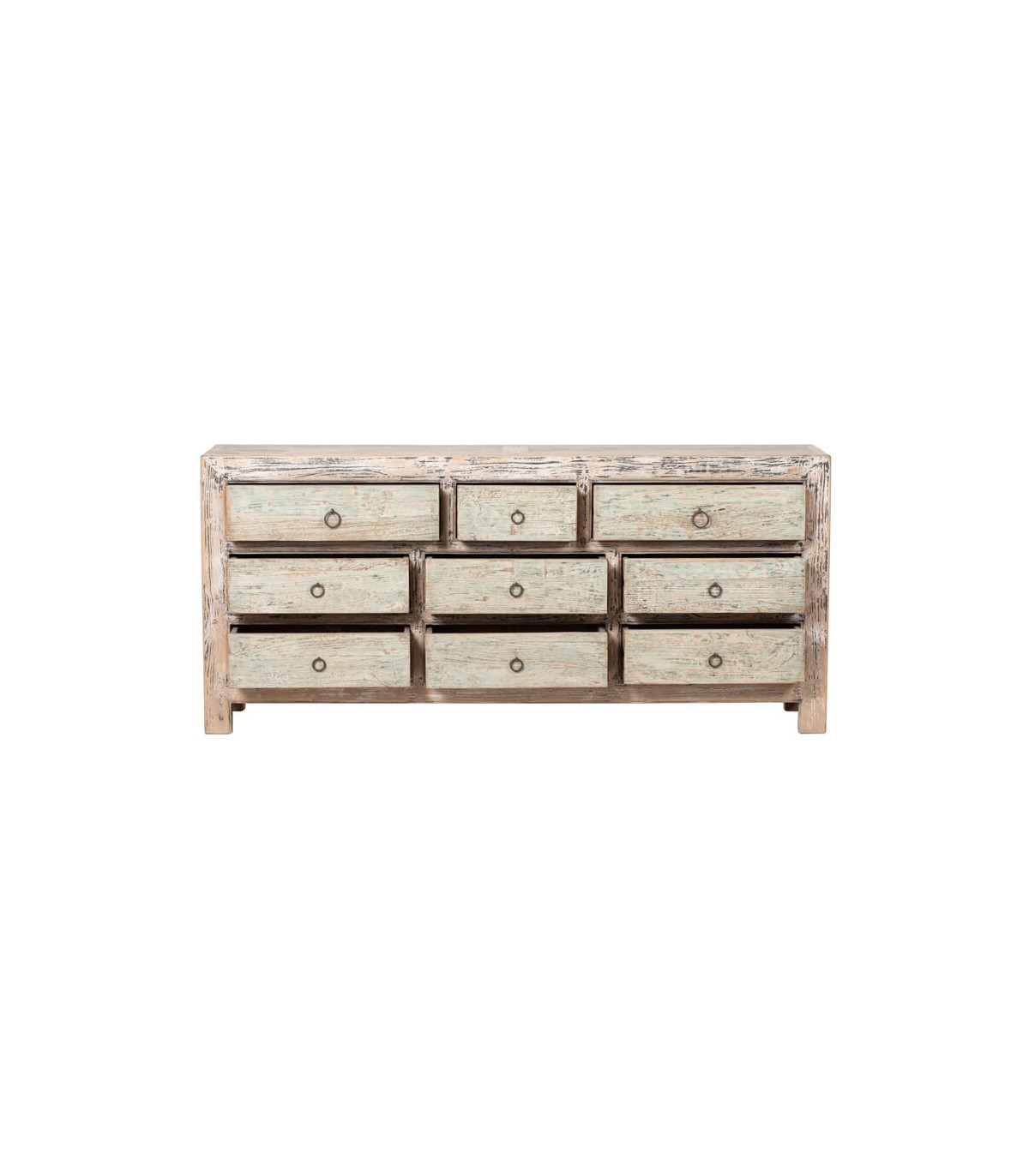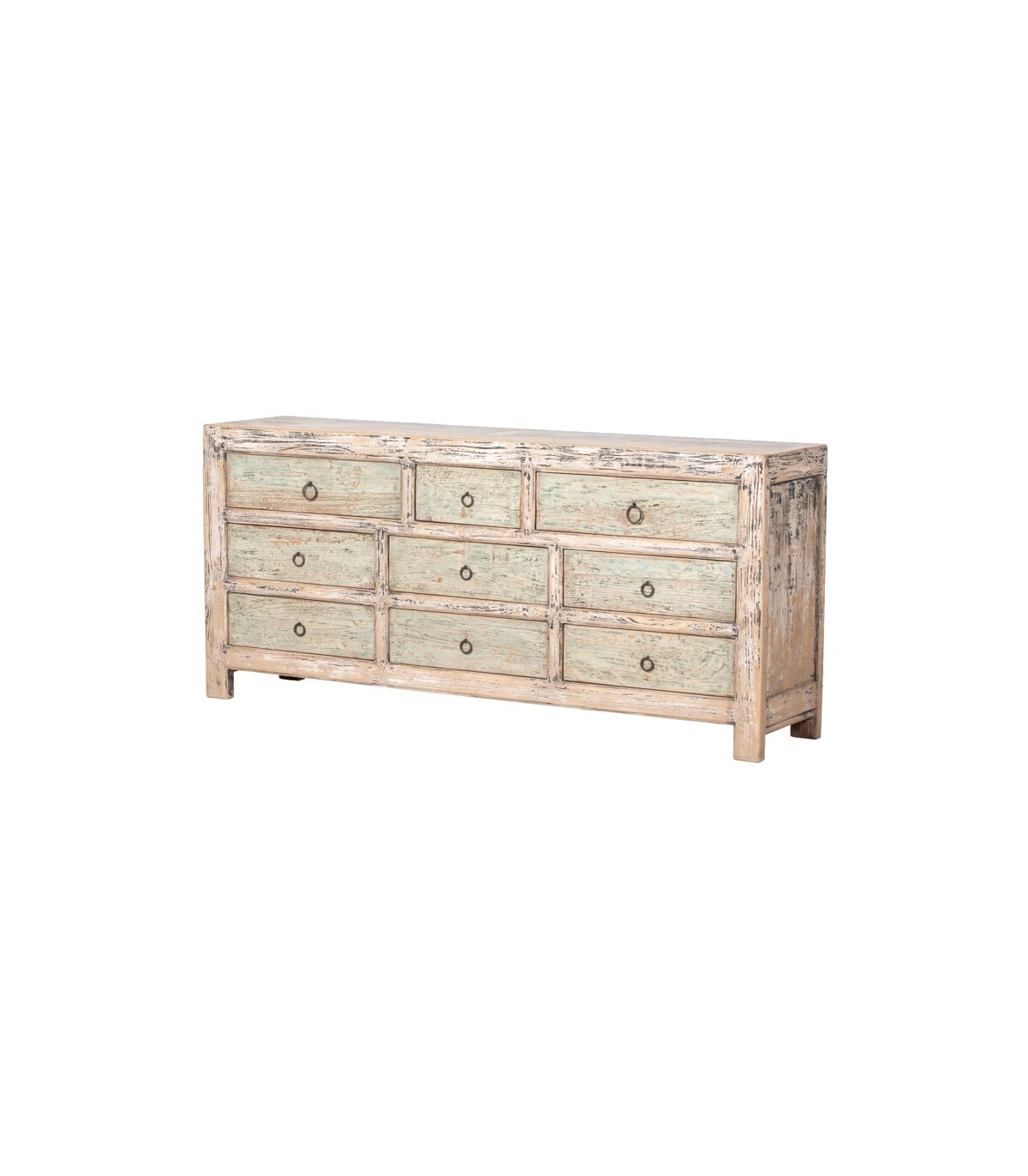 Descubre el carácter del mueble oriental con esta cómoda XXL de madera maciza de pino. Su acabado decapado en turquesa y negro le da un aire artesanal y auténtico. Cuenta con nueve cajones con tiradores de anilla en bronce, perfectos para mantener todo en orden.