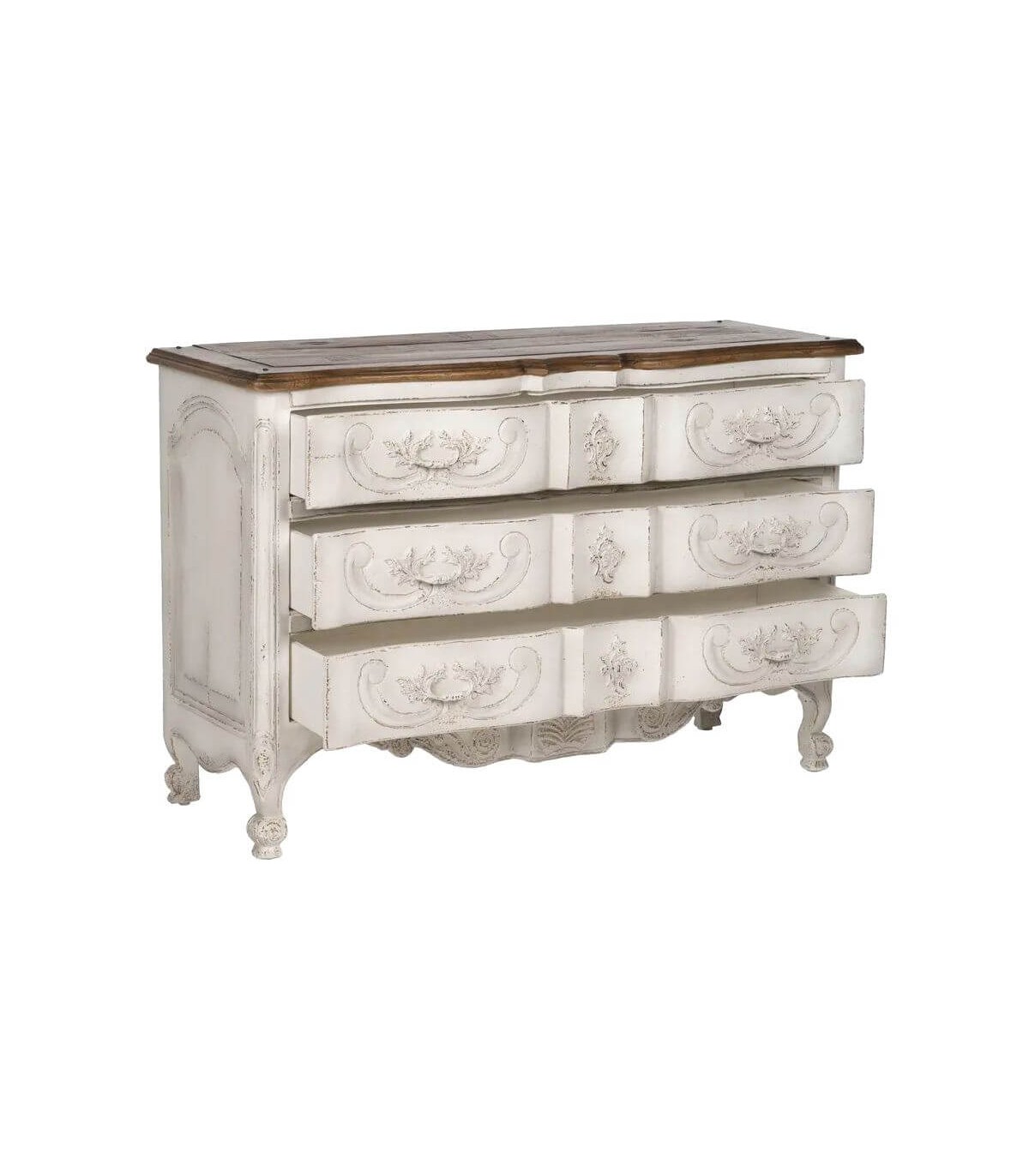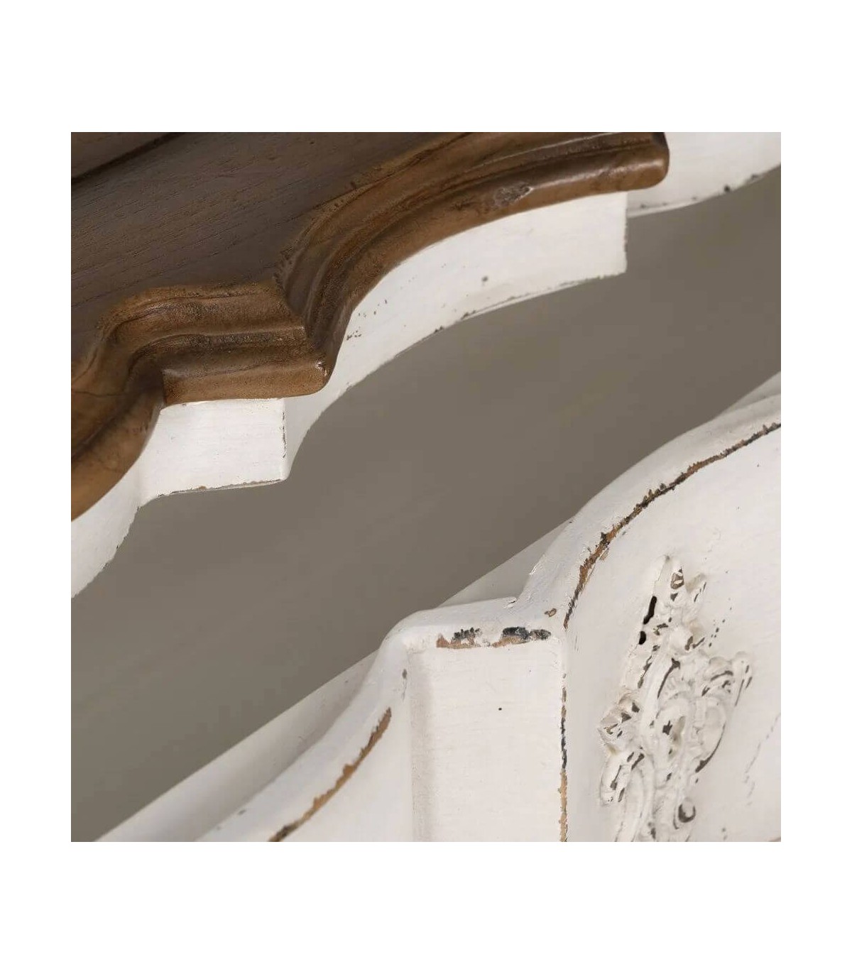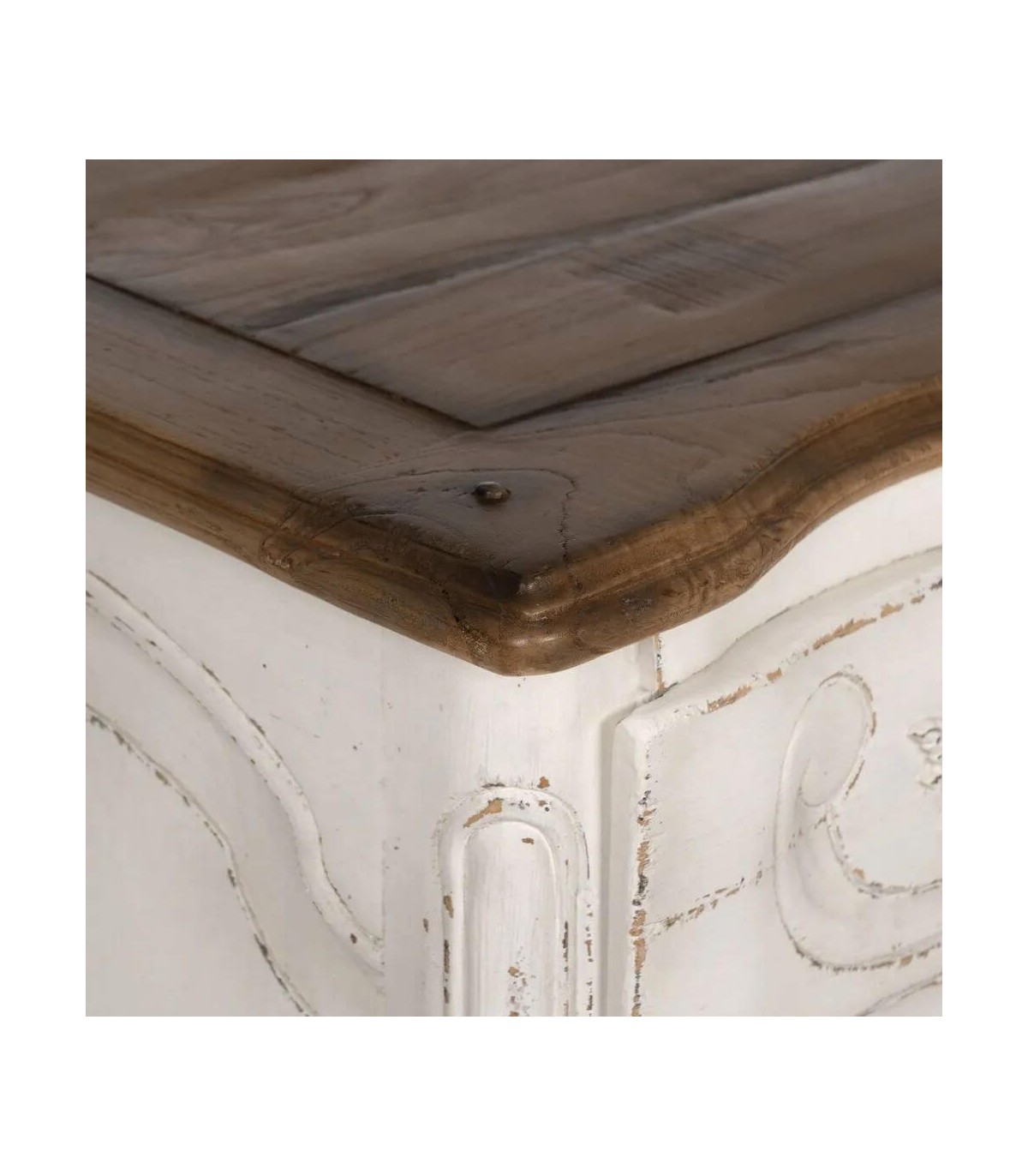 Añade un toque de elegancia atemporal a tu hogar con esta cómoda de madera maciza de mindi. Su diseño clásico con detalles tallados a mano y su acabado en blanco rozado le otorgan un aire sofisticado y vintage. La tapa en tono nogal envejecido aporta calidez y contraste, realzando su belleza artesanal. Con tres cajones espaciosos, ofrece una solución de almacenamiento perfecta para organizar tu espacio con estilo.