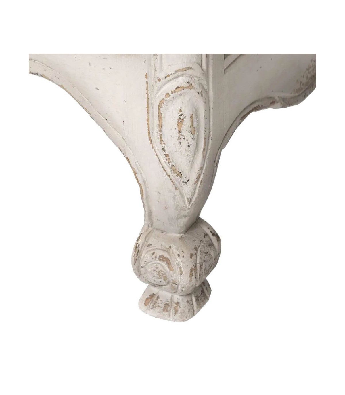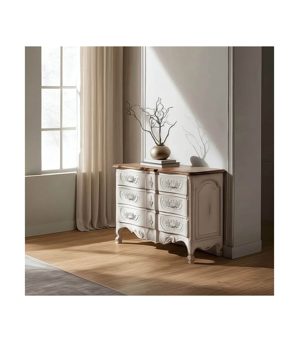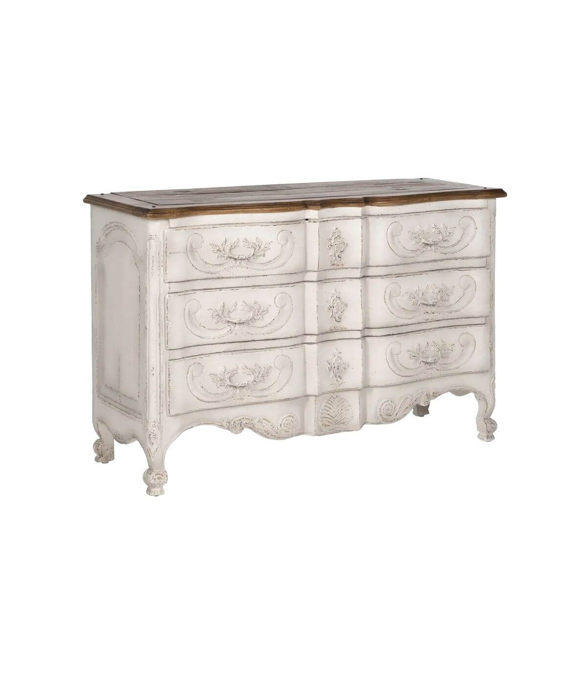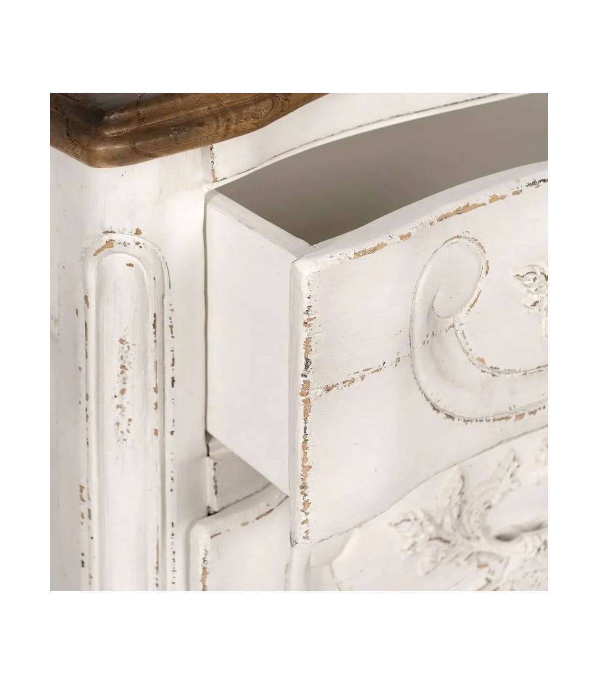 Añade un toque de elegancia atemporal a tu hogar con esta cómoda de madera maciza de mindi. Su diseño clásico con detalles tallados a mano y su acabado en blanco rozado le otorgan un aire sofisticado y vintage. La tapa en tono nogal envejecido aporta calidez y contraste, realzando su belleza artesanal. Con tres cajones espaciosos, ofrece una solución de almacenamiento perfecta para organizar tu espacio con estilo.
