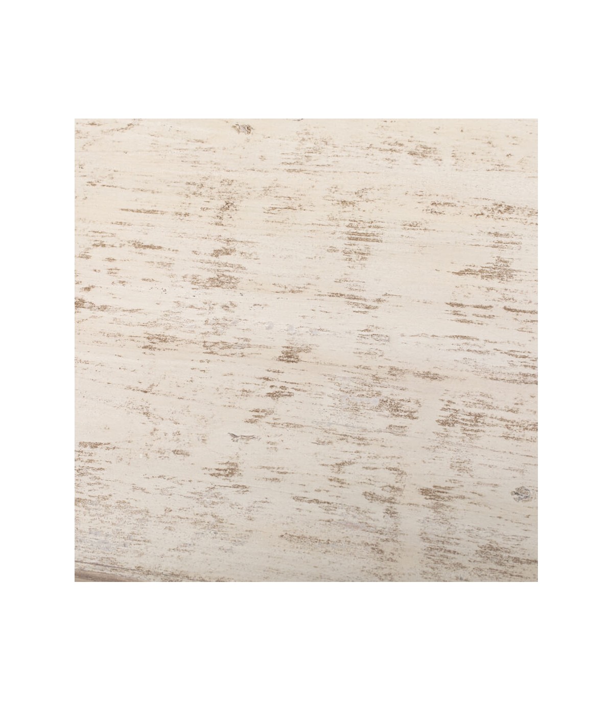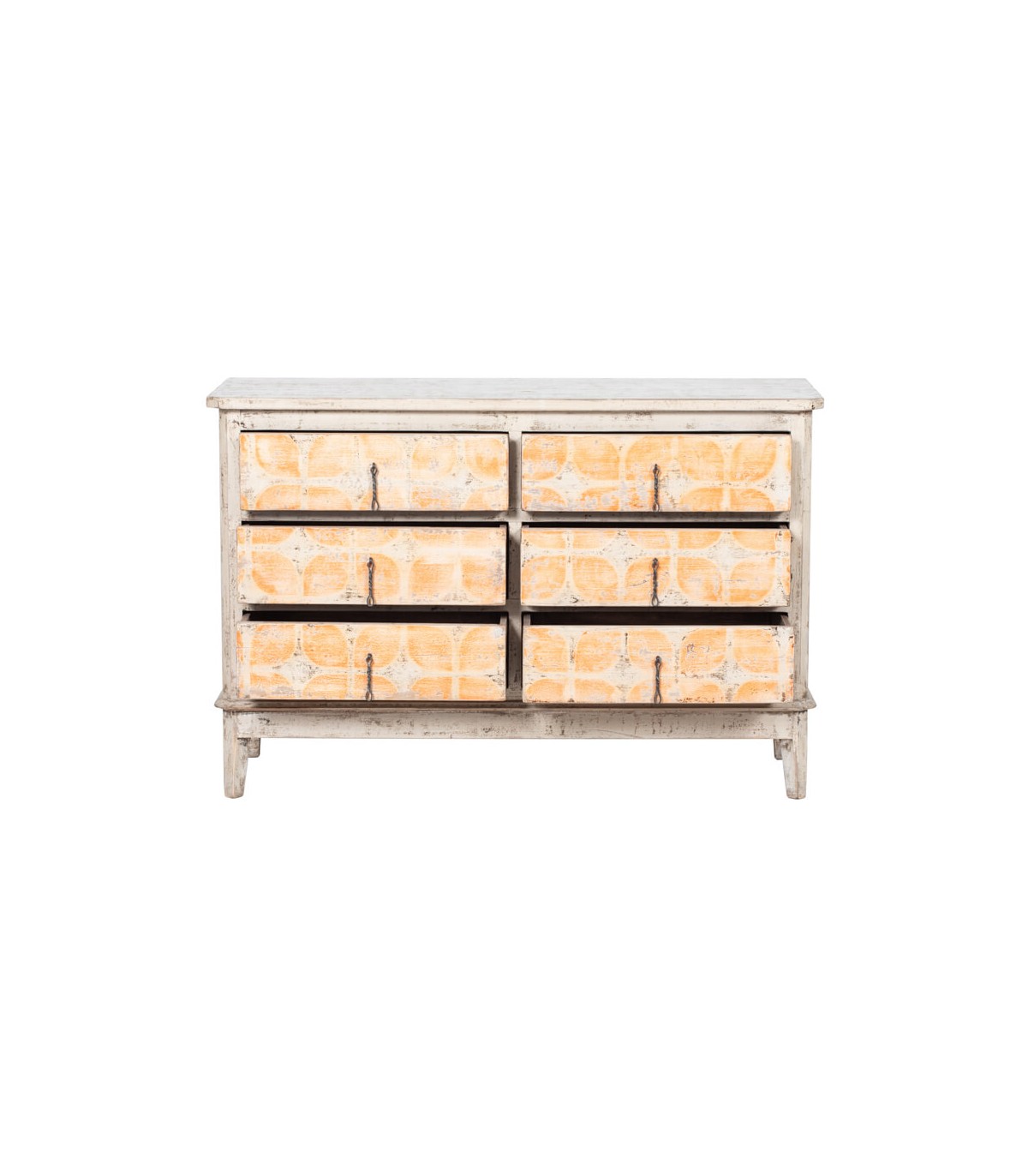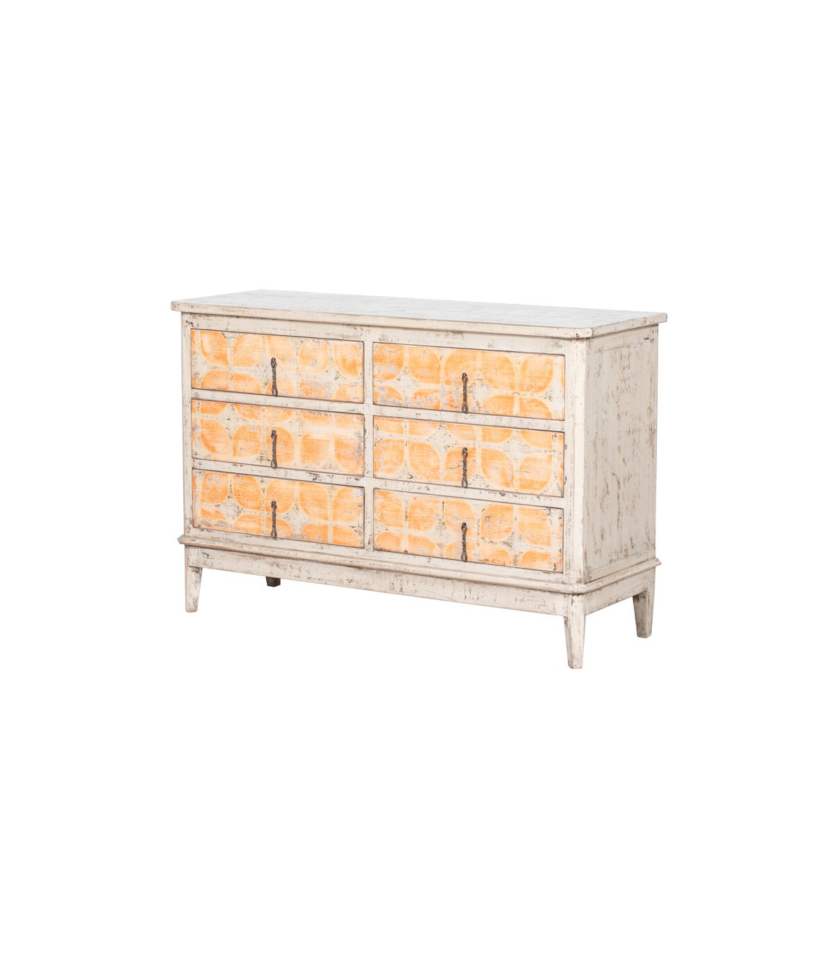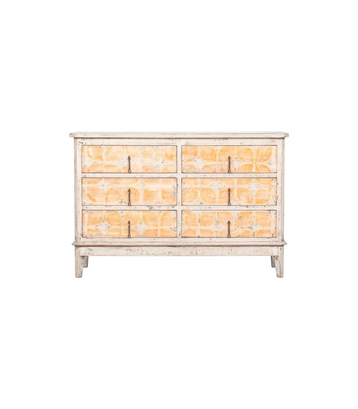 El encanto del trabajo artesanal se refleja en esta preciosa cómoda de seis cajones, fabricada en madera maciza de pino con un acabado blanco rozado de aspecto envejecido. Los frentes están decorados a mano en un vibrante tono amarillo con formas geométricas, aportando un aire alegre y exótico que destaca en cualquier estancia.