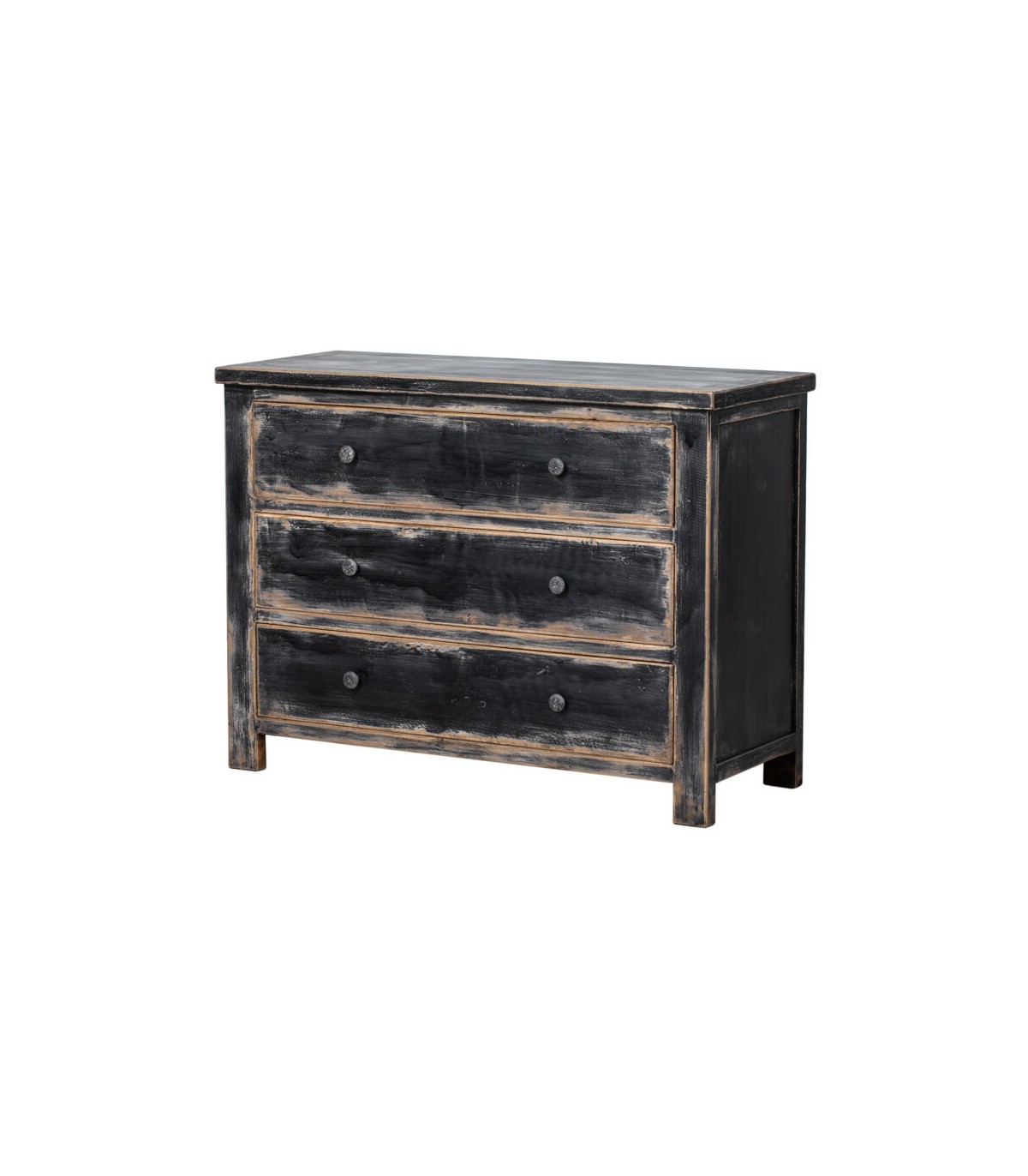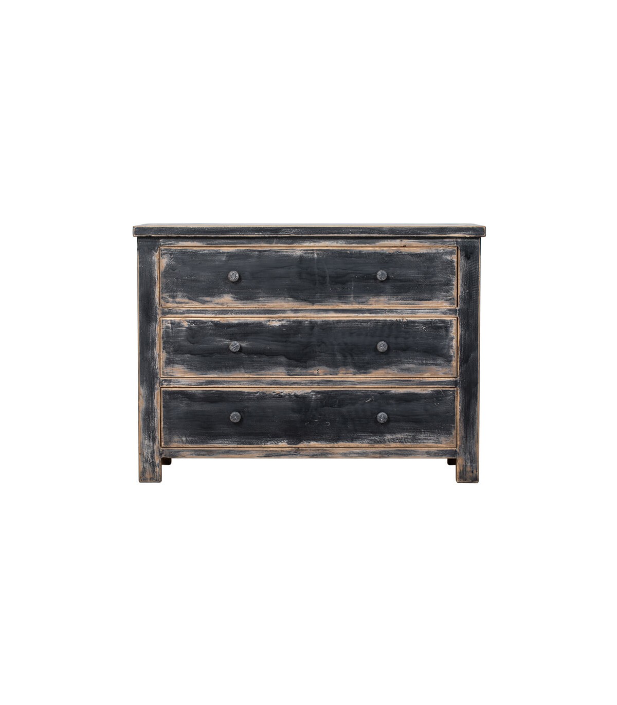 🧿 Cómoda Oriental Chic de Madera de Olmo – Acabado Negro Rozado con 3 Cajones Amplios ✨