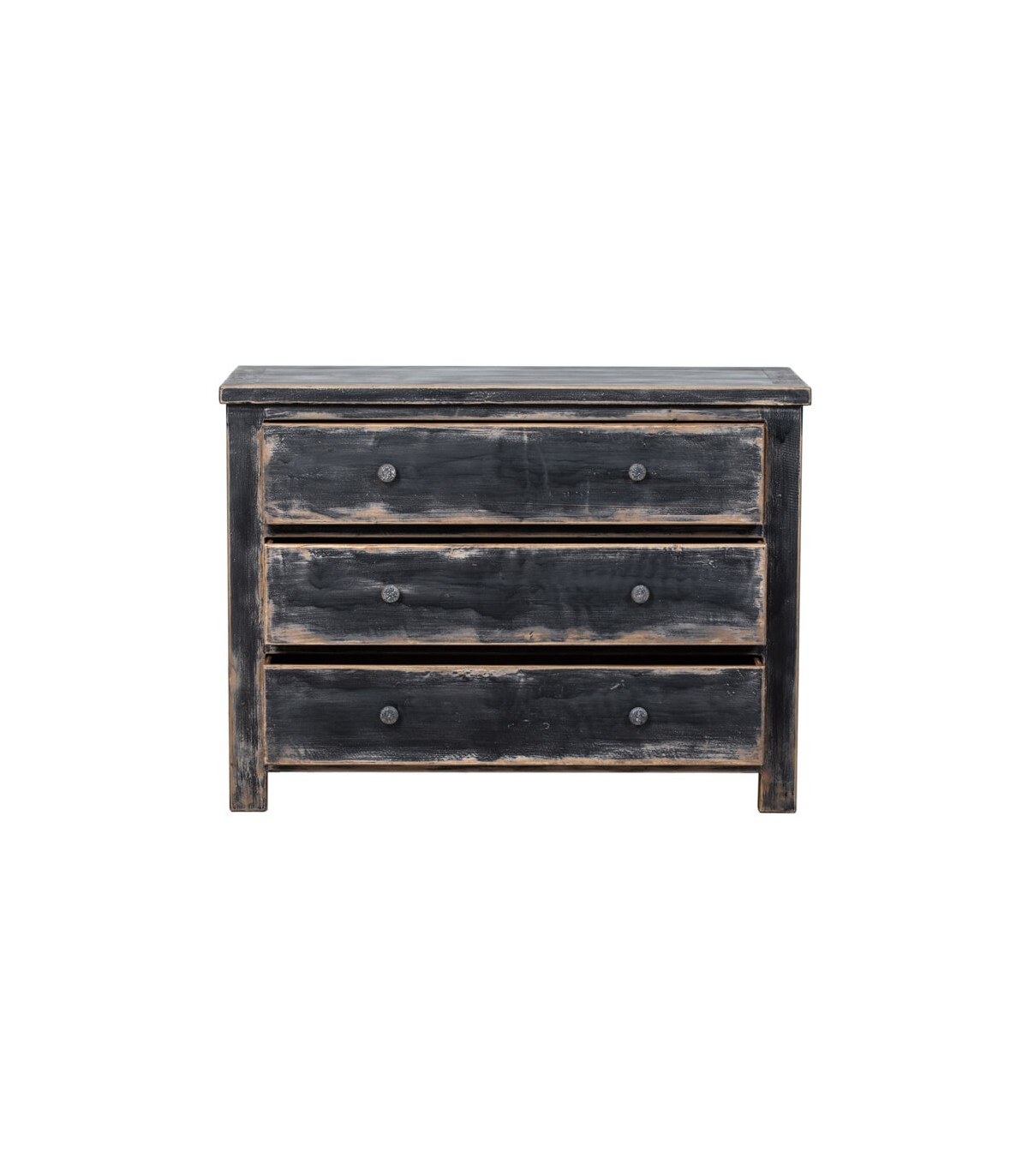 Añade carácter y funcionalidad a tu espacio con esta imponente cómoda de madera maciza de olmo. Su diseño rectilíneo se realza con un espectacular acabado negro rozado que deja entrever la veta natural, aportando un aire envejecido con mucha personalidad.