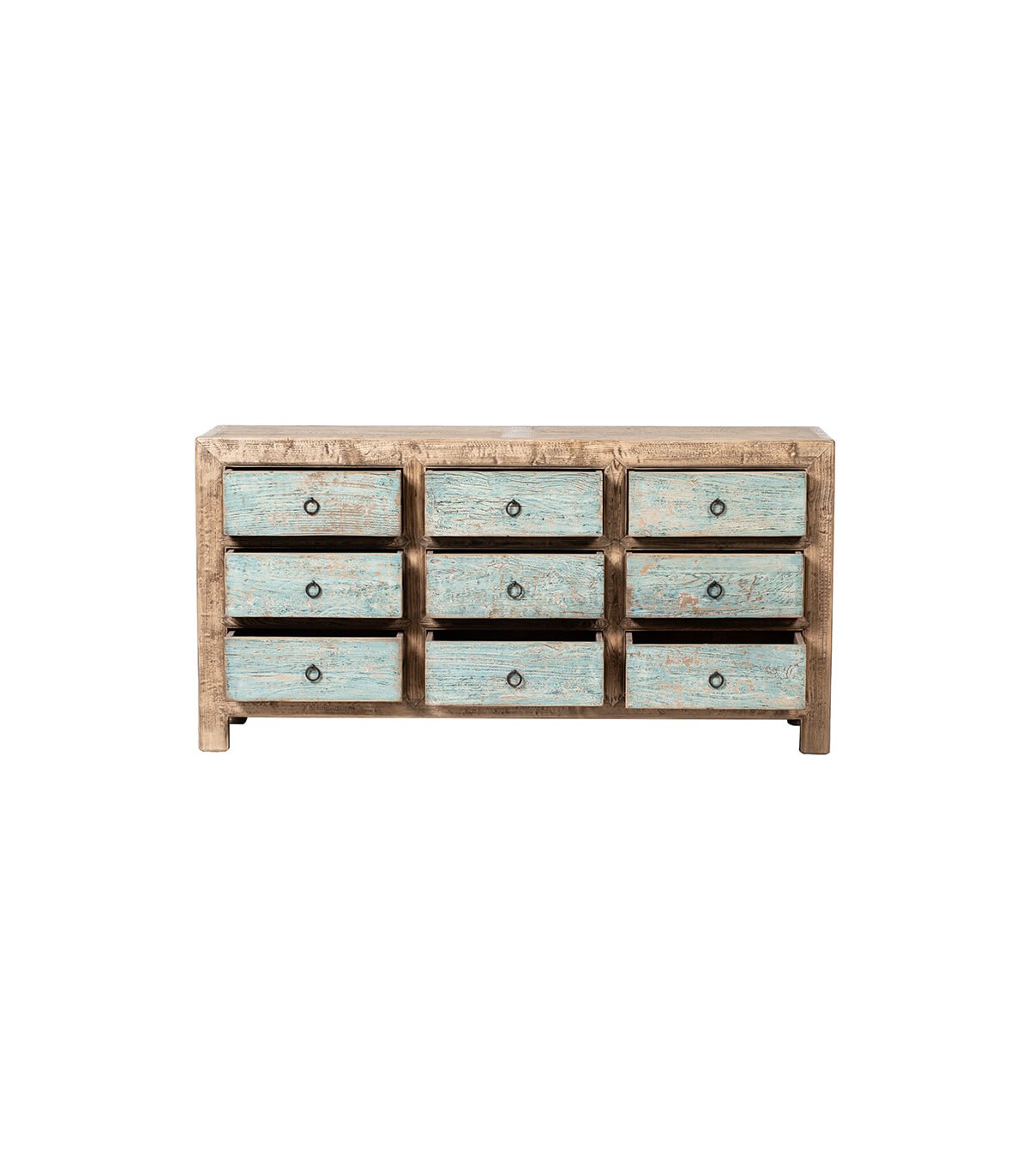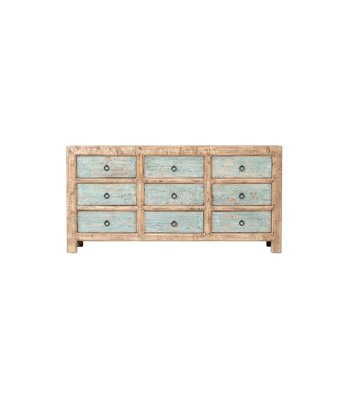 Cómoda de estilo oriental, una cómoda de grandes dimensiones y gran capacidad, combina el acabado natural con el decapado en azul que le da el toque justo de color, una cómoda elegante y majestuosa.