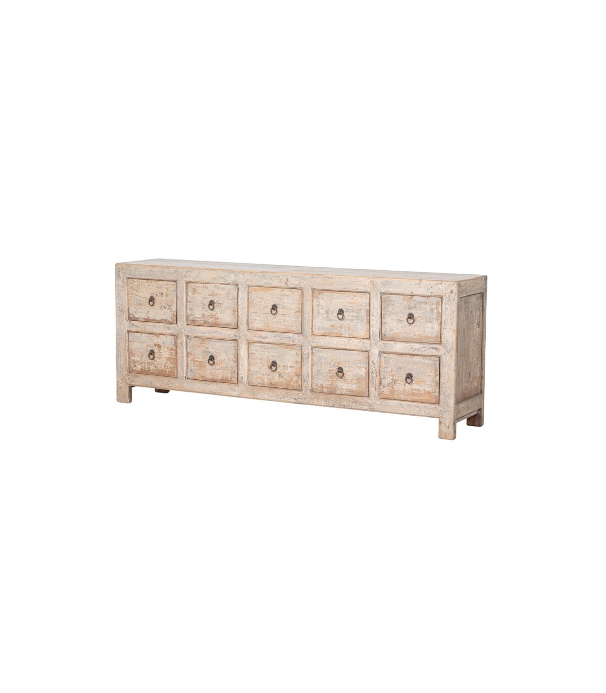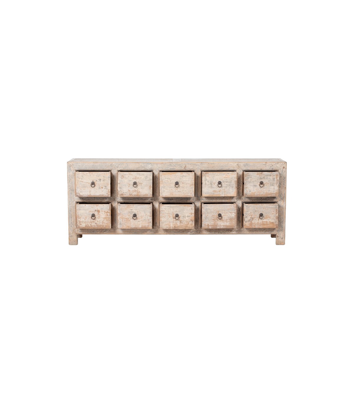 Descubre la elegancia y funcionalidad de esta cómoda extragrande con 10 cajones, ideal para aportar un toque oriental y rústico a cualquier estancia. Fabricada en madera maciza de pino, su acabado en madera natural con un sutil decapado en gris y negro le otorga un carácter único. Tiradores en bronce para un toque vintage refinado.