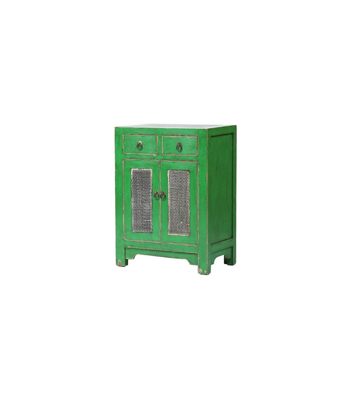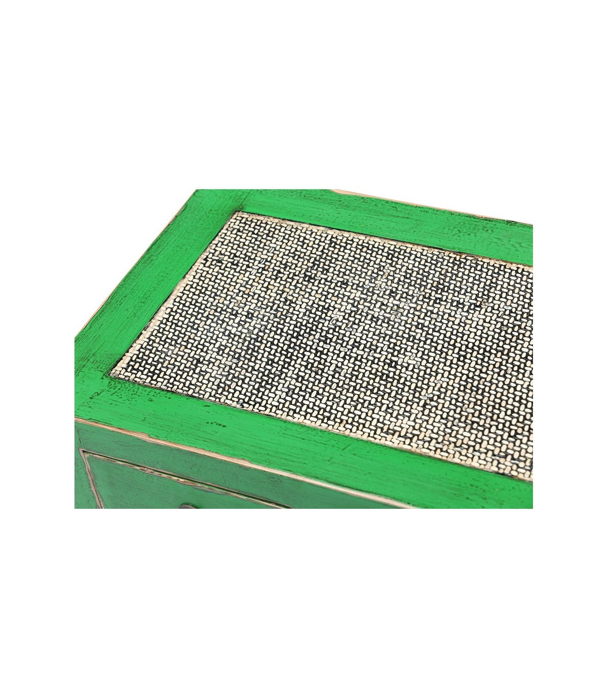 Acabado, cuerpo verde, interior natural, frentes de puertas y tapa en ratan natural patinado en negro.