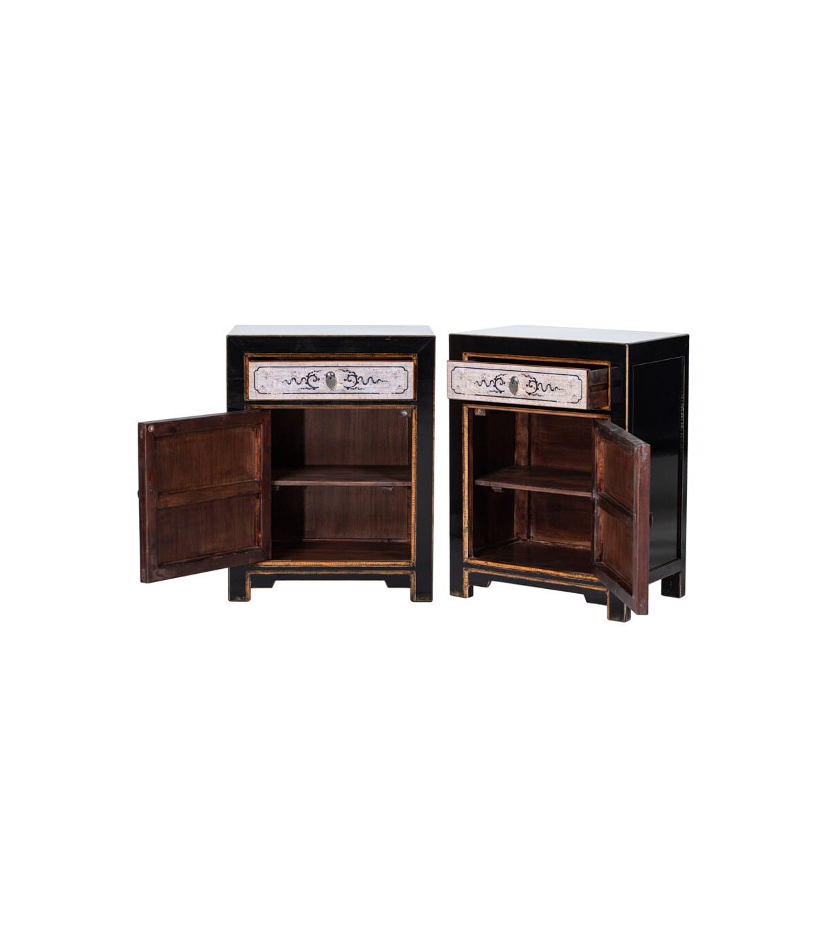 Aporta un toque de elegancia oriental y artesanía a tu dormitorio con este exclusivo conjunto de 2 mesitas de noche inseparables, fabricadas en madera maciza de pino. Su diseño destaca por su acabado lacado artesanal multicolor, con detalles pintados a mano que reflejan la tradición y el arte decorativo oriental.