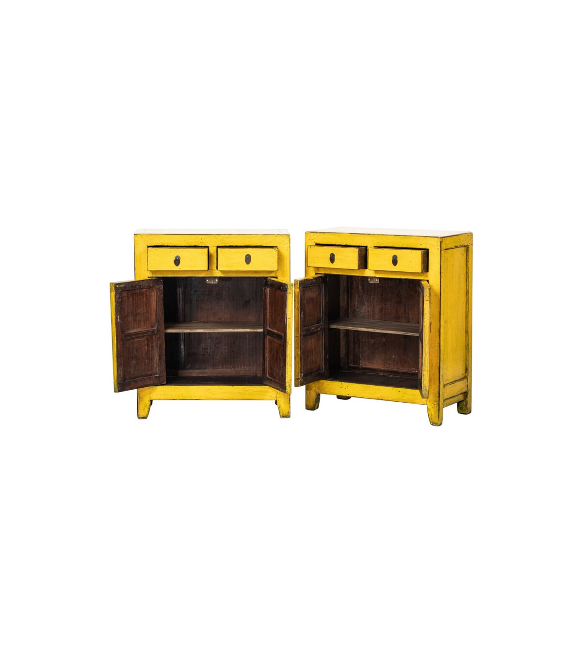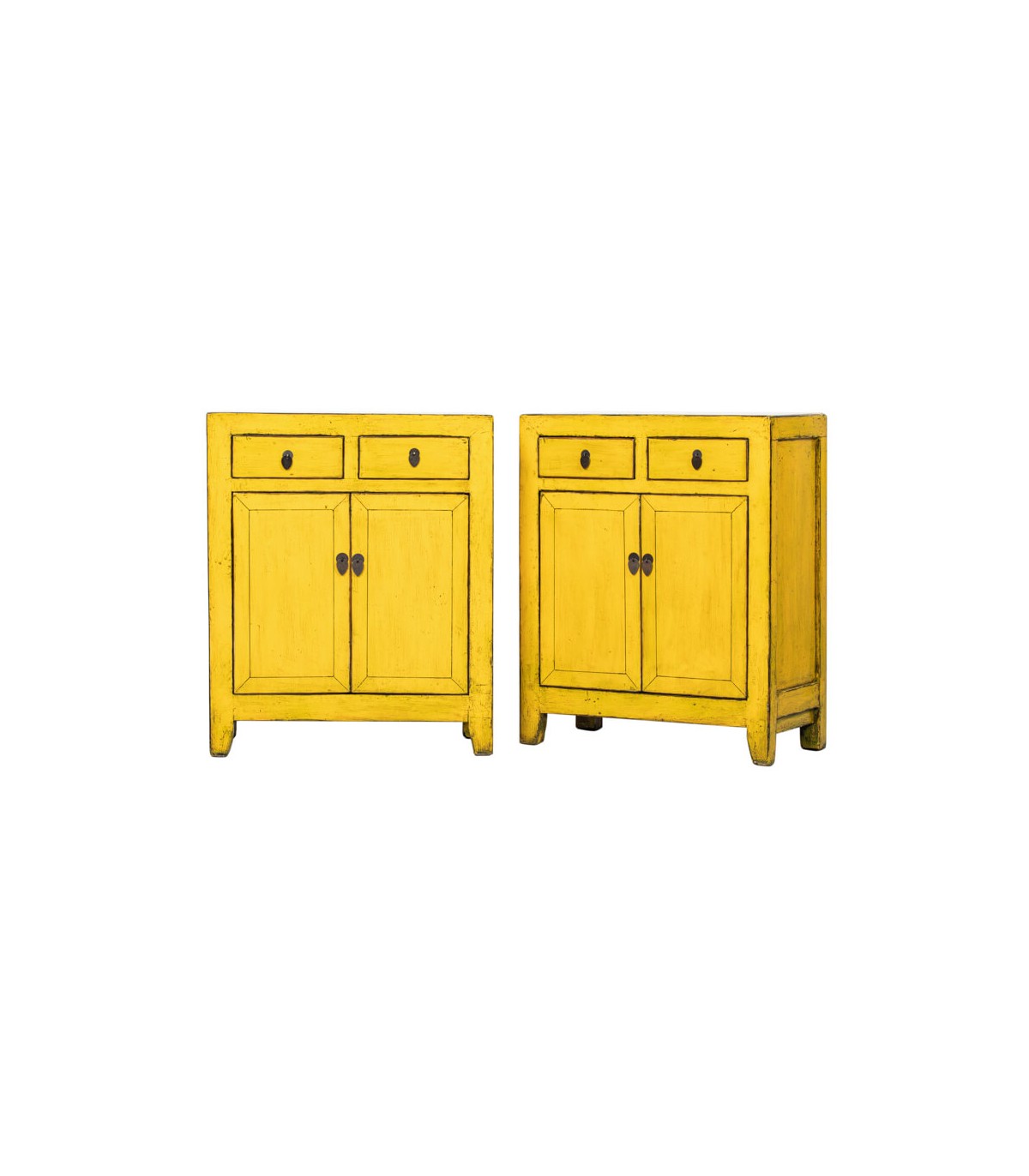 Llena de vida y personalidad tus espacios con este conjunto inseparable de 2 mesitas de noche XXL, elaboradas en sólida madera maciza de pino y lacadas artesanalmente en vibrante amarillo. Cada pieza, con dos cajones superiores y dos puertas, ofrece un generoso espacio de almacenamiento, combinando funcionalidad y un carácter estético muy especial.