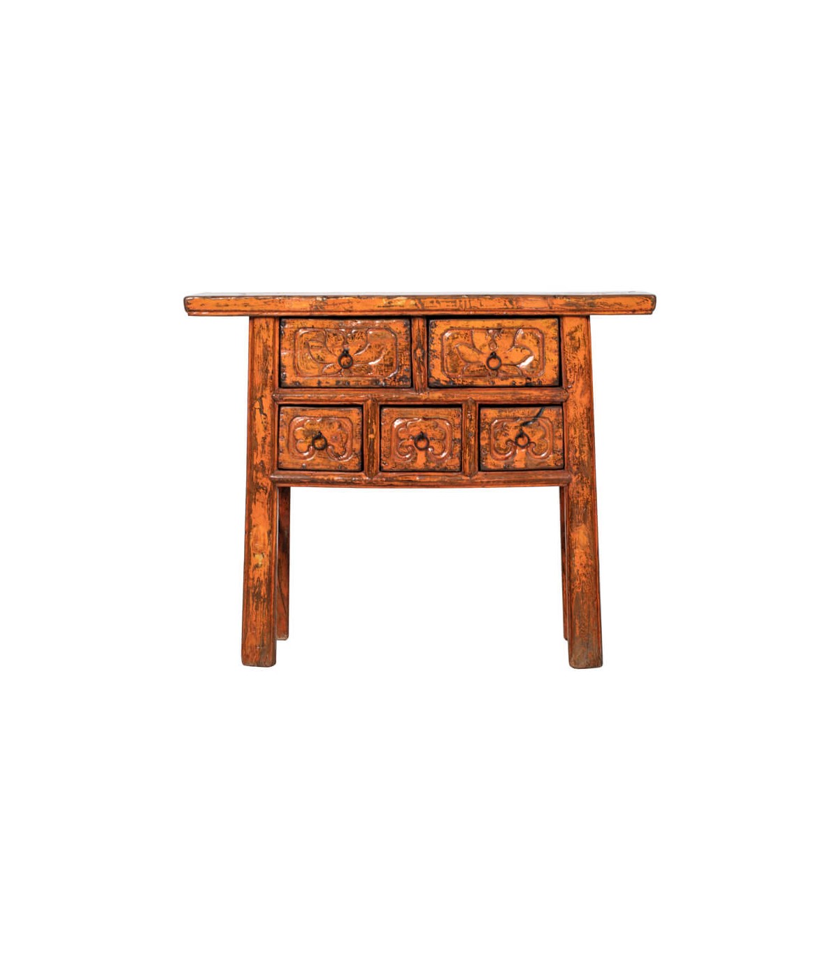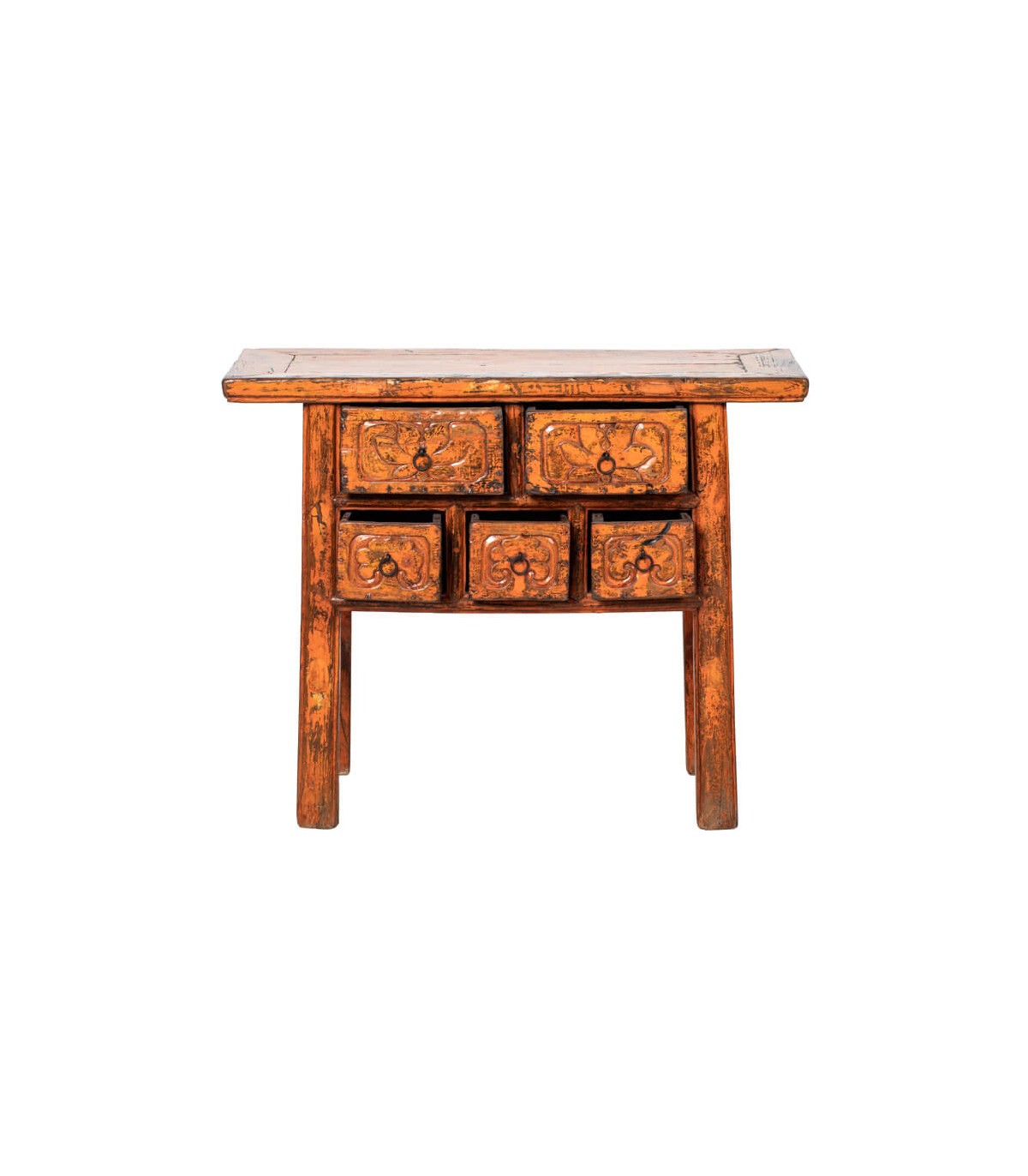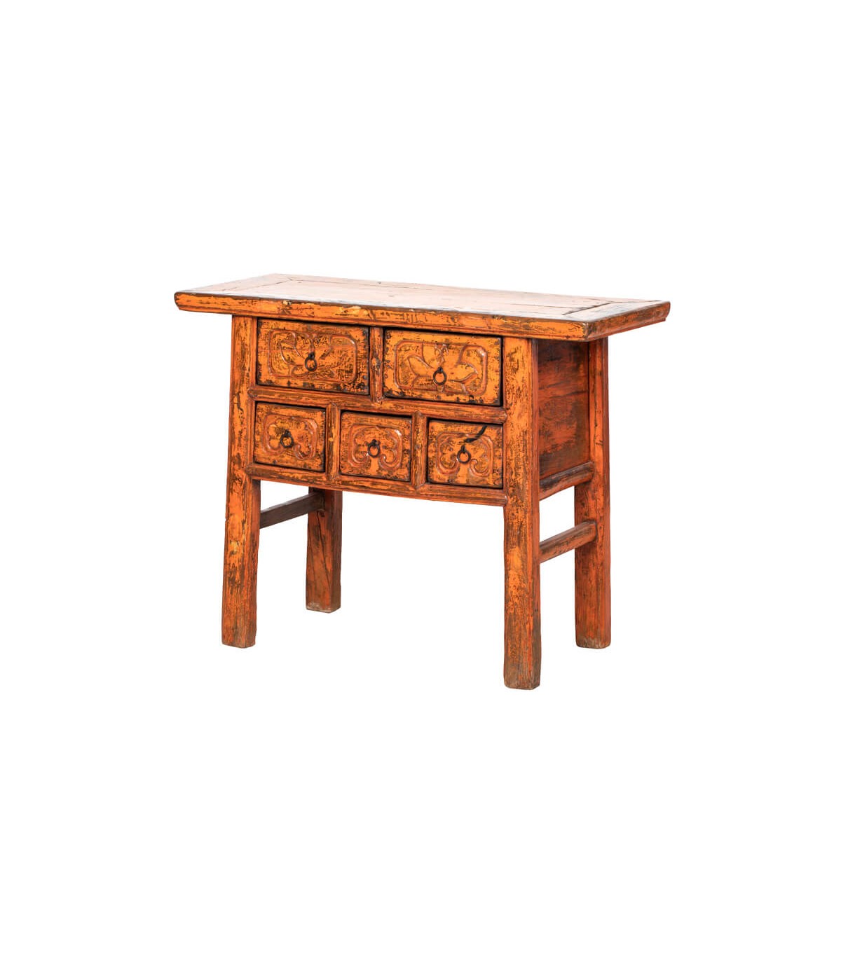 Esta consola de entrada es una auténtica joya del mobiliario oriental con 80 años de antigüedad. Su estructura en madera maciza de olmo conserva el carácter y la pátina del paso del tiempo, mientras los cinco cajones tallados aportan funcionalidad y encanto. El acabado en naranja satinado y los tiradores metálicos de bronce a juego refuerzan su personalidad vibrante, perfecta para interiores con alma y piezas únicas llenas de historia.