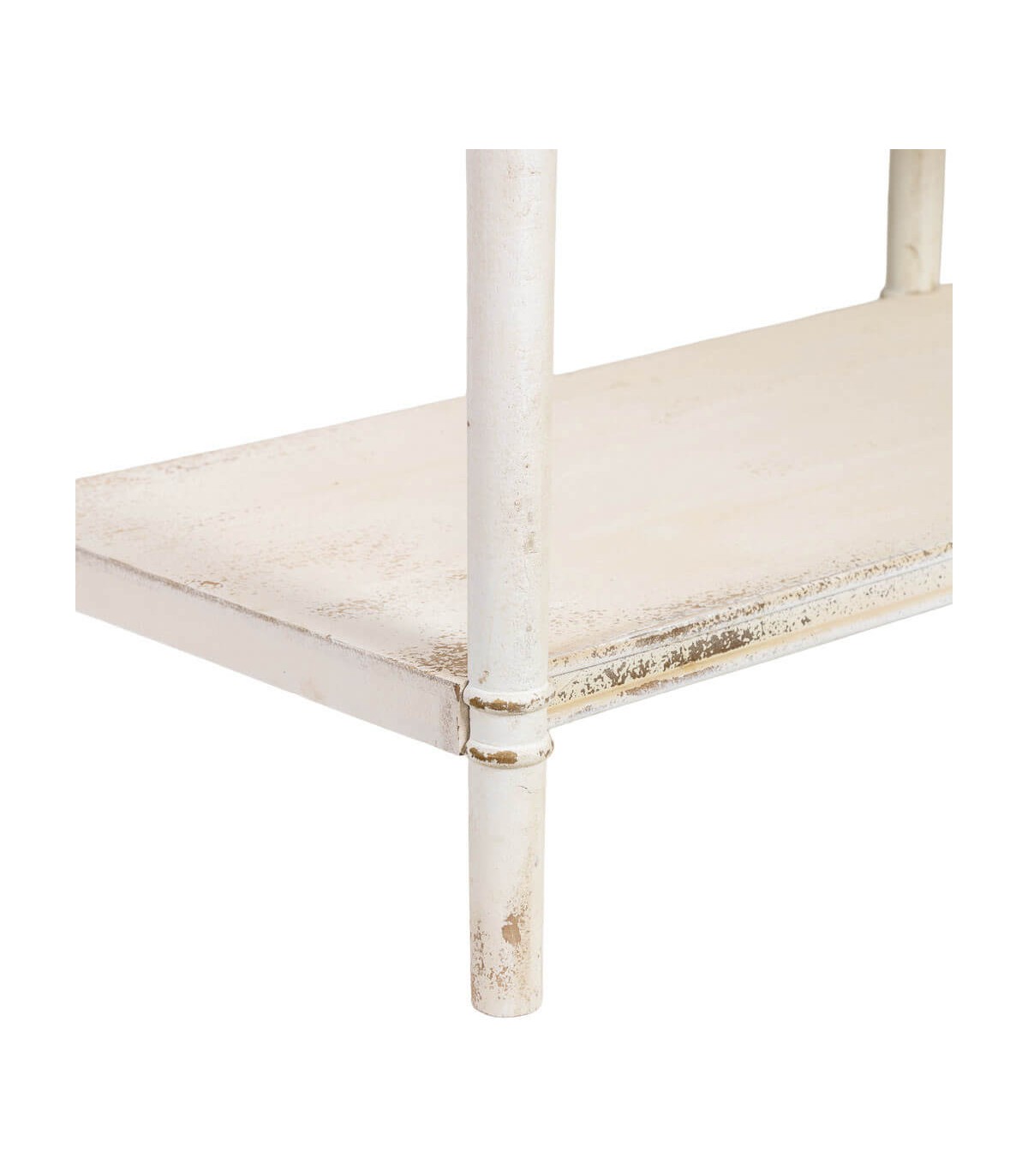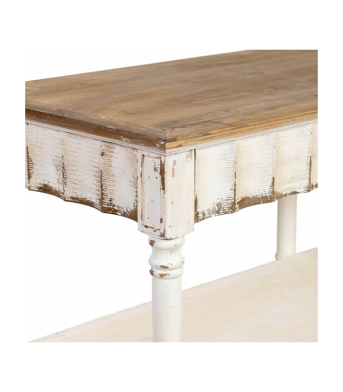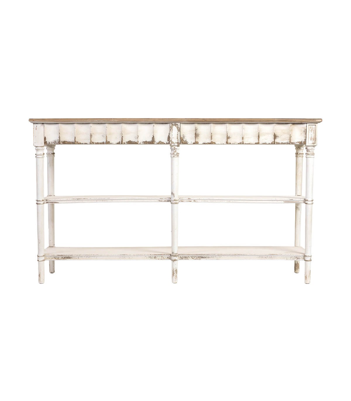 El cuerpo tallado y el acabado blanco envejecido revelan un carácter atemporal que aporta luminosidad y una elegancia ligera a cualquier entrada. Sus estantes amplios permiten colocar cestas, libros u objetos decorativos con comodidad y claridad visual, creando una sensación de armonía y orden. Las patas torneadas refuerzan su aire tradicional.