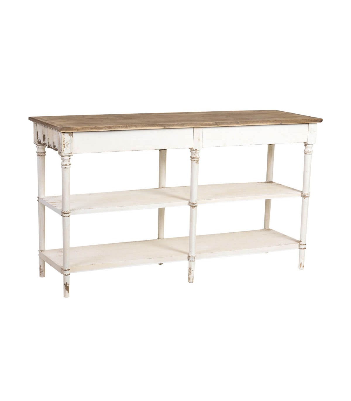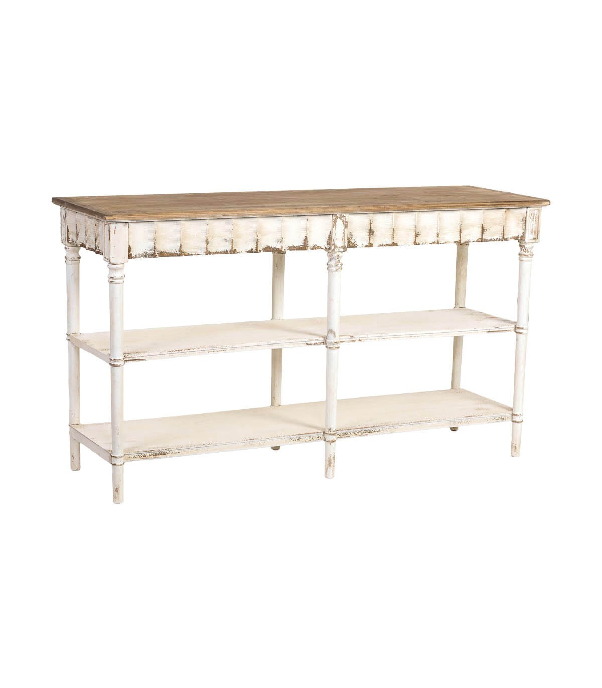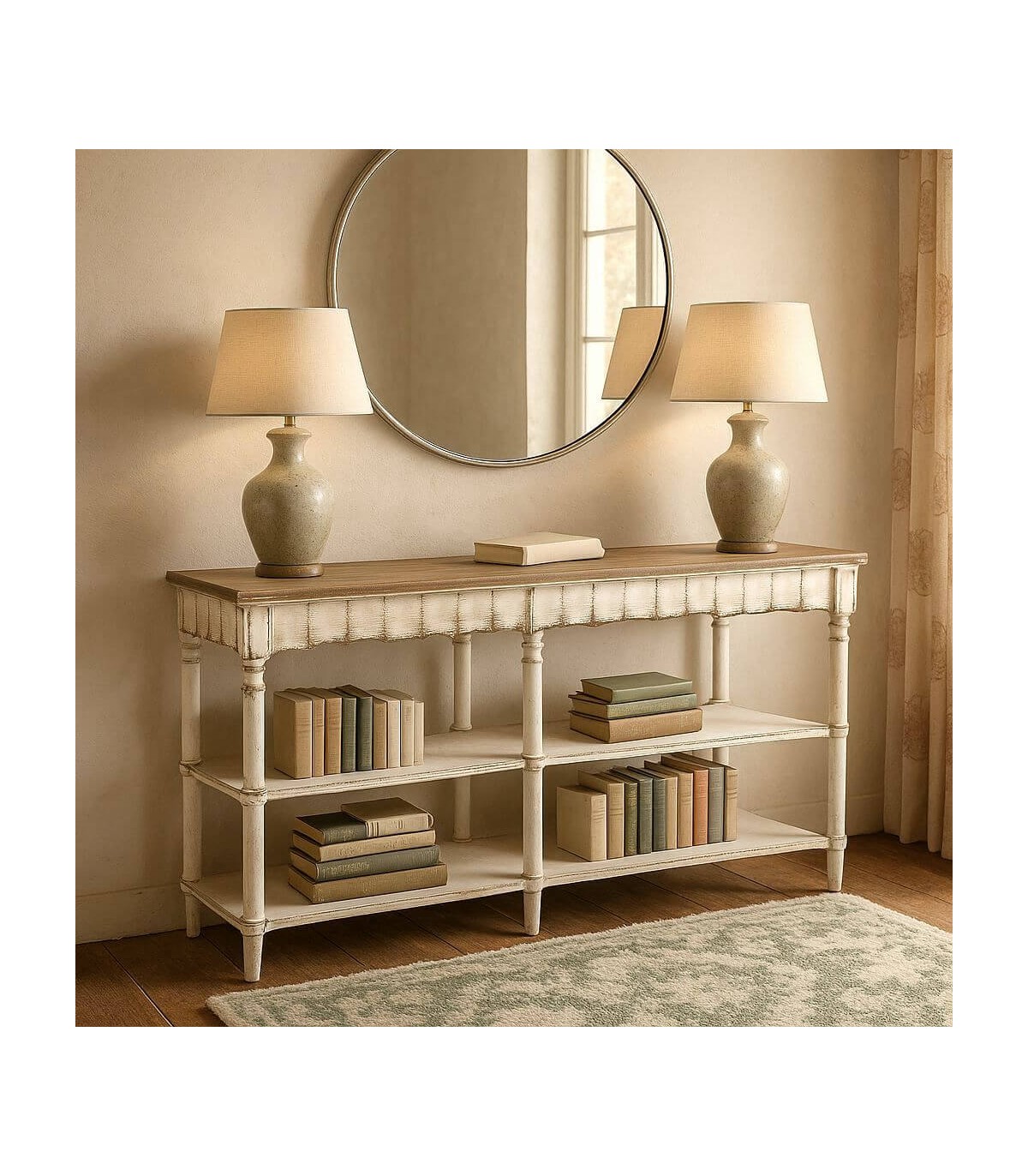 El cuerpo tallado y el acabado blanco envejecido revelan un carácter atemporal que aporta luminosidad y una elegancia ligera a cualquier entrada. Sus estantes amplios permiten colocar cestas, libros u objetos decorativos con comodidad y claridad visual, creando una sensación de armonía y orden. Las patas torneadas refuerzan su aire tradicional.