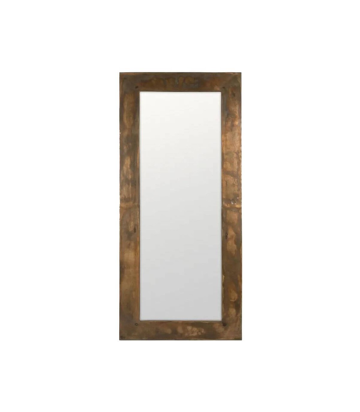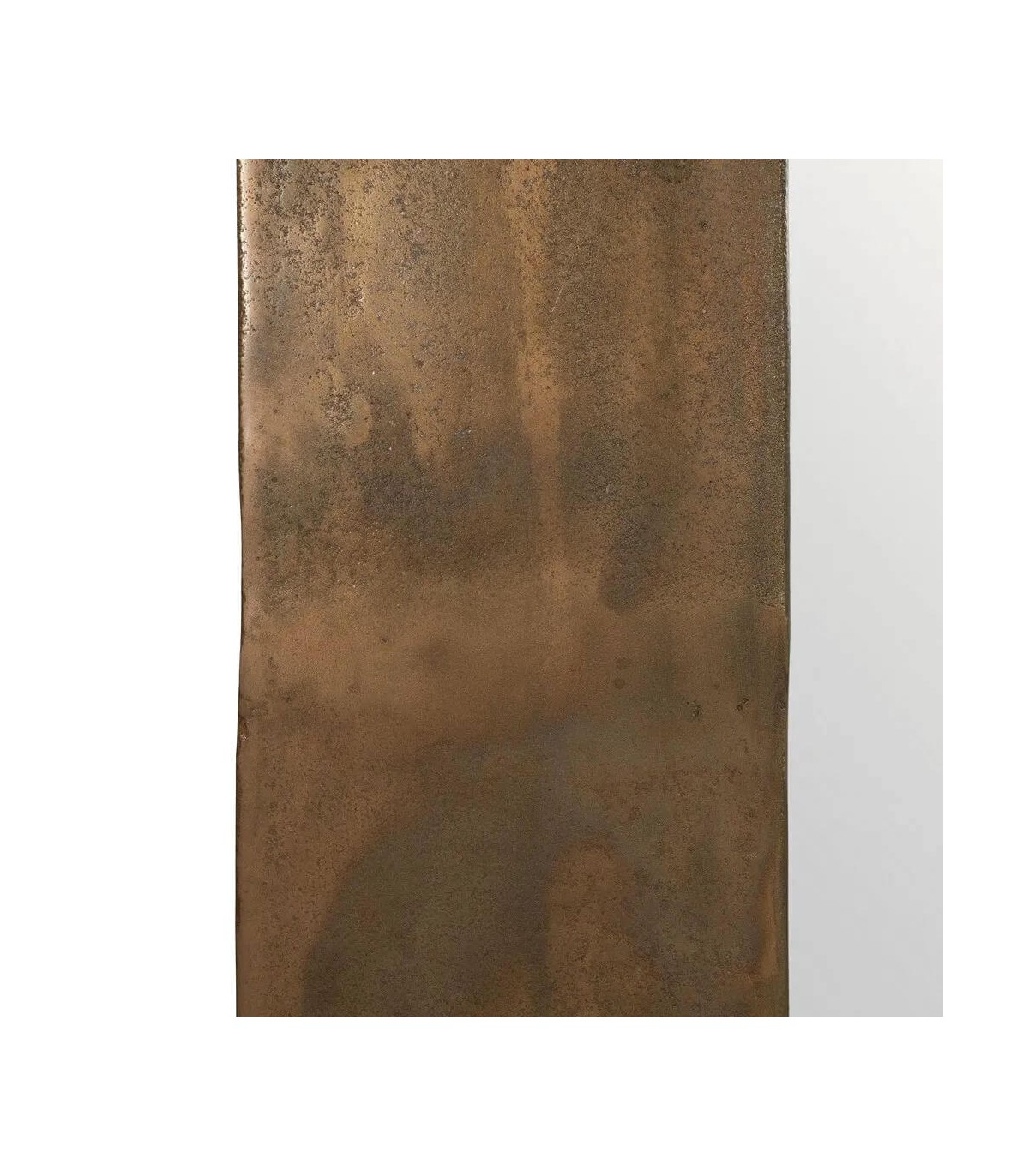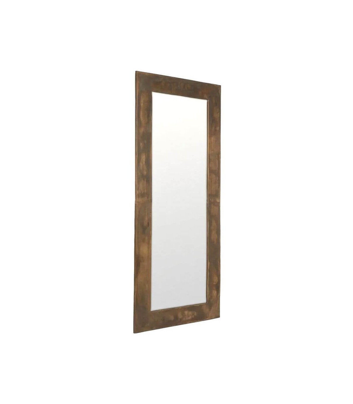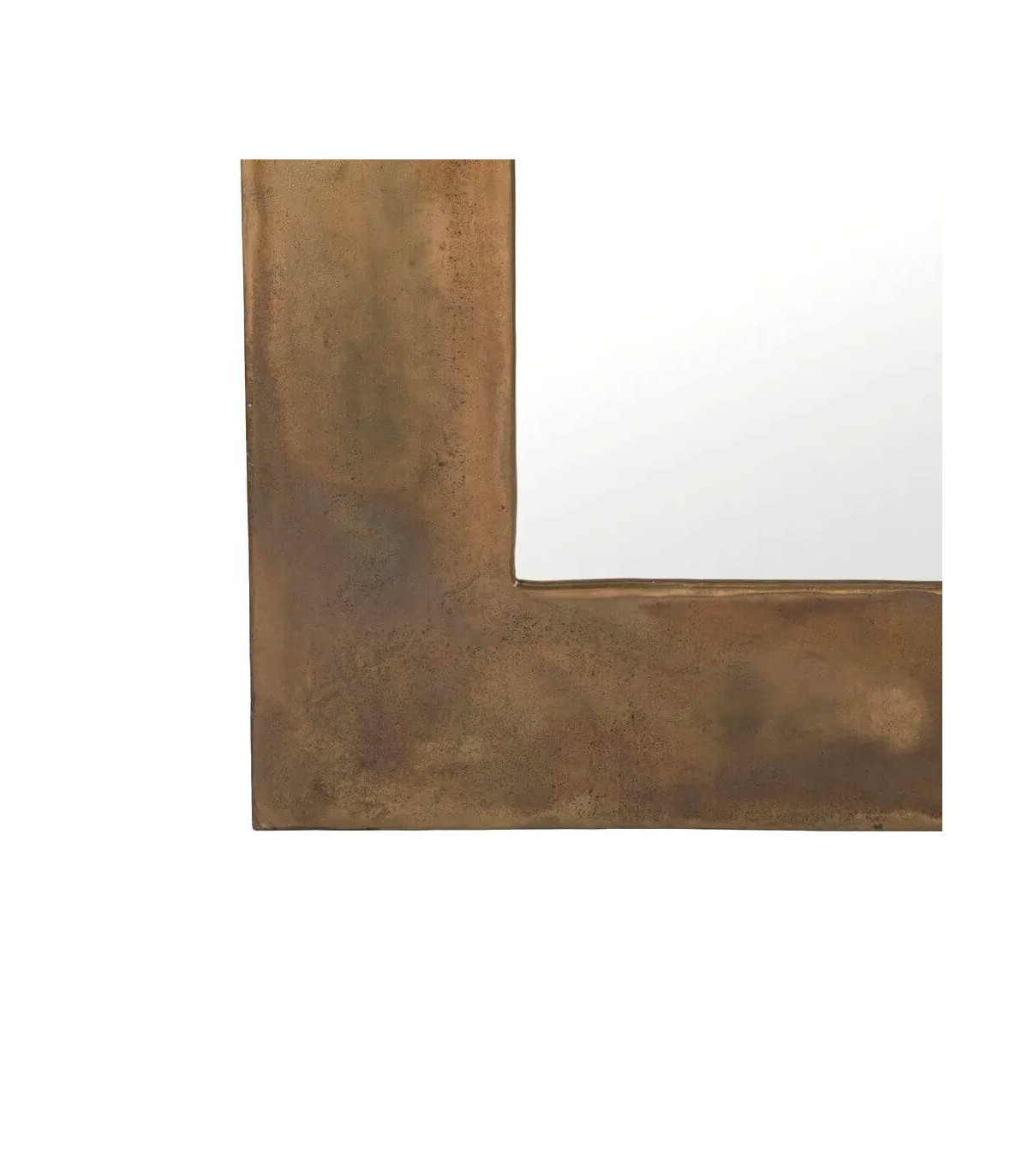 Este imponente espejo de gran formato destaca por su estructura de aluminio con acabado en oro viejo, trabajado artesanalmente para ofrecer un aspecto envejecido lleno de personalidad. Su diseño minimalista con marco ancho y textura irregular lo convierte en una pieza clave para espacios contemporáneos, industriales o eclécticos.
