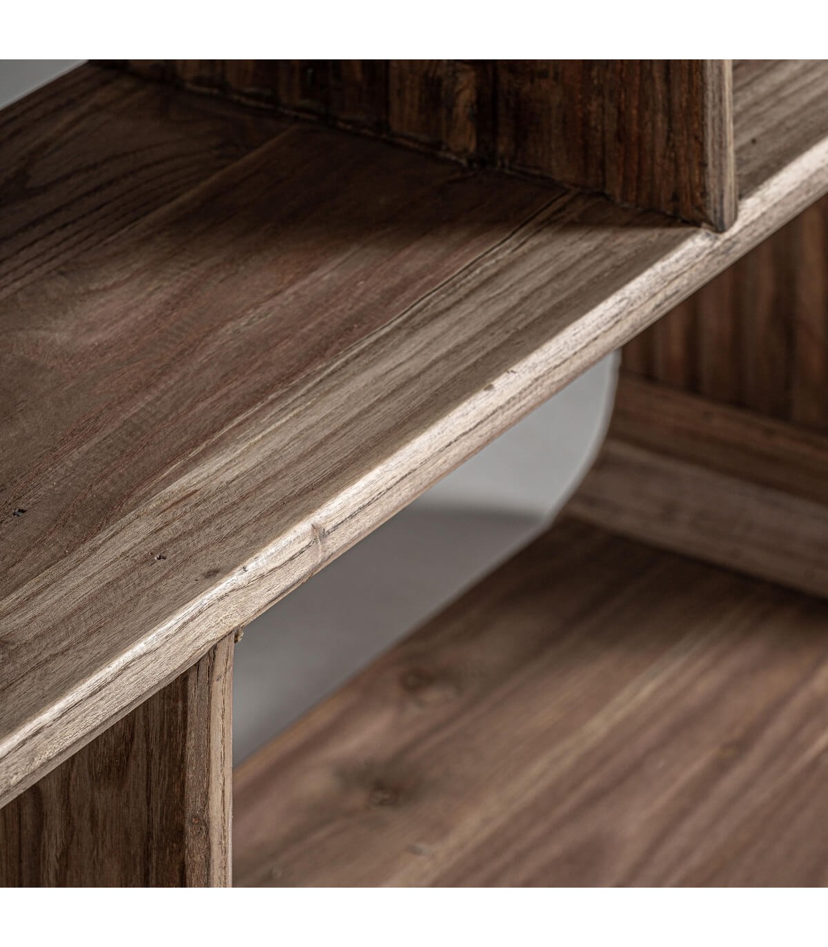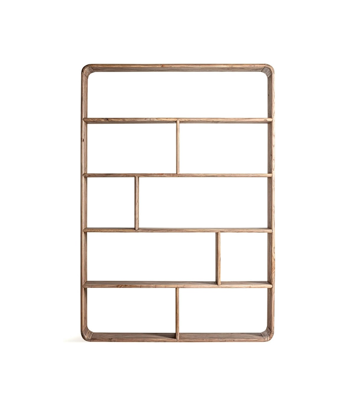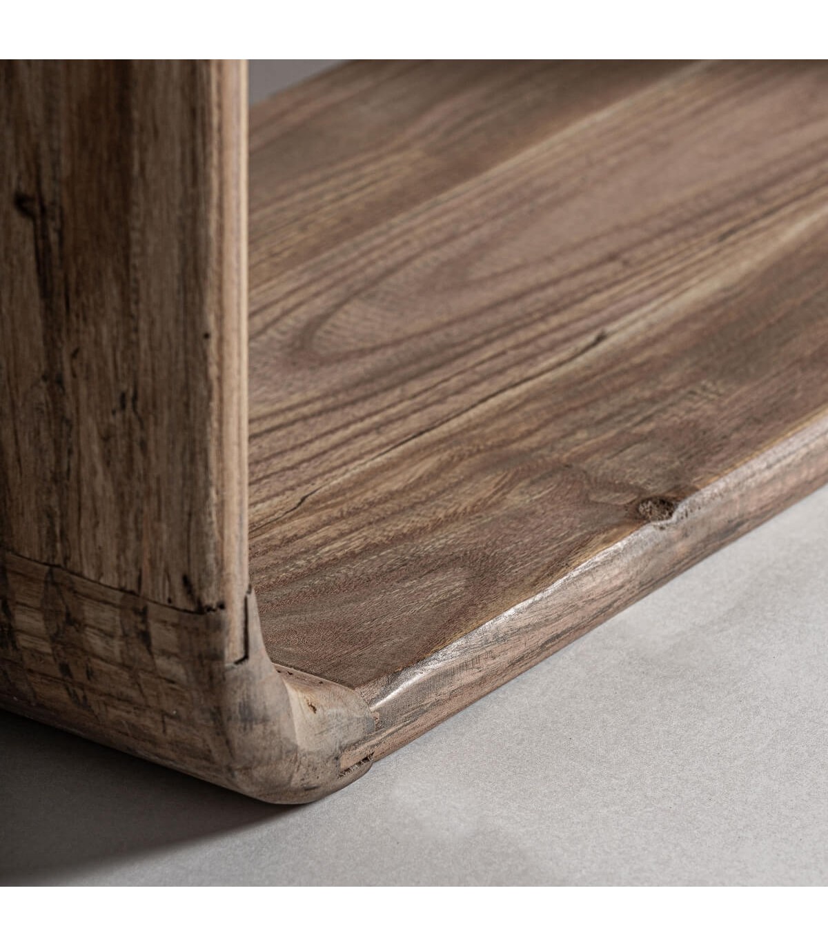 Una estantería que combina sostenibilidad y elegancia artesanal. Fabricada en madera de olmo reciclada, esta pieza aporta calidez y textura gracias a sus vetas marcadas y acabado natural. Su diseño simétrico con huecos de distintos tamaños permite colocar libros, jarrones o elementos decorativos, adaptándose a múltiples estilos decorativos.