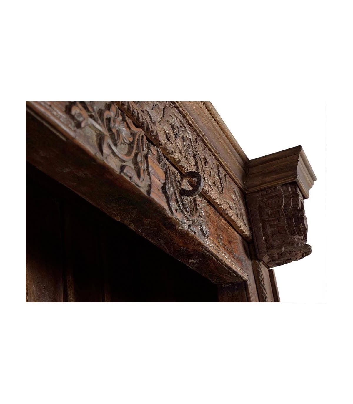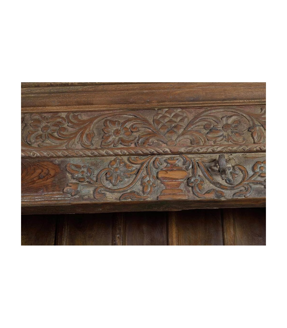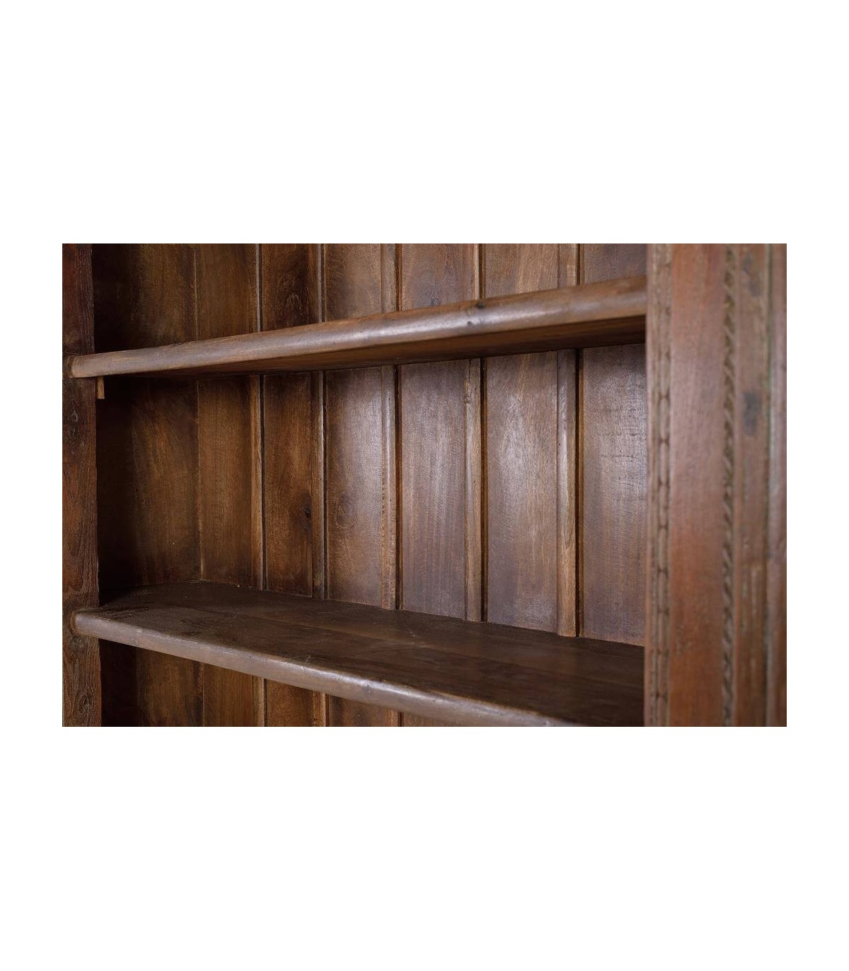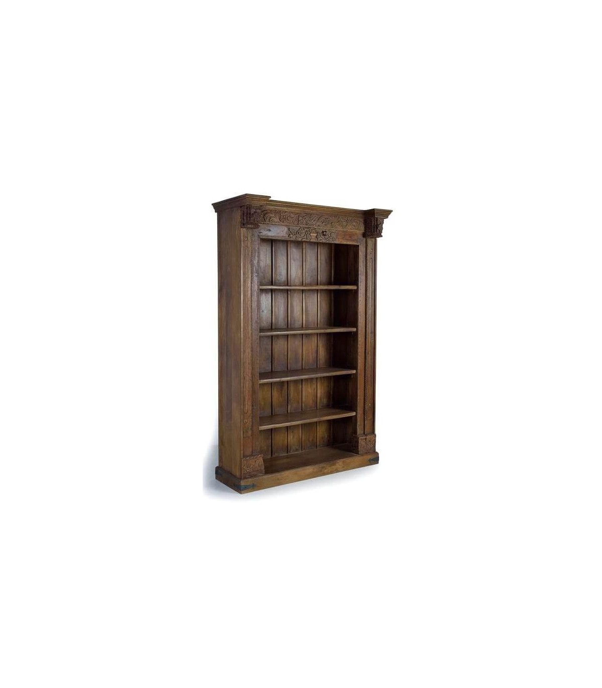 Añade personalidad y fuerza decorativa a cualquier ambiente con esta estantería étnica de gran formato. Tallada a mano en madera maciza de mango reciclada, cada detalle revela el trabajo artesanal y la historia que encierra esta pieza única. Sus columnas y friso están decorados con exquisitos relieves florales, mientras que el aplique en hierro forjado envejecido aporta carácter y un aire tradicional inconfundible.