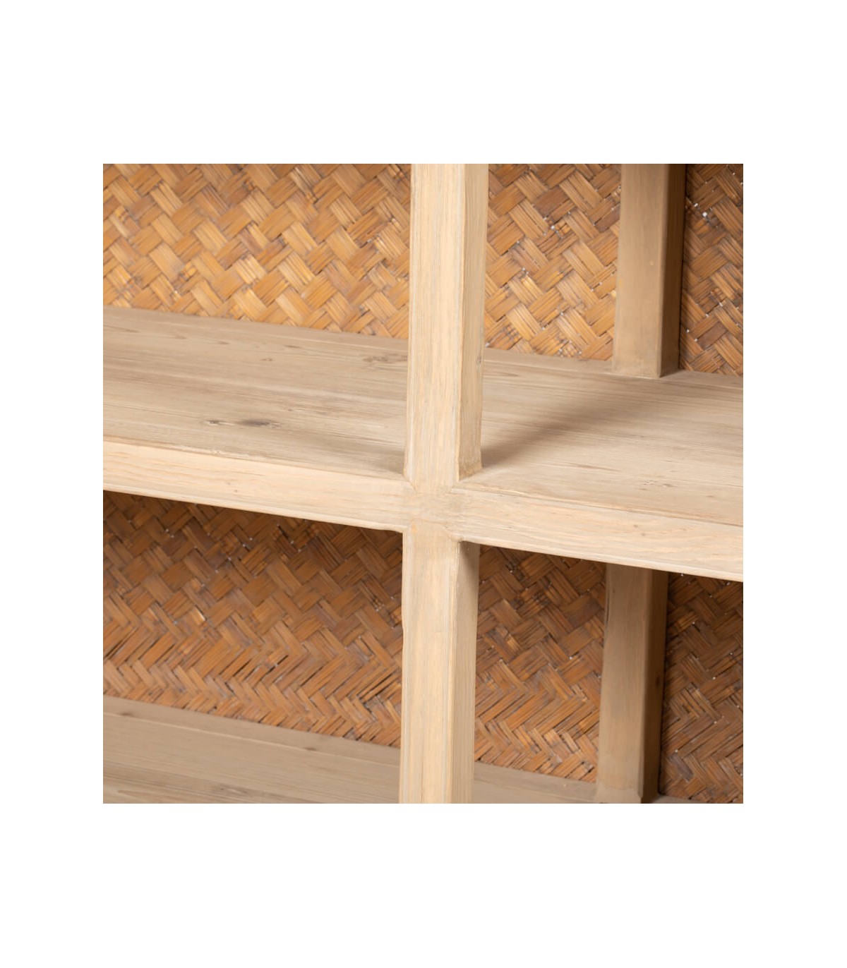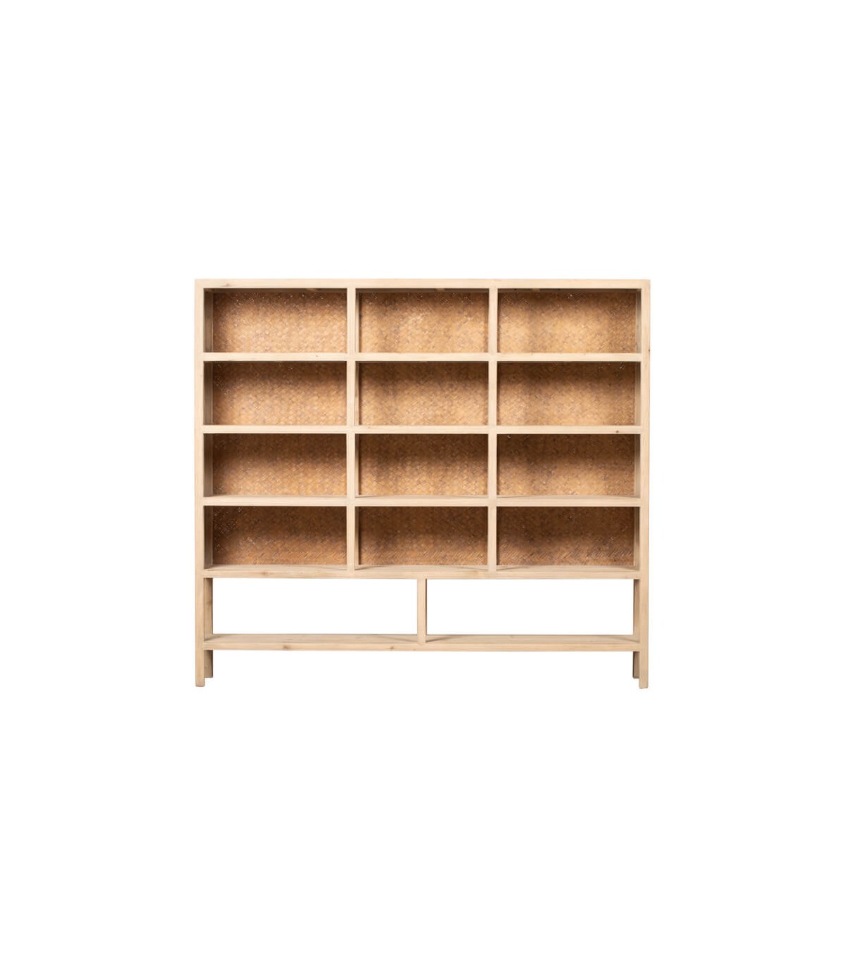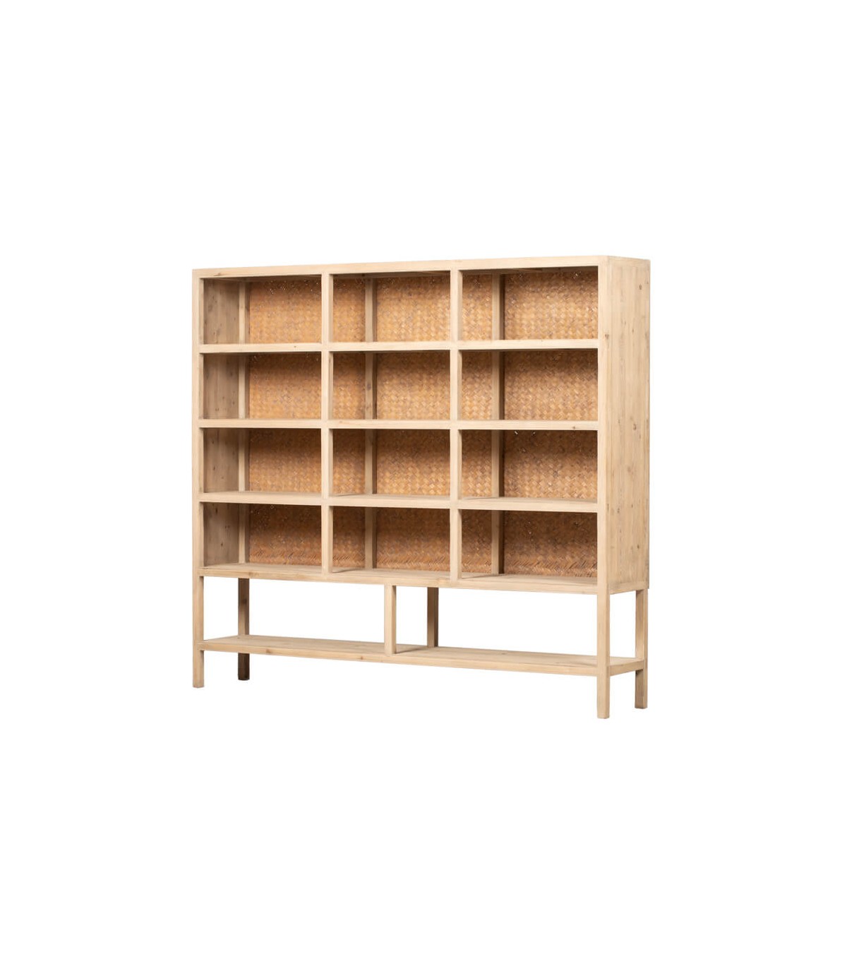 Descubre la elegancia y funcionalidad de esta librería estantería grande, elaborada en madera maciza de pino natural con una exquisita trasera en fibras naturales trenzadas a mano. Su diseño de estilo oriental aporta un aire cálido y sofisticado, convirtiéndola en la pieza perfecta para realzar la decoración de salones, despachos, recibidores o dormitorios.