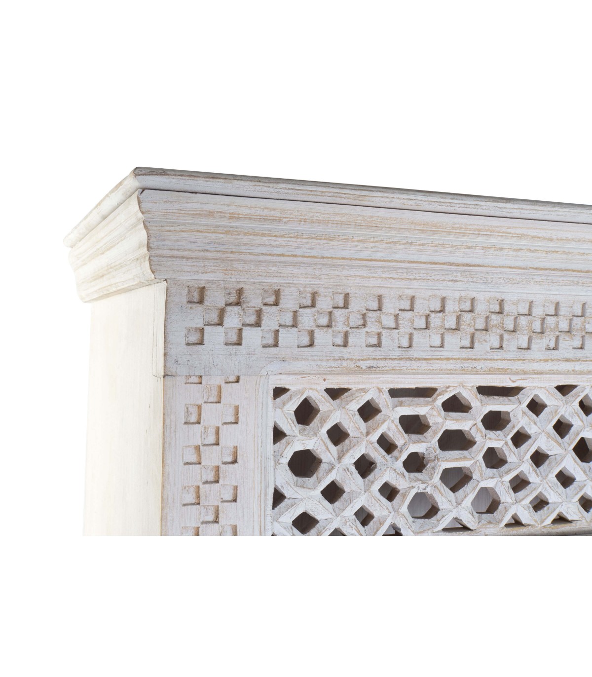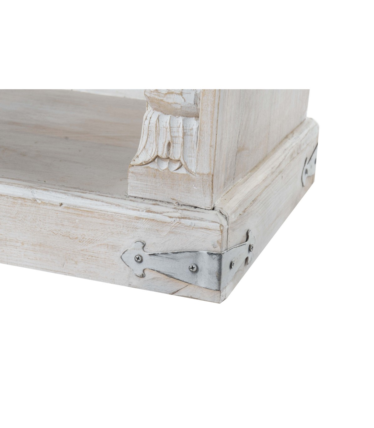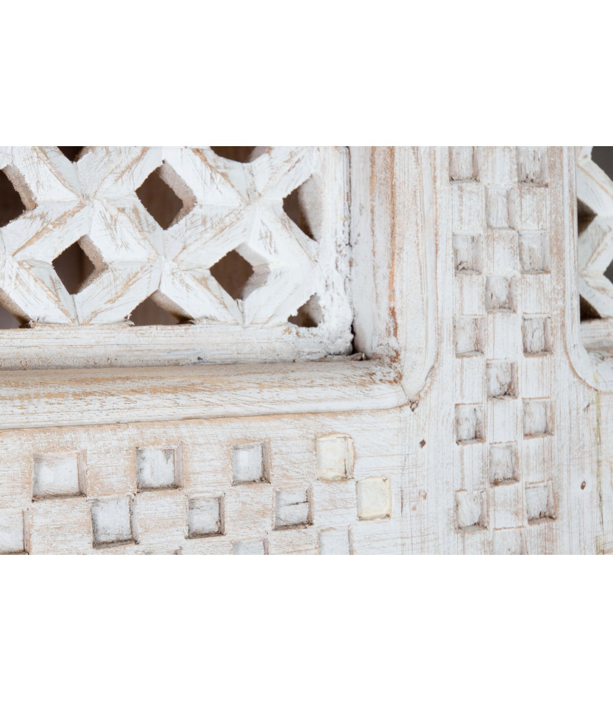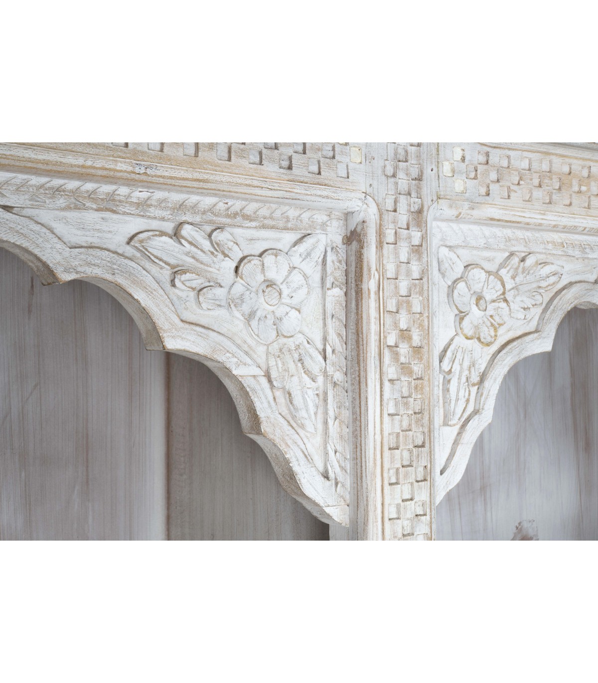 Un mueble imponente y singular que reúne funcionalidad y artesanía en una sola pieza. Esta estantería XL destaca por su diseño de inspiración étnica, con tallas a mano que decoran cada rincón de su estructura. Fabricada en madera maciza de mango, incorpora aplicaciones metálicas y un acabado blanco decapado que realza el volumen de sus relieves.