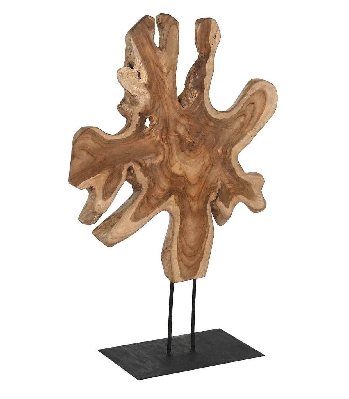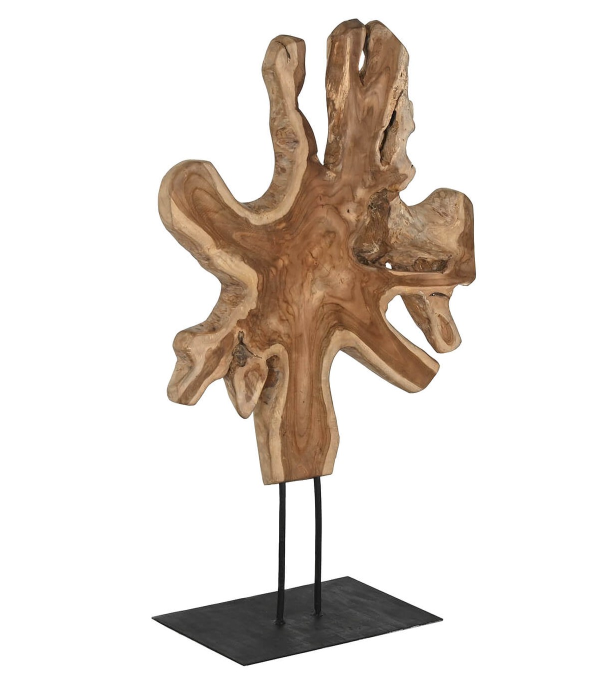 Esta figura decorativa alta es una obra de arte natural, fabricada a partir de un trozo de raíz de teca en su estado original, lo que la convierte en una pieza única e irrepetible. Su diseño rústico y orgánico aporta un toque de autenticidad a cualquier espacio, realzando la belleza de la madera natural. La base en metal negro proporciona estabilidad y contraste, combinando el estilo rústico con un aire moderno e industrial.