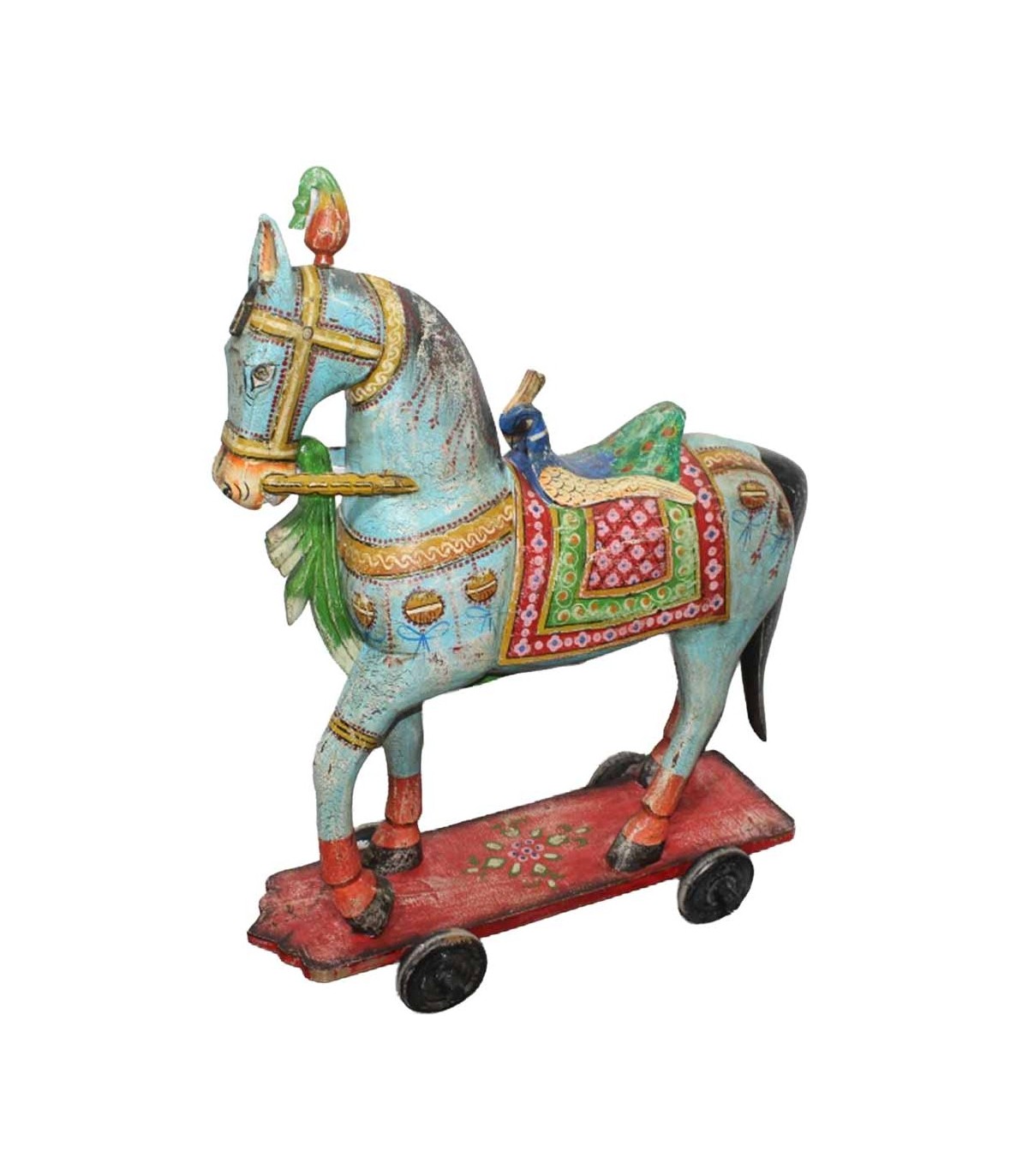 Aporta color y carácter a tu decoración con esta figura decorativa de caballo con ruedas, inspirada en los antiguos juguetes coloniales. Tallada en madera de mango y pintada a mano, cada pieza es única gracias a su acabado policromado envejecido. Los detalles florales y la base con ruedas evocan un aire nostálgico que encaja a la perfección en interiores con alma étnica o viajera.